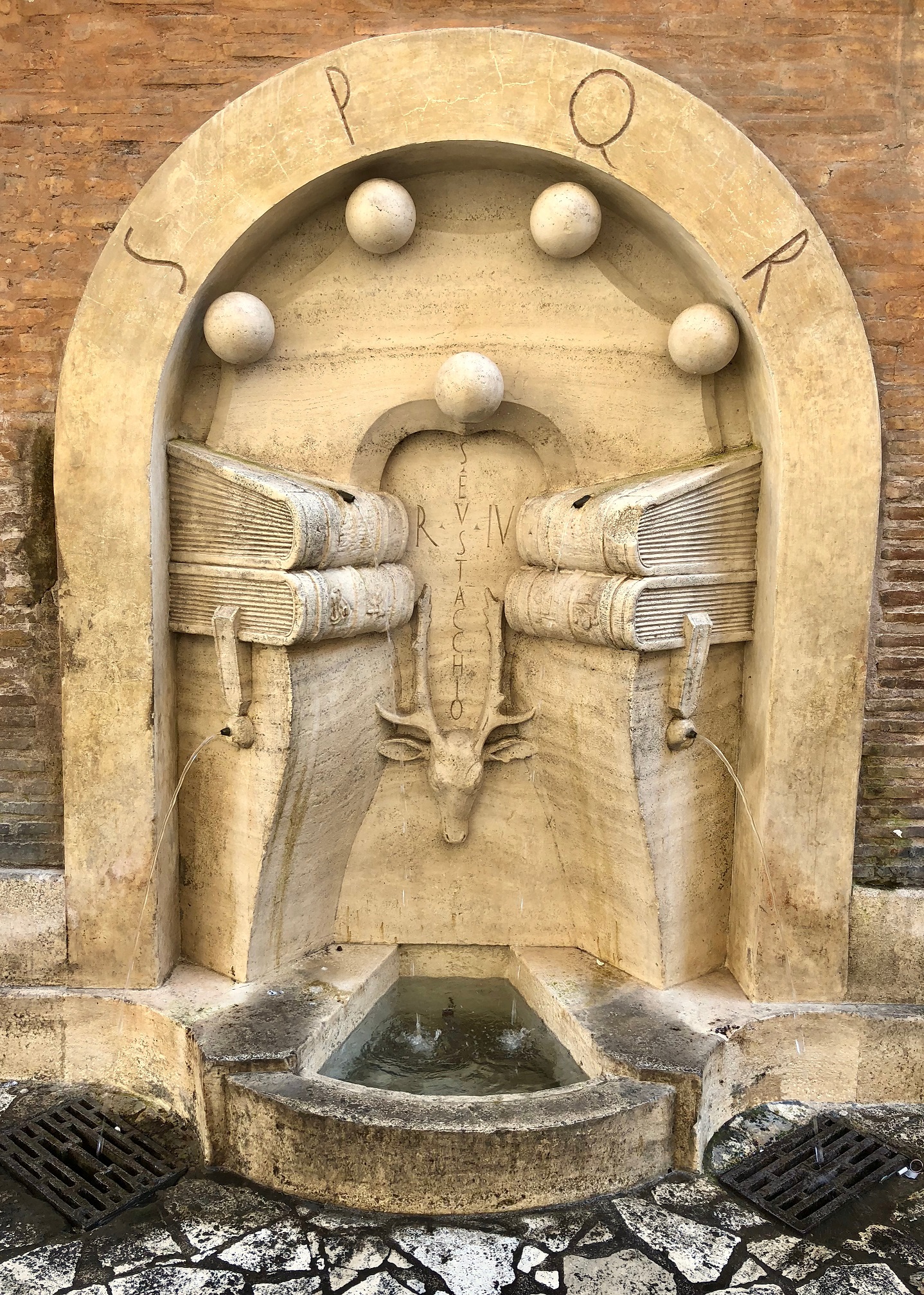 Βγαίνοντας από το Sant’ Ivo στρίψτε αμέσως δεξιά στο στενάκι και δροσιστείτε στο μικρό σιντριβάνι Fontana dei Libri στο πλάι του Palazzo Sapienza, που ενσωματώνει τα δύο σύμβολα της περιοχής: βιβλία ( για το πανεπιστήμιο ) και το κεφάλι ενός ελαφιού ( σύμβολο της περιοχής Sant Eustachio στην οποία βρίσκεστε ). Ο δρόμος θα σας βγάλει στην πλατεία Sant’ Eustachio και στην ομώνυμη εκκλησία. Στο μπαρόκ ανακαινισμένο σχέδιο έχει ενσωματωθεί ένα ρωμανικό καμπαναριό του 12ου αιώνα. Αξίζει να παρατηρήσετε στην κορυφή της πρόσοψης το σύμβολο του Αγίου του οποίου η εκκλησία φέρει το όνομα, ένα ελάφι μ’ένα σταυρό. Ο μύθος λέει ότι ένας Ρωμαίος στρατιώτης παγανιστής είδε σε όραμα καθώς κυνηγούσε ένα σταυρό ανάμεσα στα κέρατα ενός ελαφιού κι έτσι έγινε χριστιανός κι αργότερα μάρτυρας.