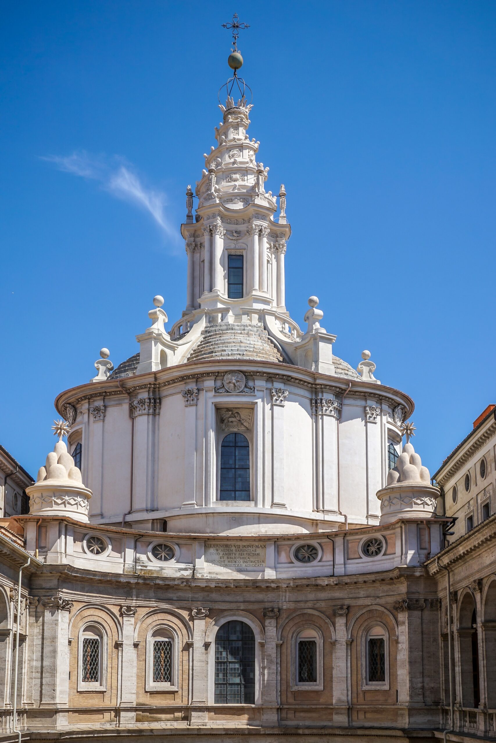 Με δυο βήματα έχετε βγει στην κεντρική αρτηρία Corso del Rinascimento. Περάστε μπροστά από την επιβλητική πρόσοψη του φρουρούμενου Palazzo Madama, που στεγάζει την Ιταλική Γερουσία. Ήρθε η ώρα να κοιτάξετε ψηλά. Θα δείτε ένα περίτεχνο, λευκό, σπειροειδή τρούλο που θυμίζει κεντρί μέλισσας. Είναι το αριστούργημα του Borromini, Sant’ Ivo alla Sapienza, στο γνώριμο ύφος του της ευρηματικής εναλλαγής κοίλων και κυρτών γραμμών. Το κορυφαίο αυτό έργο της μπαρόκ αρχιτεκτονικής βρίσκεται στην αυλή του Palazzo Sapienza, παλιά έδρα του πανεπιστημίου της Ρώμης (Sapienza στα ιταλικά σημαίνει γνώση ). Οι αψιδωτές στοές της αυλής, εκατέρωθεν της εκκλησίας, εντείνουν τη θεατρικότητα του σχεδίου και η κυρτή πρόσοψη ουσιαστικά ενσωματώνει το ναό στο οβάλ σχήμα της αυλής. Η πολύ λιτή στο εσωτερικό εκκλησία ανοίγει για λίγες ώρες, οι οποίες αλλάζουν σε τακτά χρονικά διαστήματα.