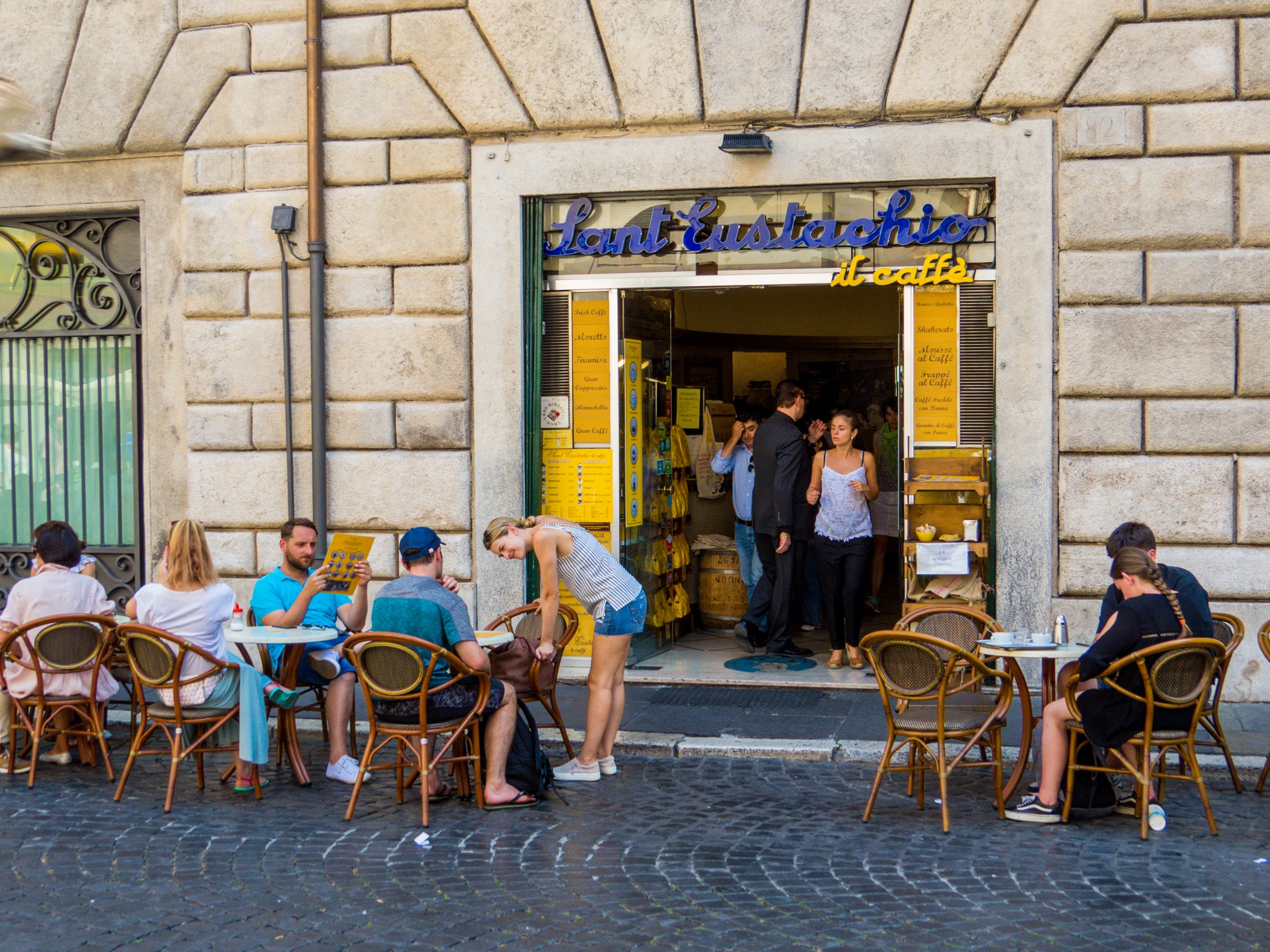 Ύστερα από τρεις εκκλησίες κι αρκετά αριστουργήματα, ήρθε η ώρα για ένα διάλλειμα. Πιάστε ένα από τα περιζήτητα εξωτερικά τραπεζάκια του Sant΄ Eustachio il Café για να απολαύσετε τον καλύτερο cappuccino της Ρώμης. Παραγγείλτε το διάσημο Gran cappuccino ή έναν Gran café κι απολαύστε λίγη απ΄την ανεμελιά της dolce vita χαζεύοντας τα πλήθη που περνούν από την πλατεία και τις ουρές που σχηματίζονται στην είσοδο του μαγαζιού. Εξαιρετικός κι ο καφές tiramisu ή αν έχετε πιο ρομαντική διάθεση ζητήστε έναν Romeo e Giulietta. Μέσα στο καφέ θα βρείτε σκεύη και αξεσουάρ παρασκευής καφέ, κόκκους διαφόρων ποικιλιών για το σπίτι και εξαιρετικά γλυκάκια που συνδυάζουν καφέ με σοκολάτα.