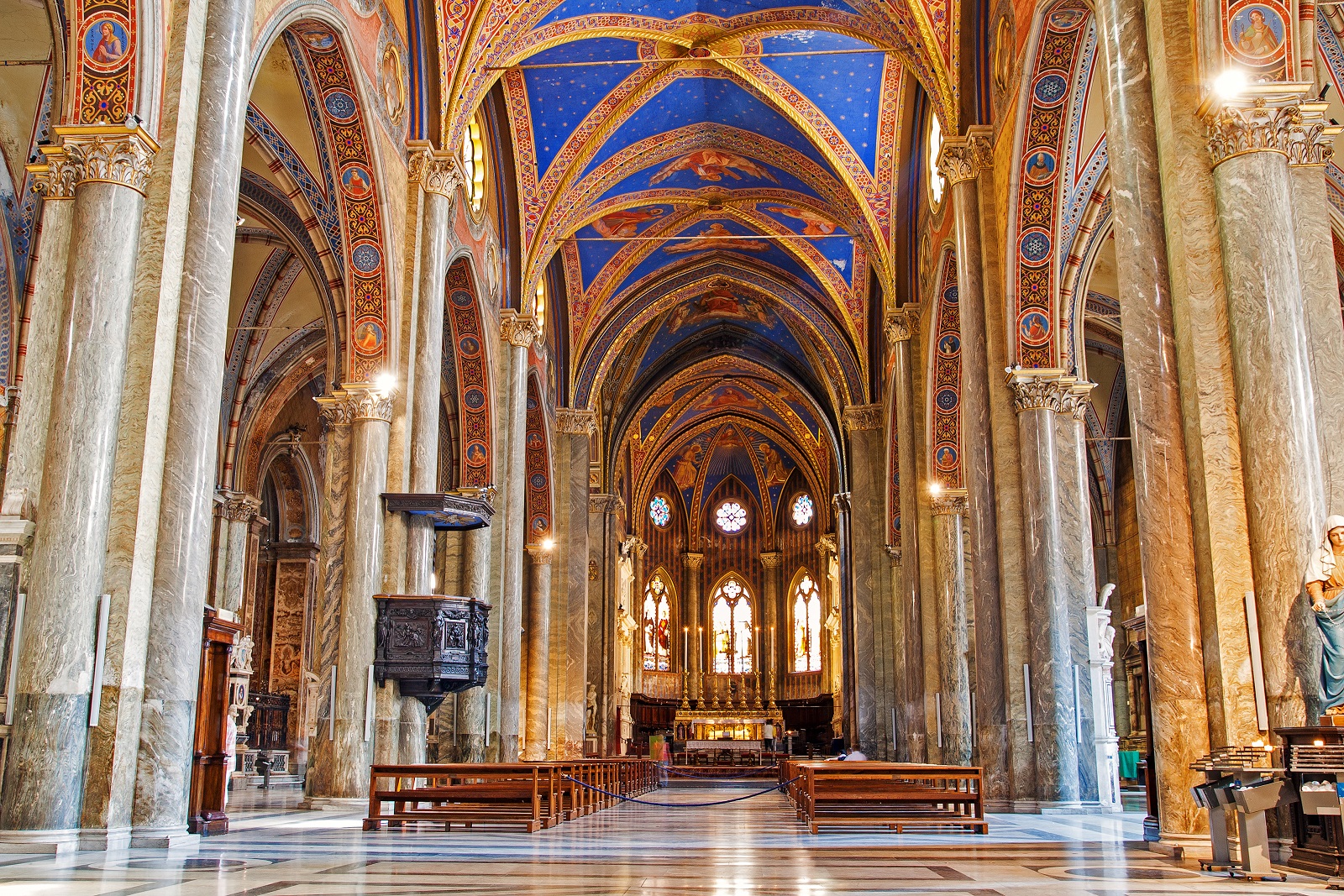 Όμως για μια στιγμή. Γοτθικές αψίδες; Ρόδακες; Στη Ρώμη; Κι όμως ναι. Βρίσκεστε στη μόνη γοτθική εκκλησία της Ρώμης που ωστόσο κάτω από τις μπλε αψίδες είναι γεμάτη αναγεννησιακά μνημεία και τοιχογραφίες. Εδώ υπάρχει το έξοχο γλυπτό «Σωτήρας με το σταυρό» του Μιχαήλ Άγγελου – προσέξτε το φύλλο συκής που προστέθηκε μεταγενέστερα στο άγαλμα για λόγους σεμνότητας. Στο παρεκλήσι Carafa διασώζονται οι πανέμορφες νωπογραφίες του Filippino Lippi με τον Ευαγγελισμό της Παρθένου και την Ανάληψη στους ουρανούς. Η εκκλησία είναι γεμάτη παπικούς τάφους, ενώ εδώ βρίσκεται κι ο τάφος του αναγεννησιακού ζωγράφου Fra Angelico και της Αγ. Αικατερίνης της Σιένα. Παλαιότερα έδρα της Ιεράς Εξέτασης, εδώ ακριβώς αναγκάστηκε ο Γαλιλαίος να ανακαλέσει την άποψή του ότι η γη περιστρέφεται γύρω από τον ήλιο.