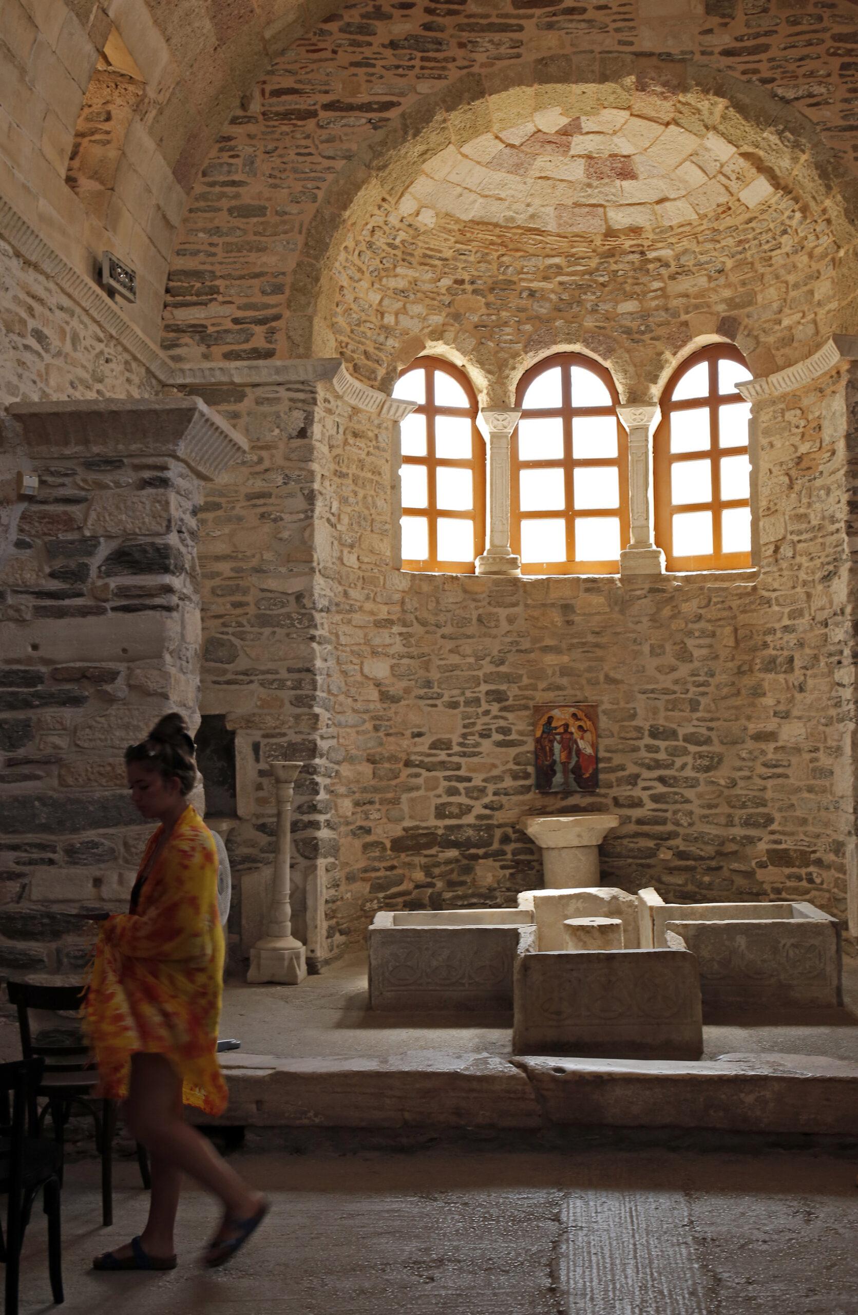 Το επιβλητικό, λευκό, προστατευόμενο σαν φρούριο, κτίριο, αλλάζει με την είσοδο στην αυλή. Πέτρα, χώμα, υπέροχα δέντρα με πηχτή σκιά, διάδρομοι, καμάρες, μικρότεροι ναοί, το Βυζαντινό Μουσείο με σημαντικά εκθέματα, δροσερές γωνιές και «μυστικά» περάσματα, συνθέτουν ένα σκηνικό σχεδόν μυθιστορηματικό. Το αρχιτεκτονικό θαύμα του κυρίως ναού, συμπληρώνεται από το παρακείμενο Βαπτιστήριο, ένα δωμάτιο η ιερότητα του οποίου σαγηνεύει με το πρώτο βήμα μέσα στη δροσιά του. Αλλά και ο Γυναικωνίτης, πετρόκτιστος, στιβαρός και ασφαλής, προσφέρει μια εκπληκτική άποψη του Ναού από ψηλά. Περπατώντας ήσυχα στο πλακόστρωτο προς την έξοδο, συλλαμβάνοντας με την άκρη του ματιού το αθόρυβο ανέμισμα του ράσου ενός κληρικού καθώς κινείται αθόρυβα, νιώθει κανείς πως μόλις ολοκλήρωσε μια όμορφη και πολύ σημαντική επίσκεψη στον κόσμο της εσωτερικότητας και της γαλήνης.