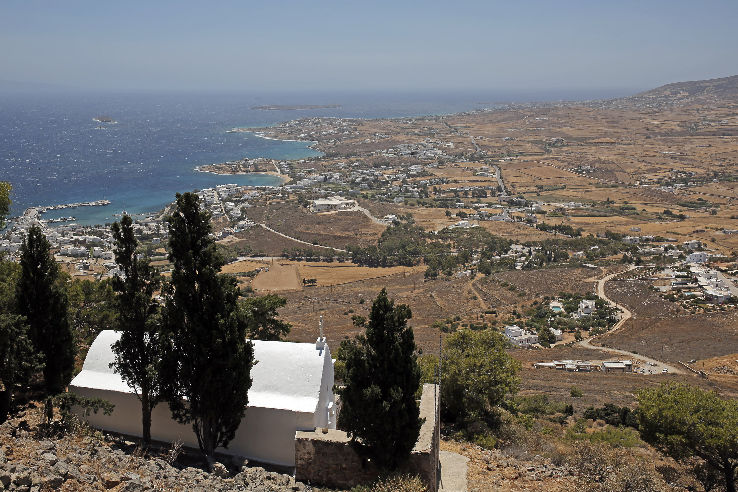 Η άλλη θέα, αυτή προς το εσωτερικό του νησιού, από την κορυφή του λόφου, είναι ένα υπέροχο χωροταξικό ταξίδι στα χωριά και τους οικισμούς της Πάρου, τη Μάρπησσα, τον Πρόδρομο, τα Μάρμαρα αλλά και πιο νότια, προς τους δαντελωτούς φυσικούς κόλπους στο Πίσω Λιβάδι, τη διάσημη Χρυσή Ακτή αλλά και το Δρυό. Το βλέμμα ταξιδεύει και το υψόμετρο μικραίνει τις αποστάσεις.