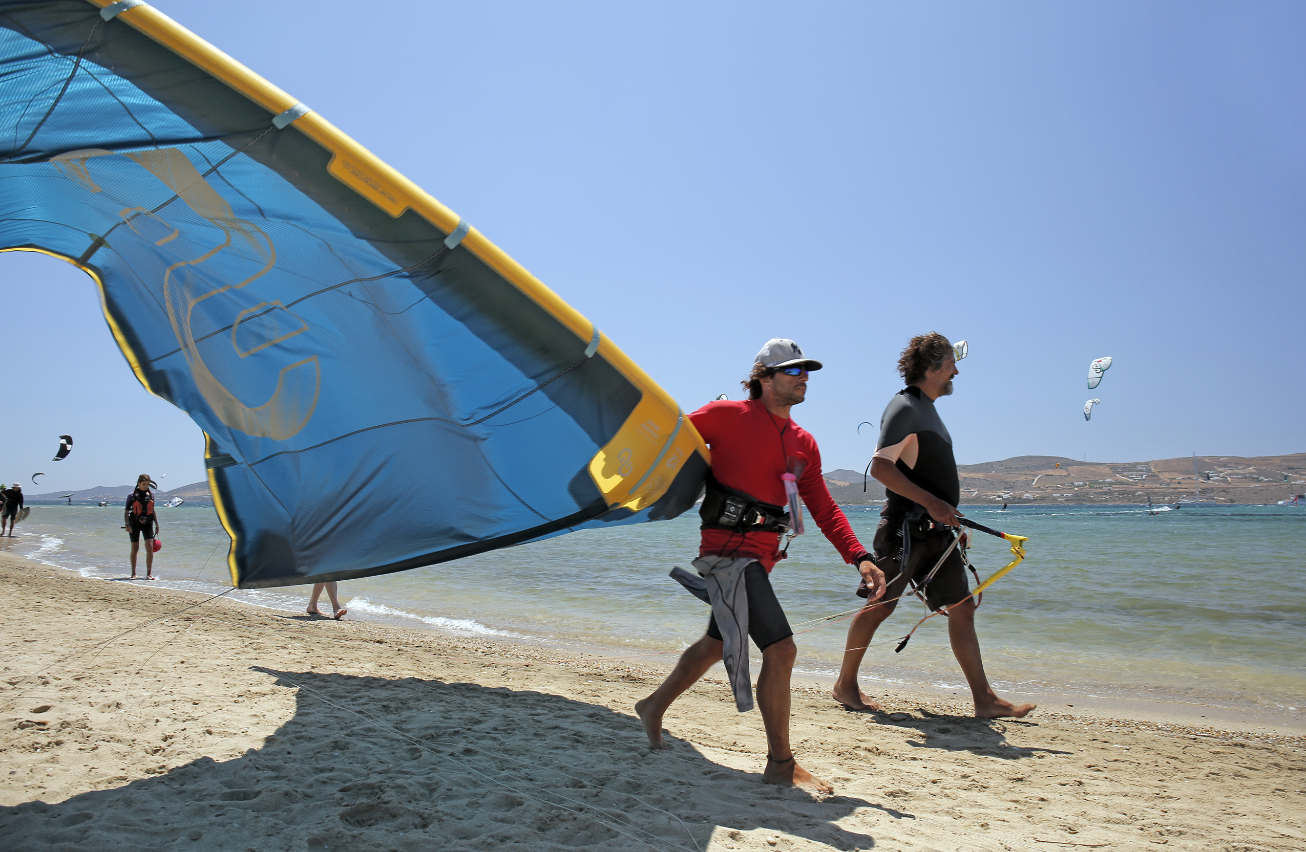 Στην ακτή της Πούντας, στον κλειστό κόλπο που χωρίζει την Πάρο από την Αντίπαρο, δεκάδες χρωματιστά πανιά με «αόρατους» σπάγγους σχίζουν τον γαλανό ουρανό με τους kite surfers από, κυριολεκτικά, κάθε γωνιά του πλανήτη, να αφήνουν τον αφρισμένο δρόμο τους πίσω από τη σανίδα τους. Αθλητισμός, θάλασσα, καυτός ήλιος, δυο νησιά, μια Βαβέλ πολύγλωσση, μια ανοιχτή πρόσκληση, δε νομίζω πως υπάρχει πιο ταιριαστή, τελευταία εικόνα πριν αναχωρήσω από την όμορφη Πάρο.