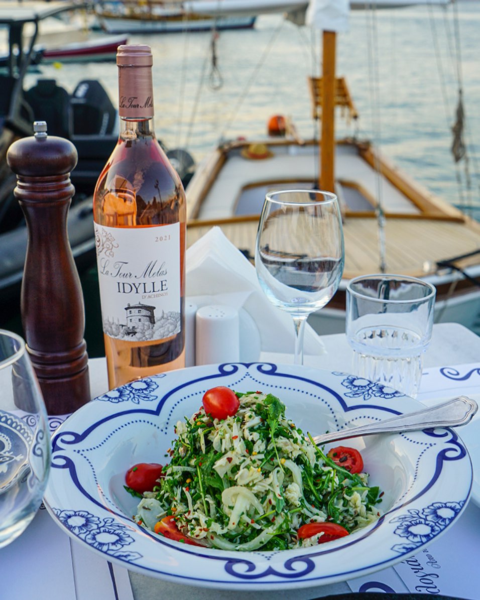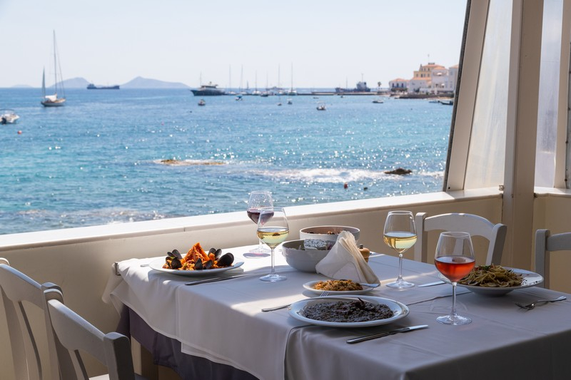 Τα εστιατόρια και οι ταβέρνες του νησιού είναι καλοβαλμένες και φροντισμένες και έχουν έχουν κοινό σημείο τη θάλασσα: είτε βρίσκονται πάνω στο κύμα, είτε προσφέρουν γοητευτική θαλασσινή θέα. Ψαροφαγία, γκουρμέ φαγητό, μεζέδες, μαγειρευτά: τίποτα δεν λείπει από τη γαστρονομική παλέτα του νησιού, ενώ τα διάσημα αρωματικά αμυγδαλωτά είναι η πασπαρτού απόλαυση για κάθε ώρα της μέρας.