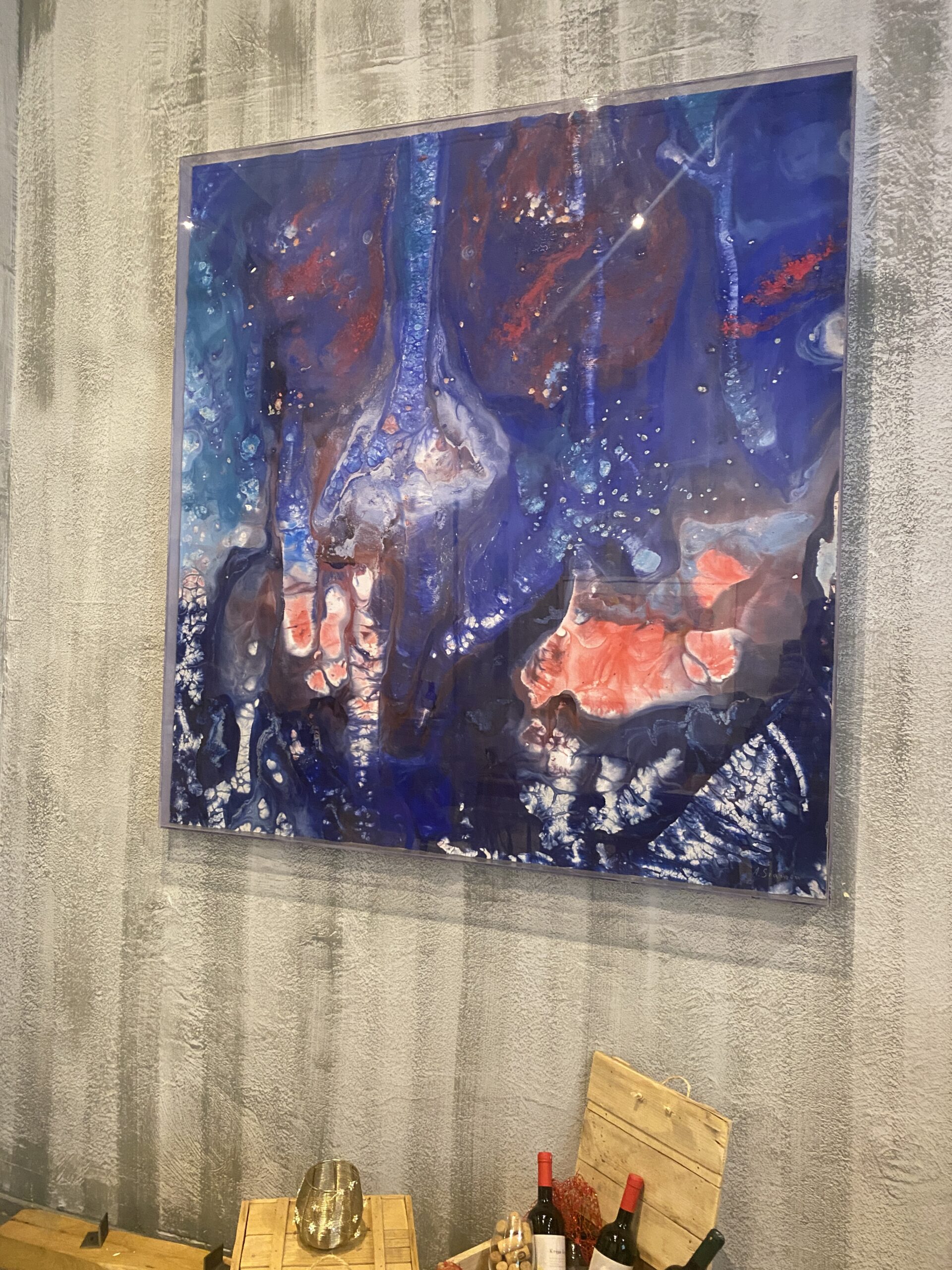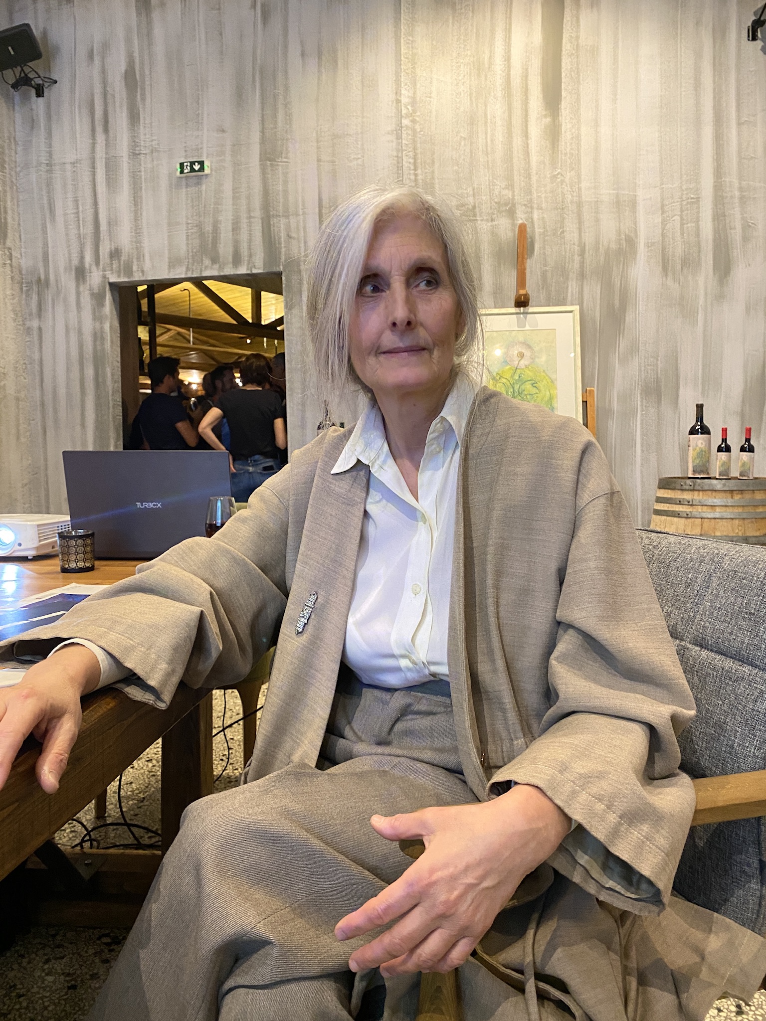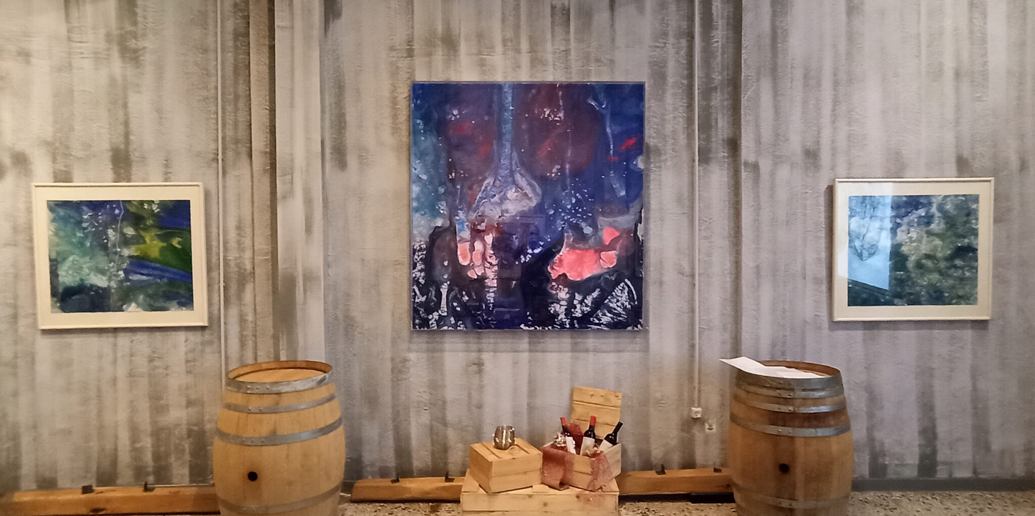 Έχει σχεδόν νυχτώσει και περπατάω στο Λιτόχωρο. Έχω μάθει ότι, σχετικά πρόσφατα, τρεις οινοποιοί συνασπίστηκαν και δημιούργησαν ένα wine bar, το Olympus Wines, και ταυτόχρονα έναν πολιτιστικό χώρο. Είναι Σάββατο βράδυ και το μαγαζί είναι σχεδόν γεμάτο. Είναι η πρώτη ημέρα της έκθεσης ζωγραφικής, της Αγγελικής Σιάμου. Περνάω λίγη ώρα μπροστά στους πίνακες και στη συνέχεια, η καλλιτέχνις μας δίνει κάποιες πληροφορίες. Δοκιμάζουμε τα κρασιά από τα κτήματα των ιδιοκτητών και στη συνέχεια, αφιερώνουμε λίγο χρόνο σε μία συζήτηση για τέχνη, μουσική και επιρροές.
