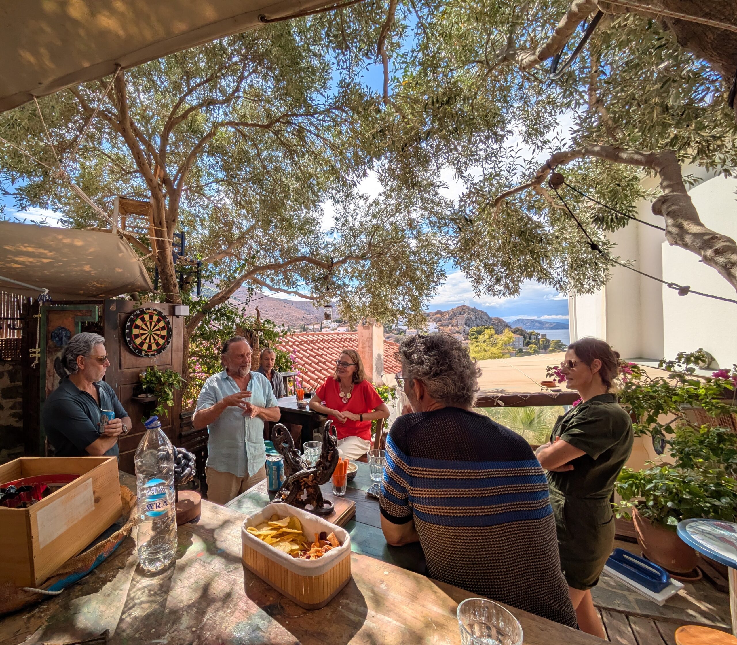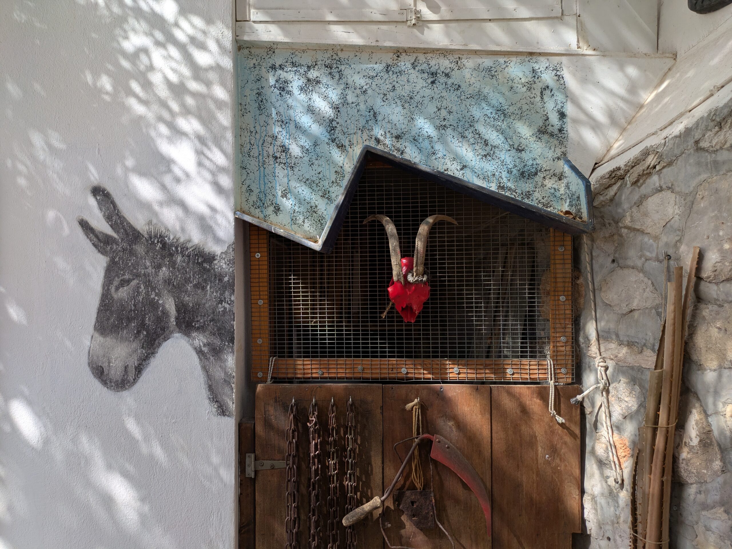 Η ξενάγησή μας στο σπίτι του ζευγαριού αρχίζει από την αυλή, όπου παίρνουμε μια γεύση από την ευρηματικότητα, τη δεξιοτεχνία και τη φαντασία του Andreas. Παλιά κομμάτια ξύλου και μετάλλου, όπως πόρτες ή μέλη επίπλων, έχουν μεταμορφωθεί σε πάγκους, τραπέζια και καθίσματα. Ένα βαρέλι στο εσωτερικό του κρύβει οινοπνευματώδη και αναψυκτικά. Ο χώρος θυμίζει περισσότερο μπαράκι παρά υπαίθριο καθιστικό, ταυτόχρονα όμως κρατάει τη σπιτική ζεστασιά του. Κάποια υλικά έχουν μετουσιωθεί σε έργα τέχνης. Ένα μεγάλο κομμάτι ξύλου με πολλές χαρακιές, που κάποτε χρησιμοποιούσαν οι ντόπιοι για οικοδομικές εργασίες στο Μανδράκι, απεικονίζει πλέον τη γραμμή ορίζοντα του Μανχάταν. Μια παλιά αλυσίδα έχει γίνει γλυπτό ανοιχτό σε πολλές ερμηνείες– θυμίζει και κοράλλι και καρδιά. Μια ξύλινη πόρτα έχει αναλάβει χρέη καμβά για το πορτρέτο της Πηνελόπης, μιας Υδραίας γαϊδουρίτσας, σταθερής μούσας του Andreas.