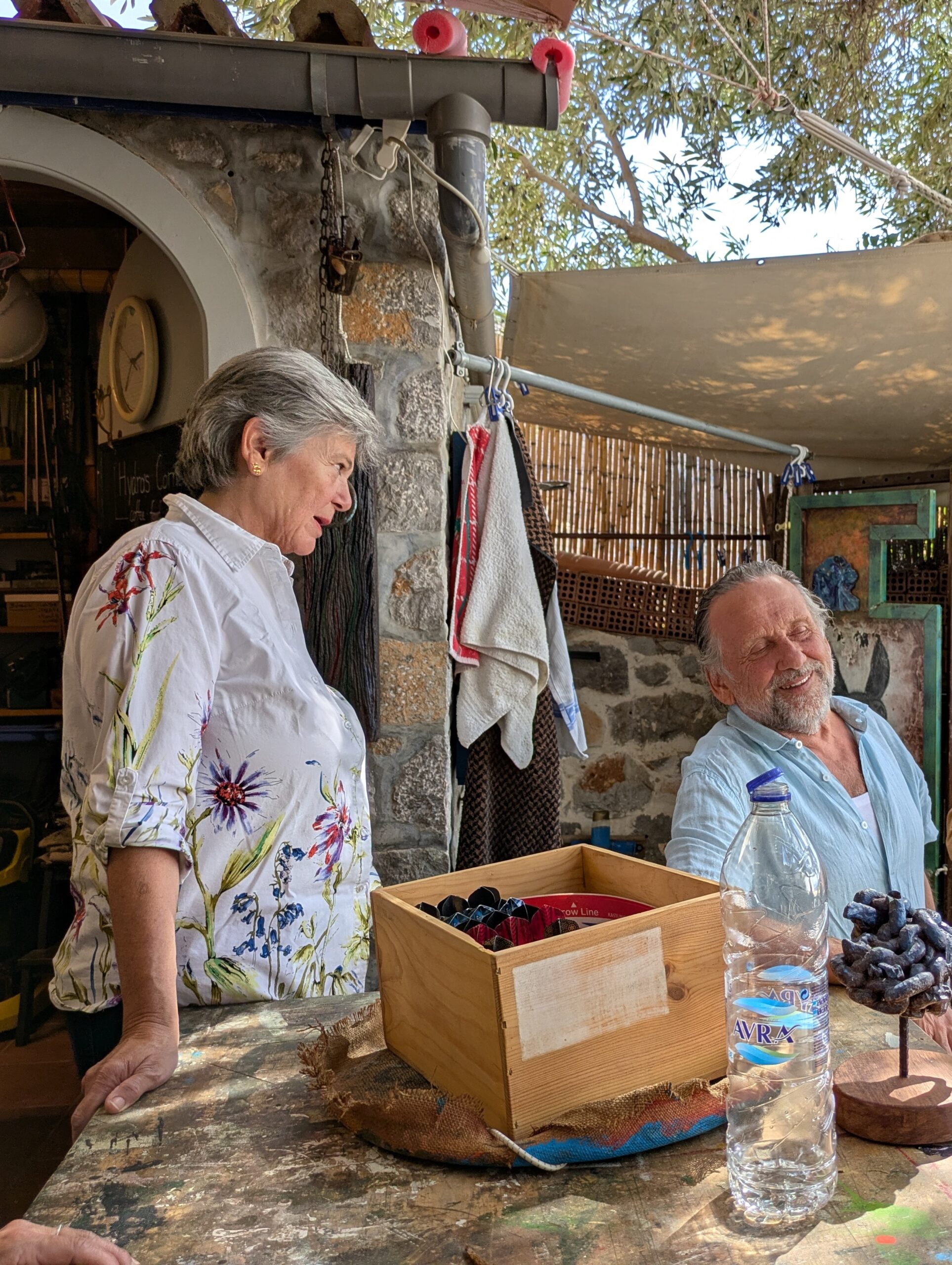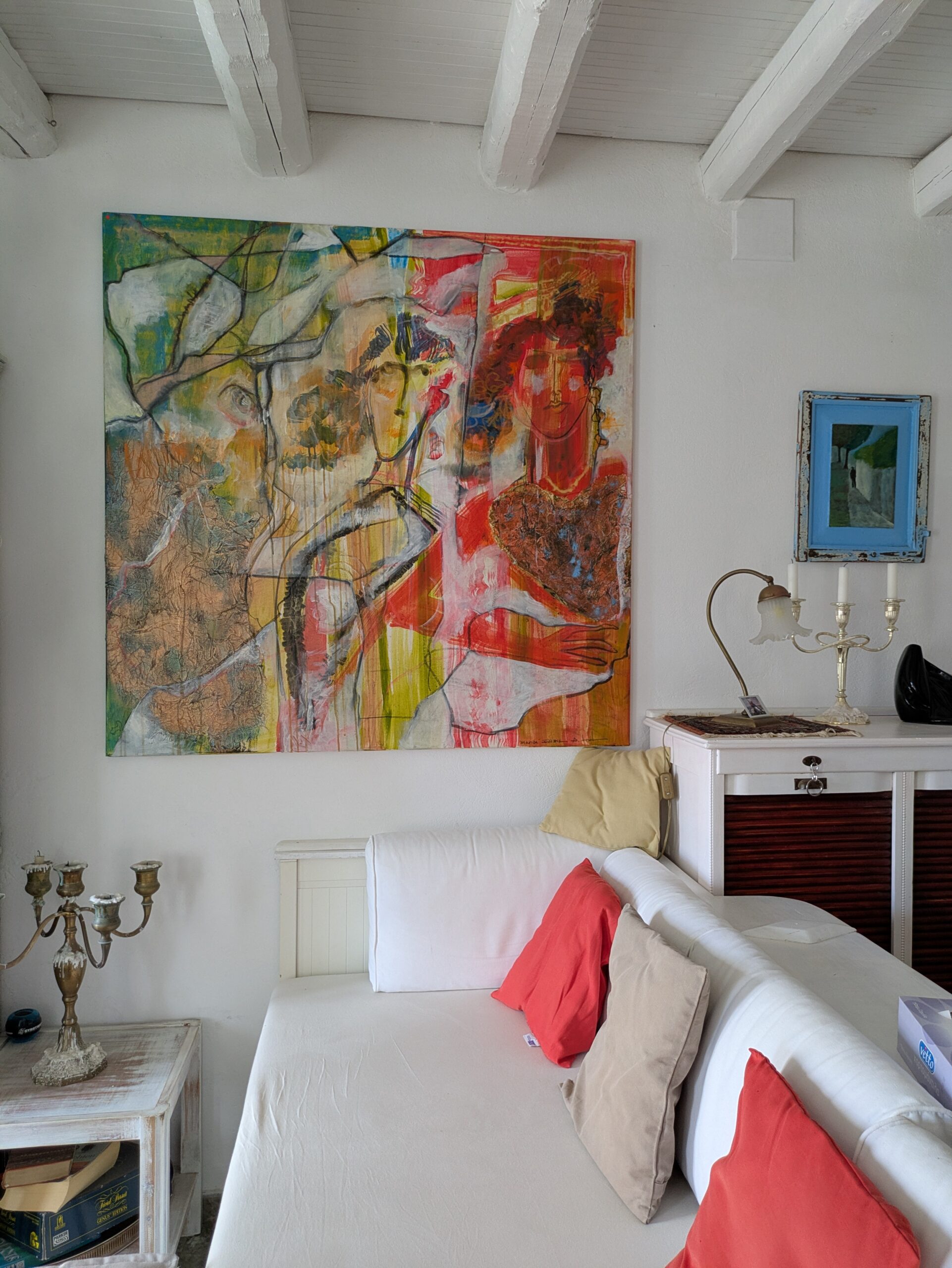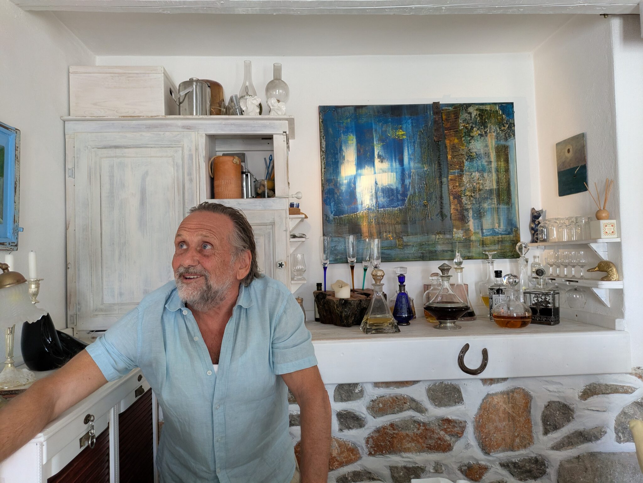 Πλέον ασχολείται περισσότερο με τη ζωγραφική παρά με τη γλυπτική. Στο εσωτερικό του σπιτιού, αντικρίζουμε δύο μικροσκοπικά δωμάτια σε διαφορετικά επίπεδα, στα οποία έχει αξιοποιηθεί πρακτικά κάθε τετραγωνικό χιλιοστό – σε μεγάλο ποσοστό, ως εκθεσιακός χώρος. Όταν ρωτάμε την Corinne αν και εκείνη ασχολείται με την τέχνη απαντά, μεταξύ αστείου και σοβαρού, πως «ένας καλλιτέχνης είναι αρκετός στο σπίτι!». Ωστόσο ανάμεσα στα πειράματα η αγάπη τους δεν κρύβεται: ένα πορτρέτο της στον τοίχο χαμογελάει πλατιά μεταξύ άλλων, αφαιρετικών έργων του συζύγου της. Ακόμα και τα παράθυρα λειτουργούν σαν τοπιογραφίες εν εξελίξει, καθώς οι ξύλινες κορνίζες τους πλαισιώνουν τη θέα στη θάλασσα και στα αρχοντικά.