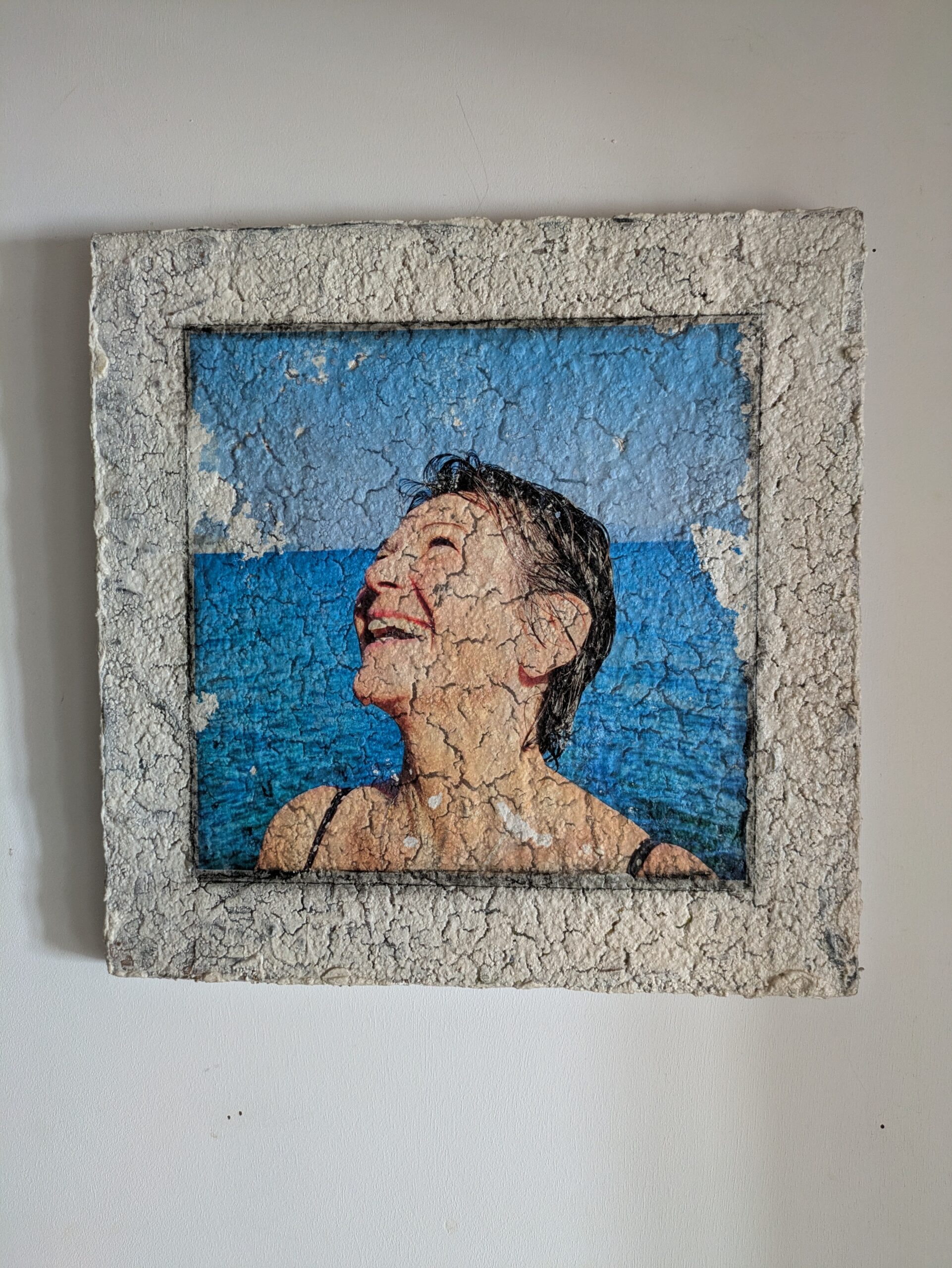 Τον ρωτάω με ποια υλικά προτιμά να δουλεύει. «Με τα πάντα», απαντά. Στη ζωγραφική του, με ακρυλικά χρώματα, καμβά, ξύλο. Αλλά «σε ποσοστό περίπου 90%» με αντικείμενα που ανακαλύπτει πεταμένα. Μια συλλογή από σκουριασμένα καρφιά που είχε φυλάξει «για παν ενδεχόμενο» αξιοποιήθηκε σε έναν σταυρό ύψους σχεδόν ενός μέτρου-παραγγελία για έναν γάμο στο νησί. Ακόμα και οι παλιές καρέκλες που βρέθηκαν σκόρπιες όταν το ζευγάρι αγόρασε το σπίτι κρεμάστηκαν στους εσωτερικούς και τους εξωτερικούς χώρους του -από κλαδιά δέντρων ή από τις ξύλινες δοκούς της στέγης- και άρχισαν να εκτελούν χρέη εικαστικής εγκατάστασης και κοιτώνα για τις γάτες που φροντίζει.