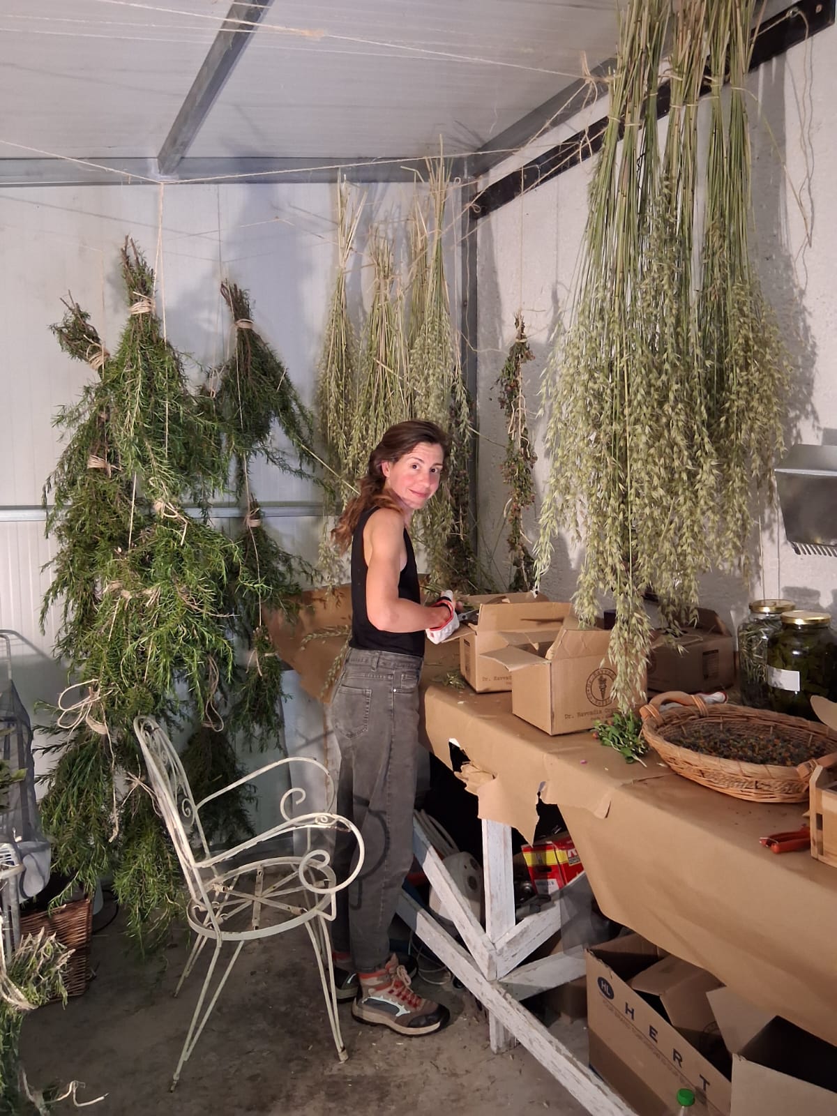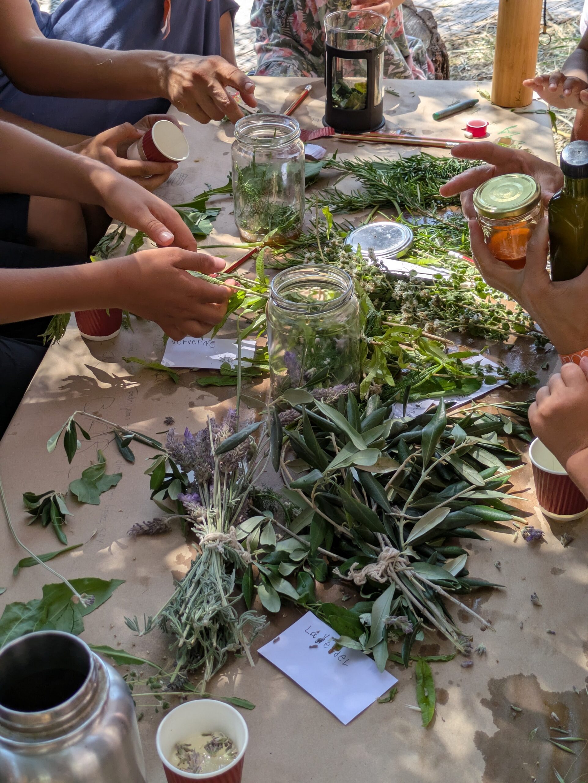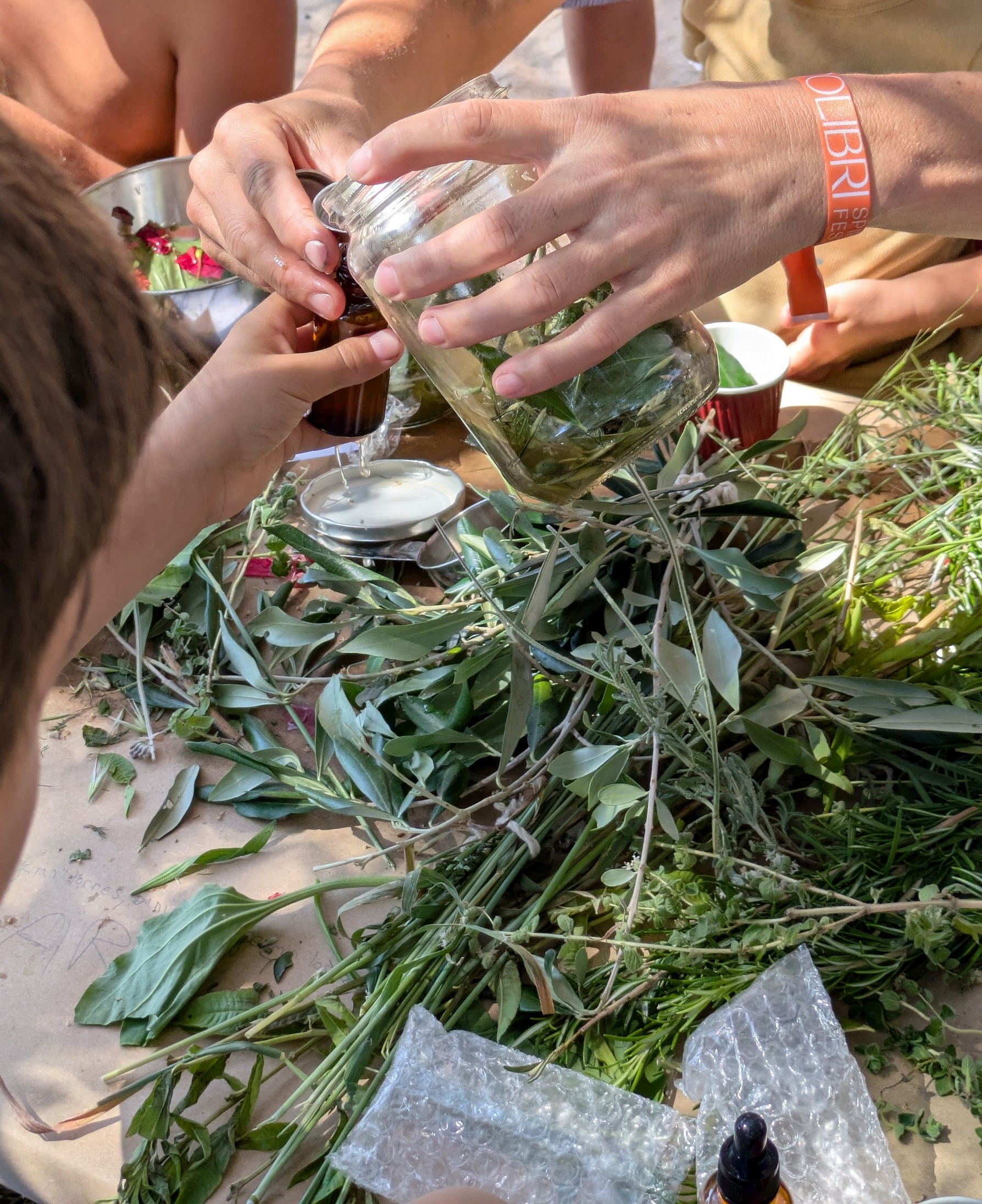 Μόλις κάθεται στον ξύλινο πάγκο κρατώντας ένα μεγάλο μπουκέτο από βότανα που ευωδιάζουν σαν μεσογειακό λιβάδι, συγκεντρώνει γύρω της τα παιδιά και τους γονείς που μέχρι τότε απασχολούνται σε διαφορετικές δραστηριότητες στον χώρο. Αρχίζει να δίνει οδηγίες εναλλάξ στα αγγλικά, τα γερμανικά και τα ολλανδικά, με υπομονή και μεθοδικότητα -και ενώ τα δύο αγοράκια της ζουζουνίζουν ανάμεσά μας- ώστε μέχρι το τέλος του εργαστηρίου να έχουμε όλοι μας από δύο γυάλινα μπουκαλάκια με περιεχόμενο που παρασκευάσαμε εξ ολοκλήρου από φυσικά υλικά: ένα άρωμα και ένα μείγμα που, όπως μας εξηγεί, μπορούμε να πάρουμε «όποτε, ας πούμε, νιώθουμε λίγο αδιάθετοι».