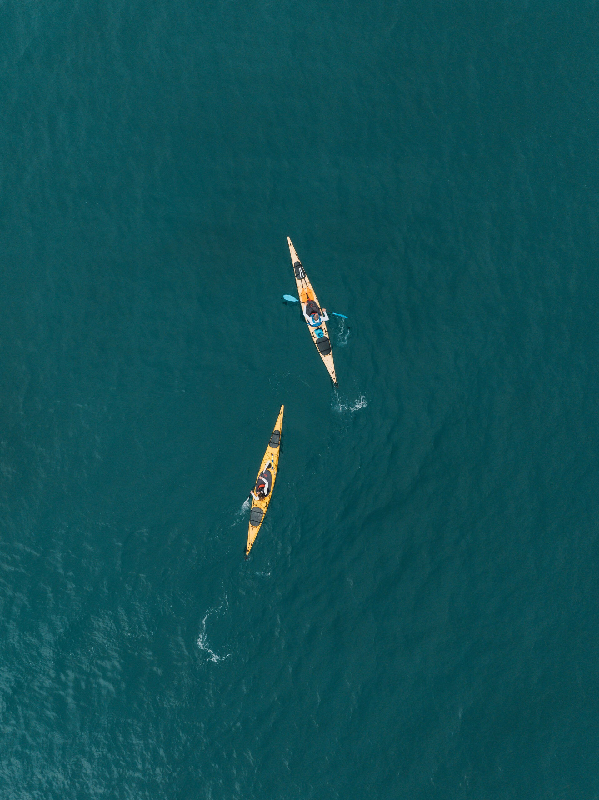 Αφού μιλήσαμε αρκετά, ήταν και οι δυο τους έτοιμοι να μπουν στο νερό και να κάνουν μία δοκιμαστική διαδρομή, καθώς βρισκόμαστε στην αρχή της περιόδου. Με γρήγορες κινήσεις βρίσκονται ήδη με τα σκάφη στο νερό. Κωπηλατούν και σε χρόνο μηδέν έχουν απομακρυνθεί αρκετά. Ο Κωστής Αγγελόπουλος, ο φωτογράφος της αποστολής, σηκώνει το drone και καταγράφει ωραίες εικόνες από ψηλά. Βλέπω από την οθόνη του κινητού και θέλω να μπω σε ένα κανό να κάνω το ίδιο. Ίσως μία άλλη φορά.