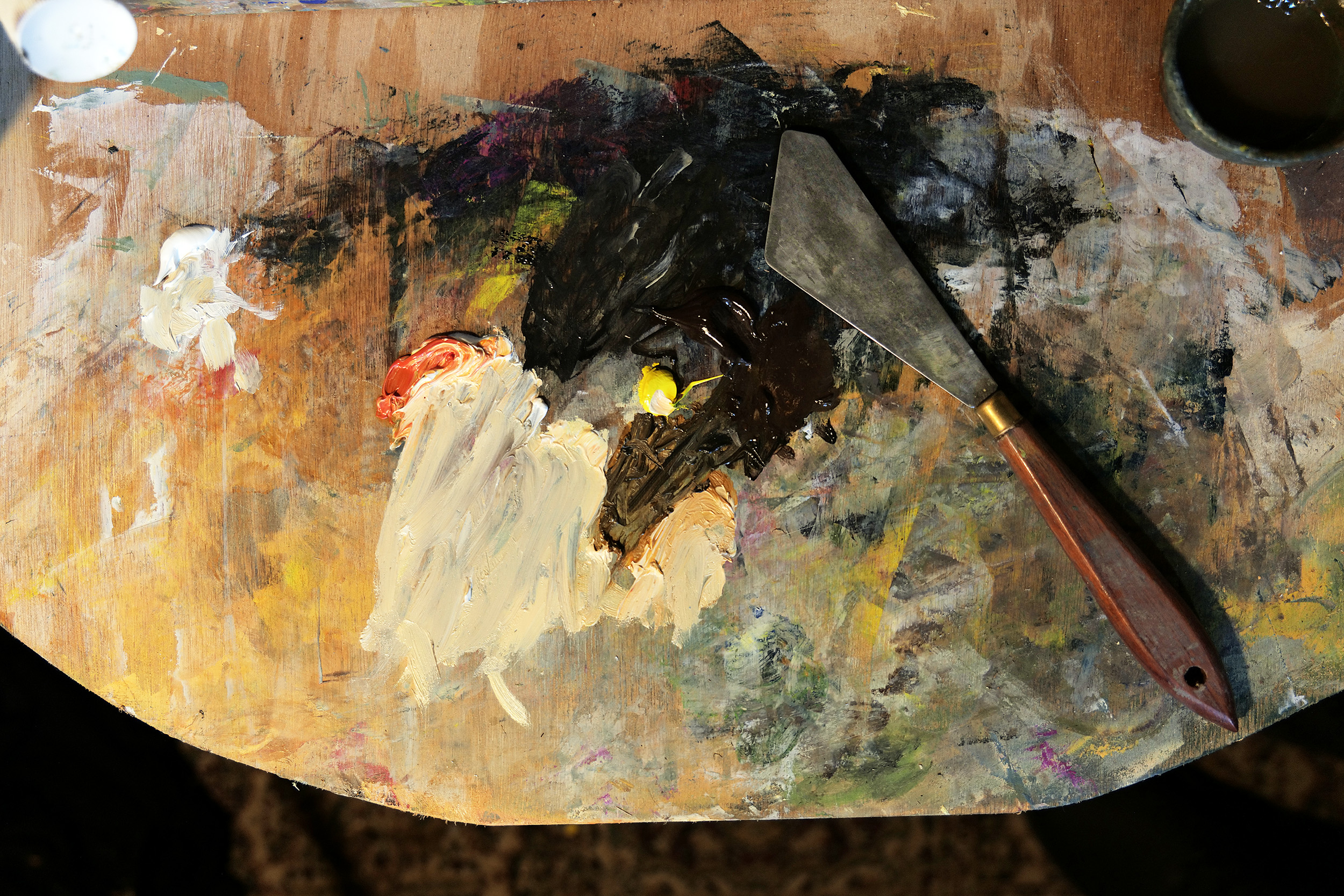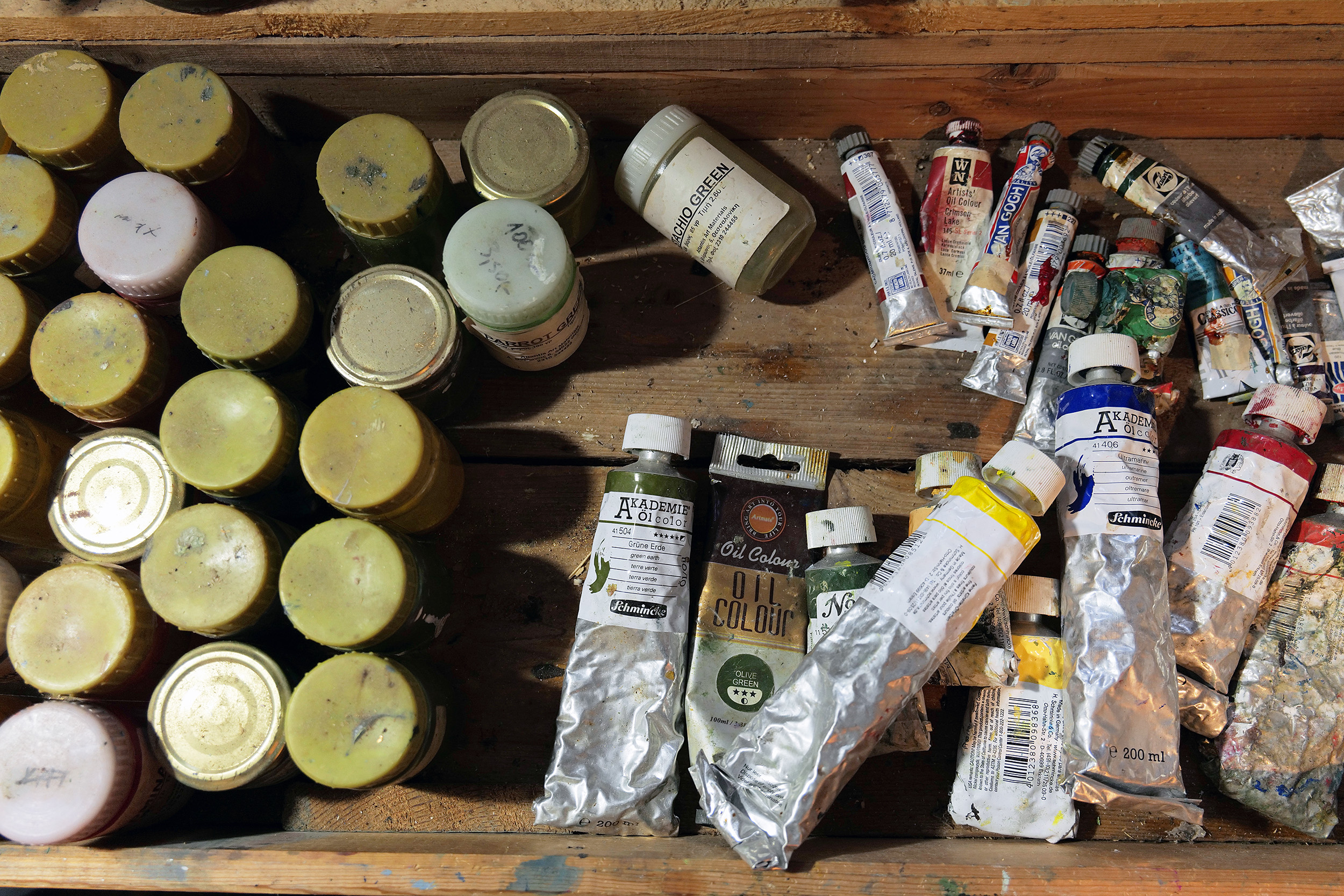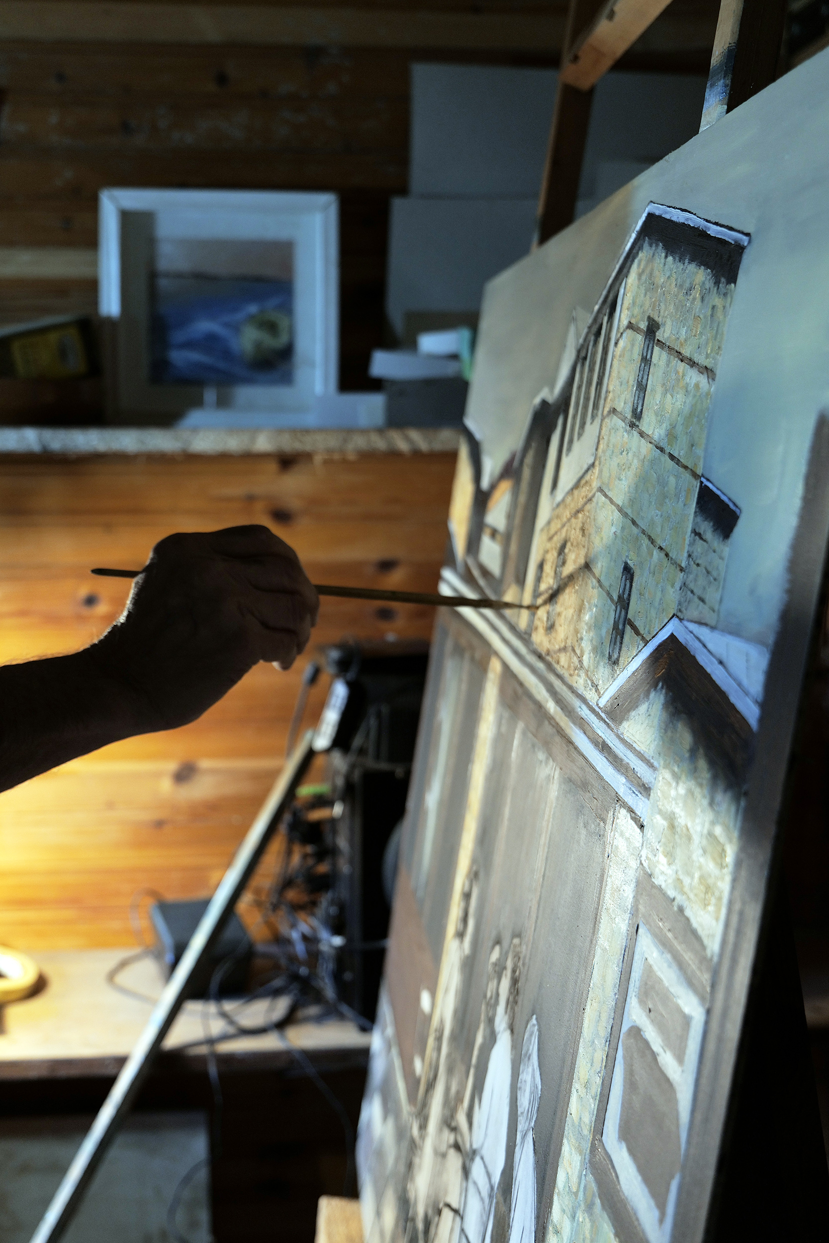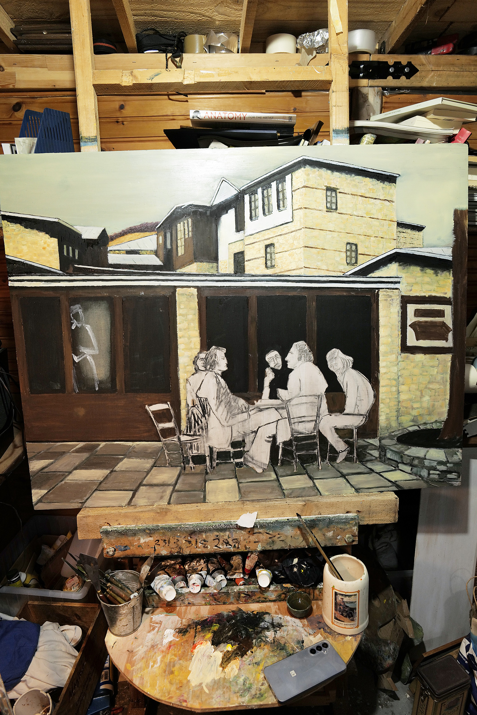Παντού υπάρχουν τελάρα με καμβάδες, έργα έτοιμα, εικόνες αποτυπωμένες σε διάφορα μεγέθη, σκηνές εμπνευσμένες από το Νυμφαίο αλλά και από τη ζωή του Δημήτρη στη Θεσσαλονίκη όπου έζησε τα περισσότερα χρόνια της ζωής του. Πινέλα διαφόρων μεγεθών και ικανοτήτων είναι στοιβαγμένα σε τενεκεδάκια κοντά στο παράθυρο, τσαλακωμένα σωληνάρια, καθώς έχουν πιεστεί να βγάλουν τα χρώματά τους, βρίσκονται κοντά στο καβαλέτο, σπάτουλες και φωτογραφίες – εμπνεύσεις, συμπληρώνουν την εικόνα. Η καταγωγή μου από την ίδια πόλη με τον Δημήτρη, τη Θεσσαλονίκη, αλλά και τα χρόνια στα οποία ταυτόχρονα τη μοιραστήκαμε, χωρίς να γνωρίζει ο ένας τον άλλο, έσπασε πολύ γρήγορα τον πάγο και η συζήτηση πήρε εύκολα το δρόμο της.
