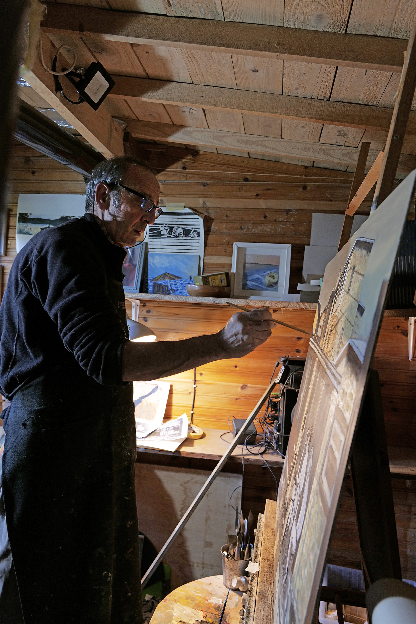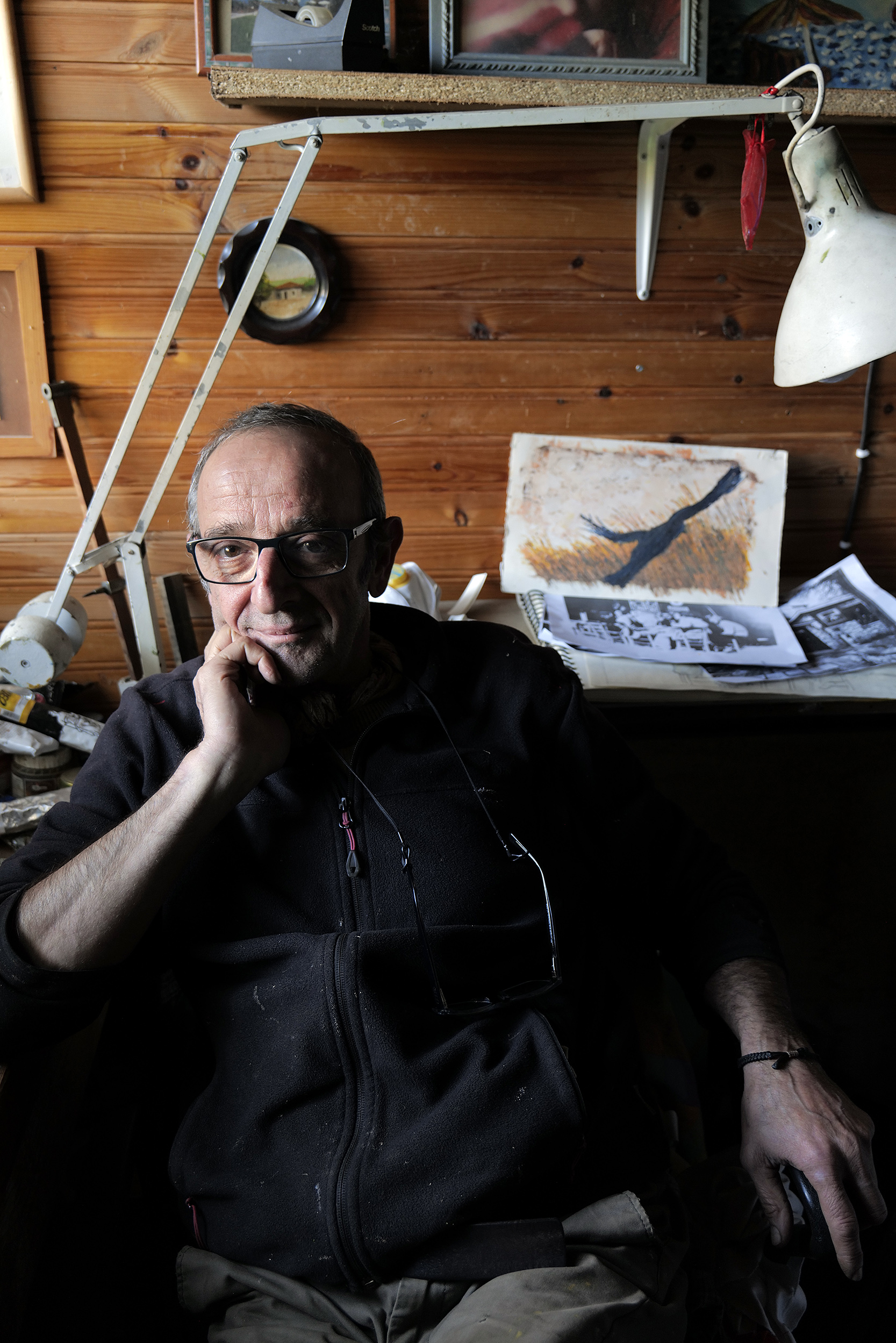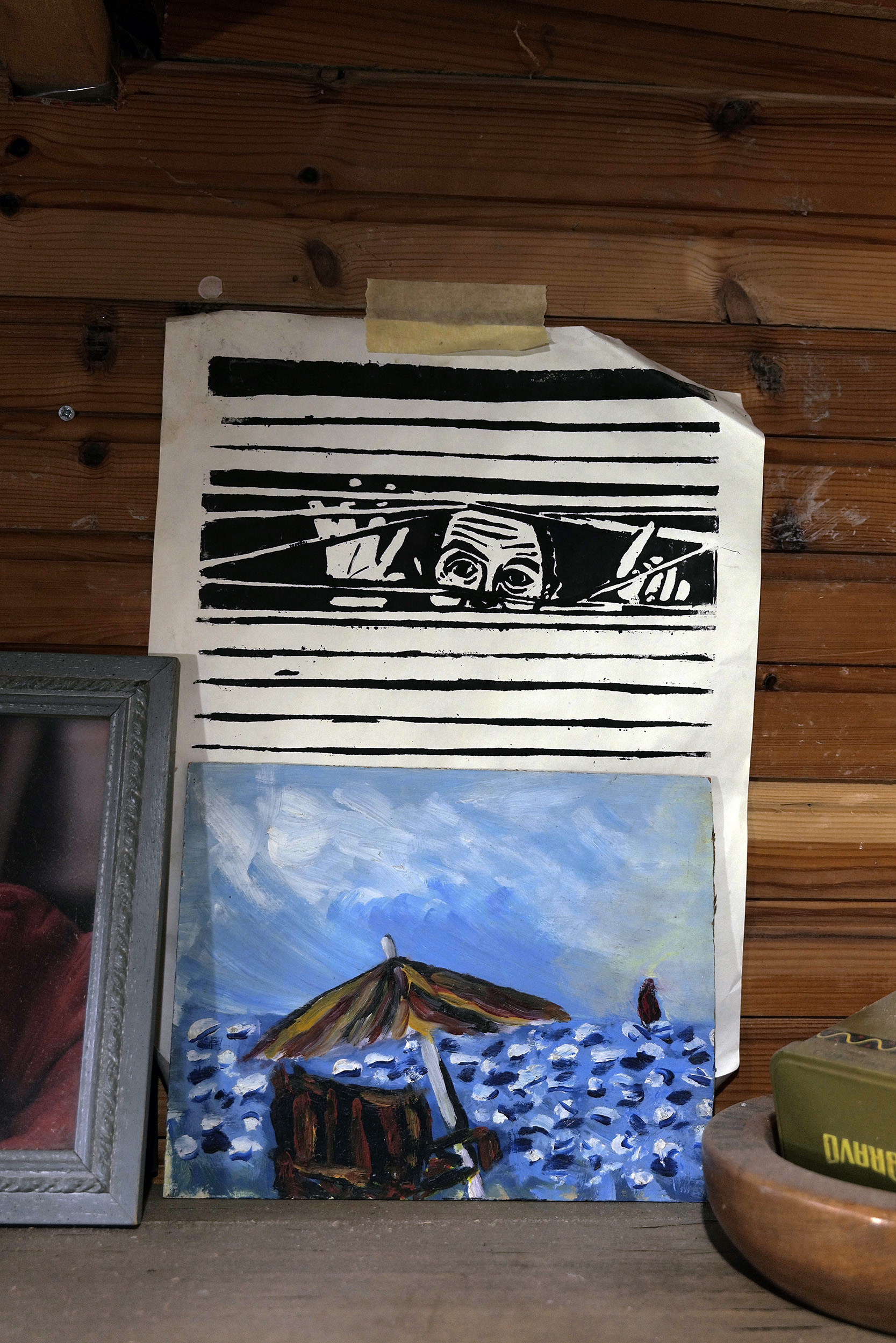 Κάνει πολύ κρύο στο Νυμφαίο νωρίς το πρωί. Χιόνι δεν έχει πέσει ακόμη φέτος αλλά μάλλον δε θα αργήσει να συμβεί και αυτό. Το σπιτάκι που φιλοξενεί το Δημήτρη στις ώρες που ζωγραφίζει είναι σαν να βγήκε και το ίδιο από πίνακα. Ακουμπάμε τα φλυτζάνια με τον ελληνικό καφέ σε κάποια από τα ελεύθερα από αντικείμενα σημεία, κλείνουμε την πόρτα για να αφήσουμε το κρύο απέξω και αφήνουμε τη σόμπα στη μέση του χώρου να κάνει τη δουλειά της. Υπό τους ήχους κλασικής μουσικής η οποία βγαίνει από ένα μικρό, σχεδόν αόρατο ηχείο, παρατηρώ το ατελιέ. Τα δυο παράθυρα της πρόσοψης, αριστερά και δεξιά της πόρτας, χωρίζουν το χώρο σε εργαστήριο με εργαλεία στα δεξιά και στο ζωγραφικό ατελιέ στα αριστερά.