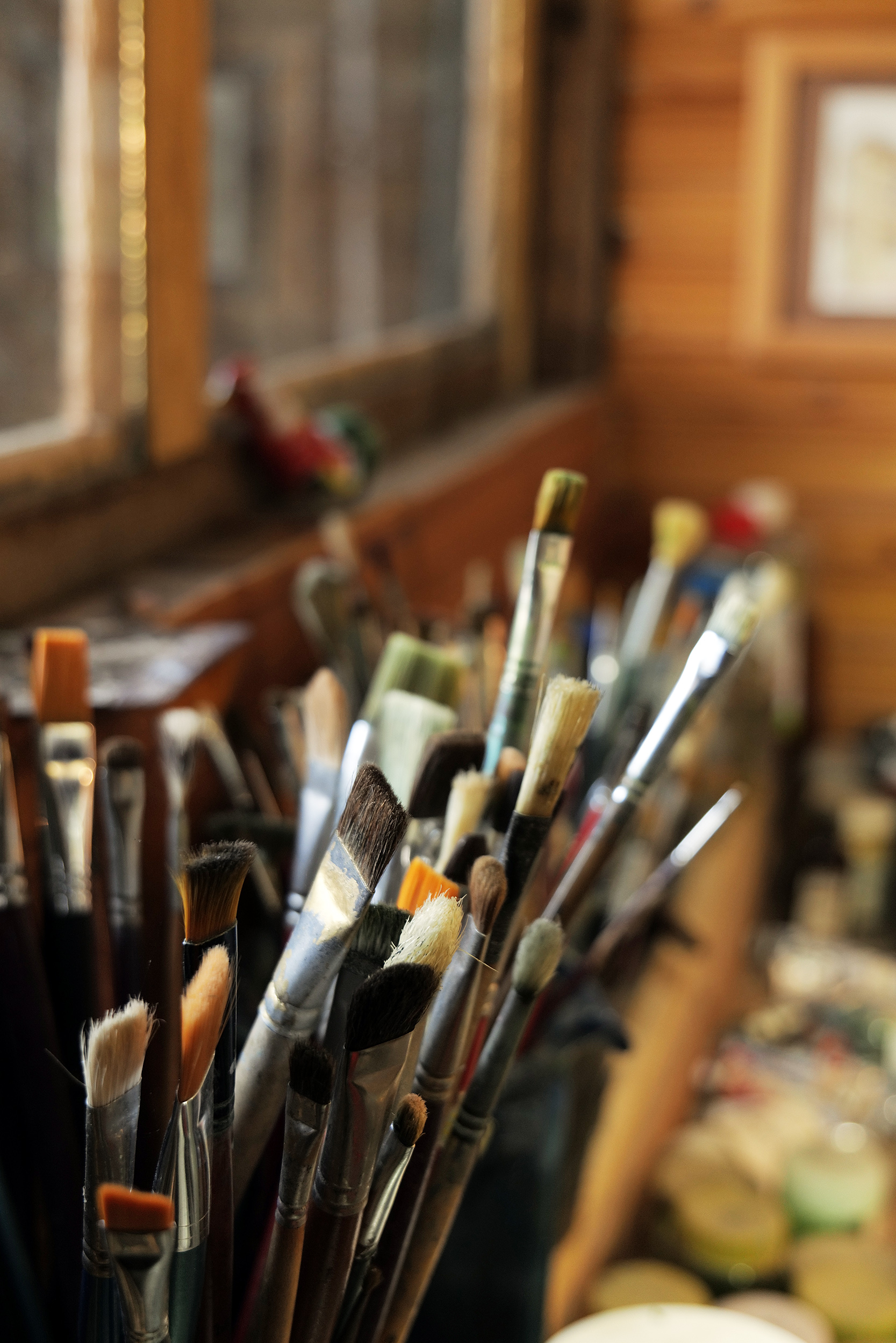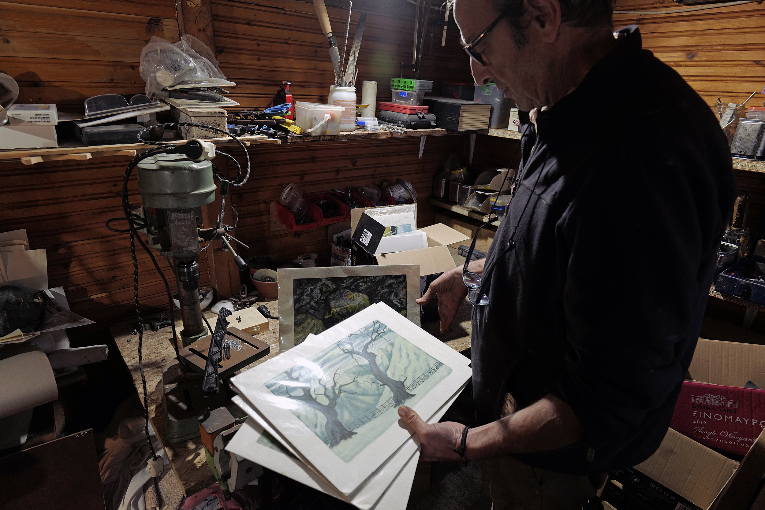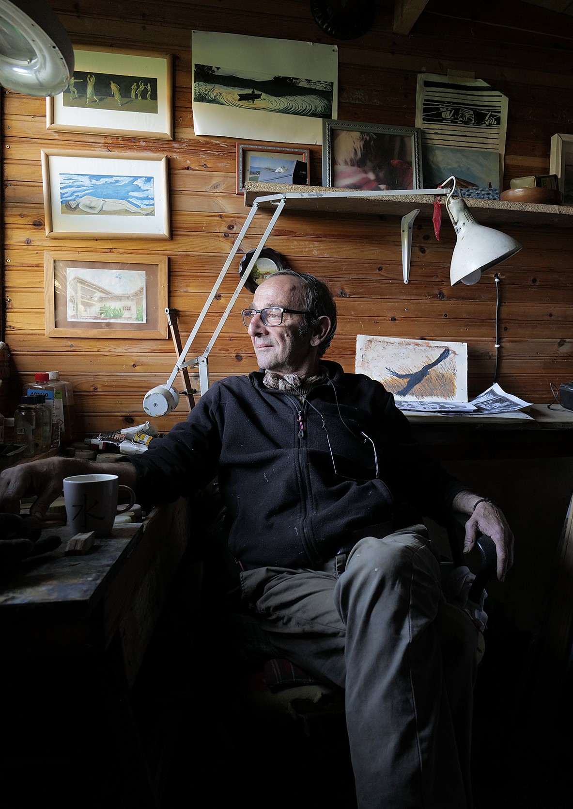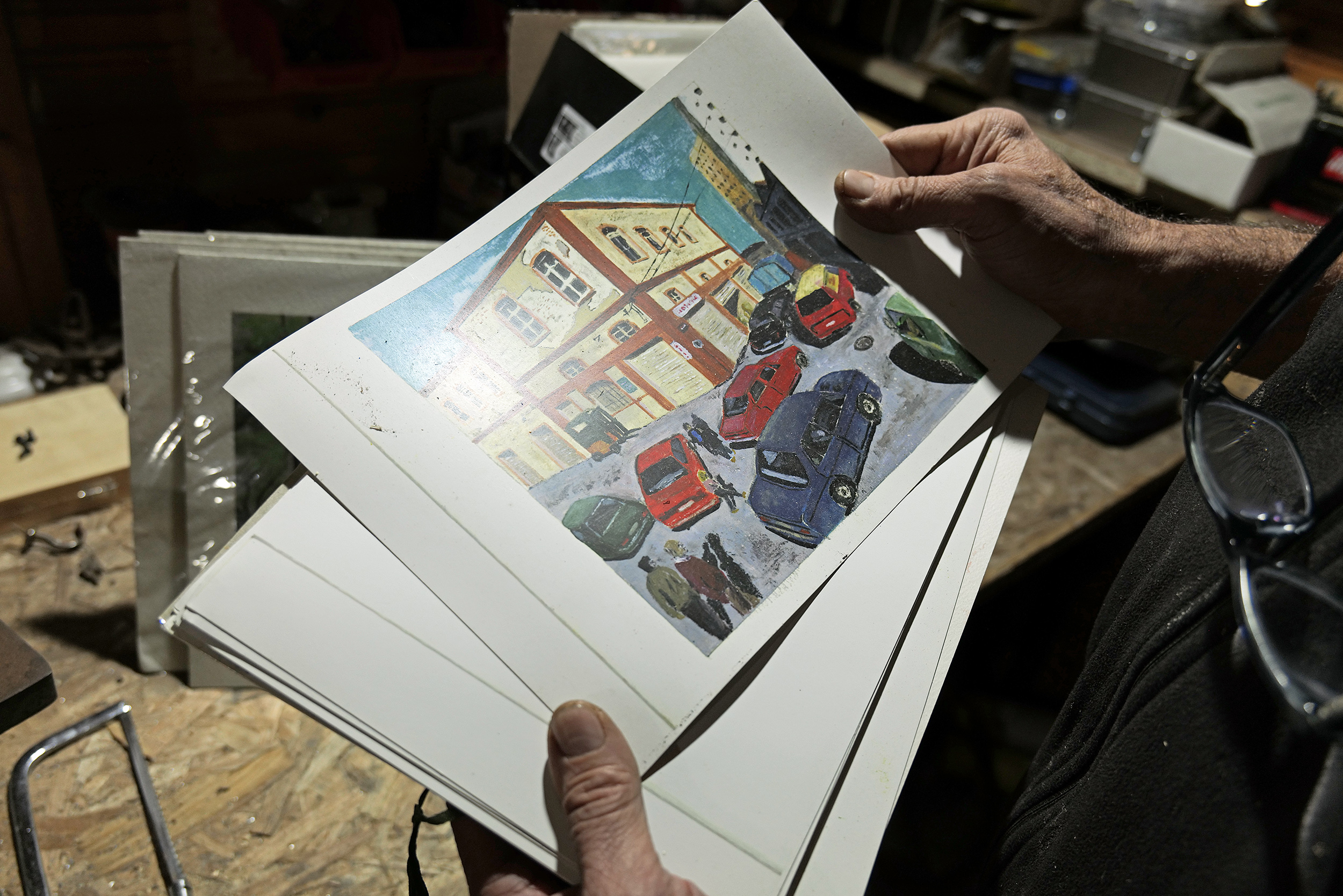 Κάνει πολύ κρύο στο Νυμφαίο νωρίς το πρωί. Χιόνι δεν έχει πέσει ακόμη φέτος αλλά μάλλον δε θα αργήσει να συμβεί και αυτό. Το σπιτάκι που φιλοξενεί το Δημήτρη στις ώρες που ζωγραφίζει είναι σαν να βγήκε και το ίδιο από πίνακα. Ακουμπάμε τα φλυτζάνια με τον ελληνικό καφέ σε κάποια από τα ελεύθερα από αντικείμενα σημεία, κλείνουμε την πόρτα για να αφήσουμε το κρύο απέξω και αφήνουμε τη σόμπα στη μέση του χώρου να κάνει τη δουλειά της. Υπό τους ήχους κλασικής μουσικής η οποία βγαίνει από ένα μικρό, σχεδόν αόρατο ηχείο, παρατηρώ το ατελιέ. Τα δυο παράθυρα της πρόσοψης, αριστερά και δεξιά της πόρτας, χωρίζουν το χώρο σε εργαστήριο με εργαλεία στα δεξιά και στο ζωγραφικό ατελιέ στα αριστερά.