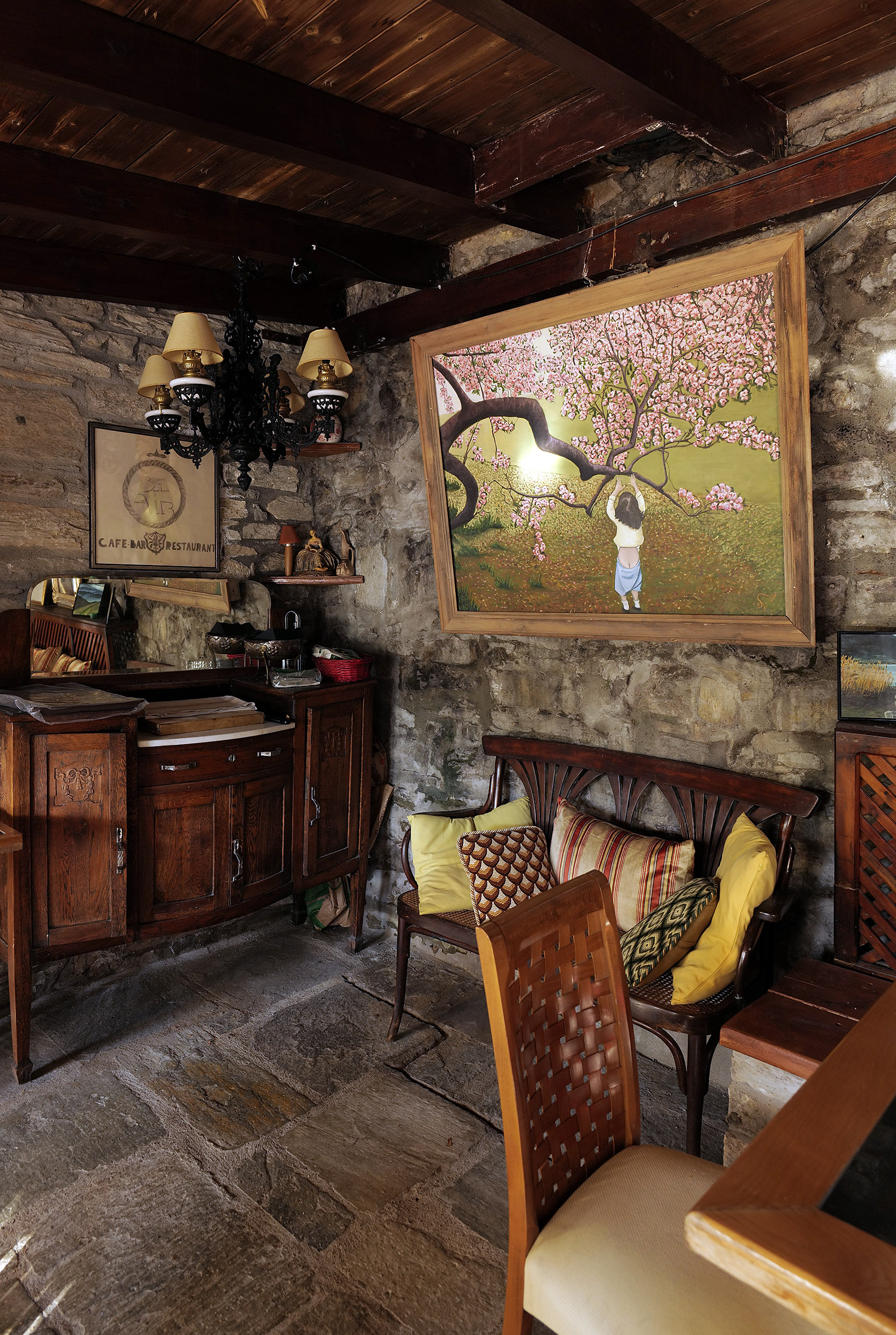 Την ώρα που μπήκαμε στο καφέ – εστιατόριο του Δημήτρη Νούλη, ο ήλιος έμπαινε από τα στενά παράθυρα φωτίζοντας τις σκοτεινές, καλαίσθητες γωνιές αλλά και τους πολύ όμορφους ζωγραφικούς πίνακες οι οποίοι διακοσμούν το χώρο απεικονίζοντας σκηνές που θα μπορούσαν να είναι από το Νυμφαίο. Ο ιερέας είχε δίκιο, ο Δημήτρης Νούλης προδίδει την ταυτότητά του χωρίς να συστηθεί. Ήρεμος, με καθαρό βλέμμα και ευγένεια στις κινήσεις του, βγαίνει από το στενό κουζινάκι κερνώντας το χαμόγελό του. Συμφωνούμε να συναντηθούμε μετά από λίγες ημέρες, πολύ πρωί, στο μικρό καλύβι που φιλοξενεί το εργαστήριο και ατελιέ του για να μιλήσουμε για ζωγραφική.