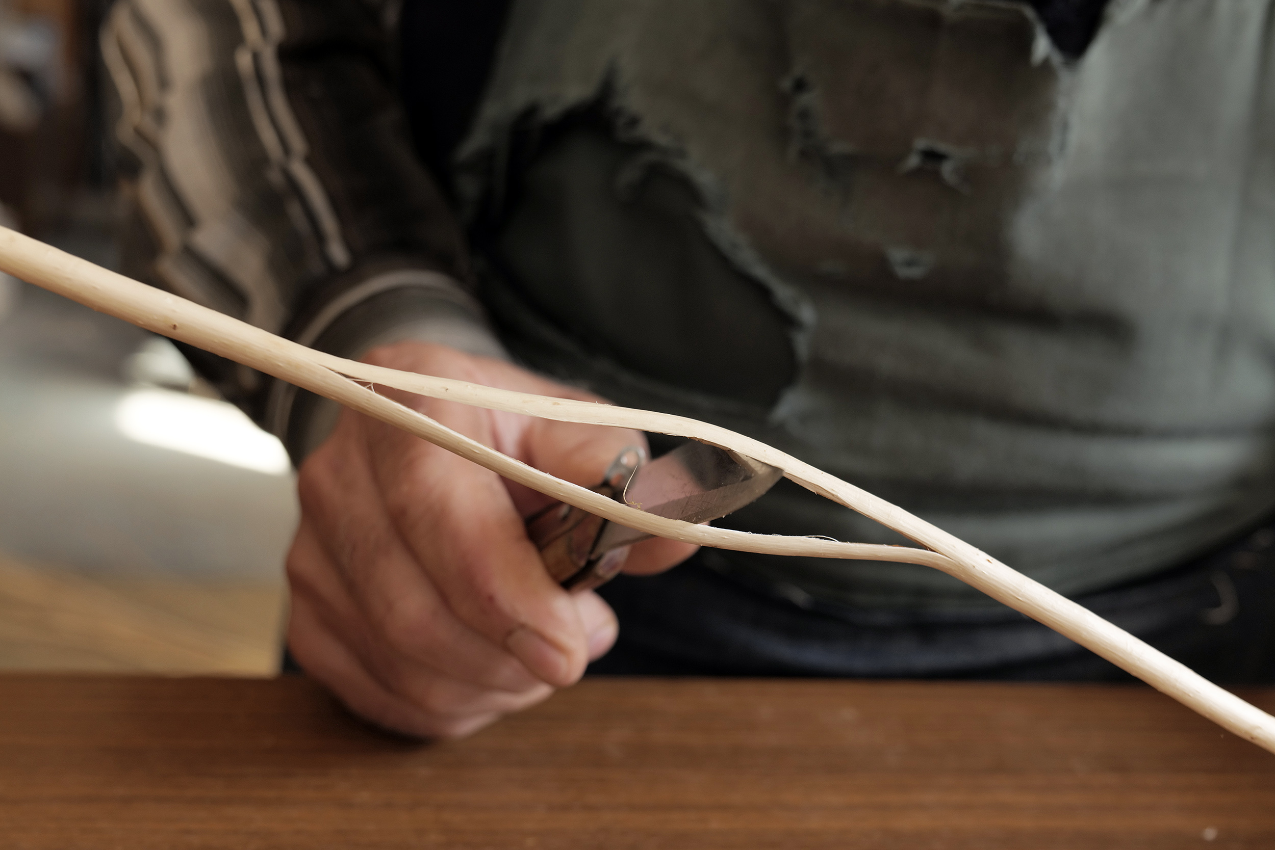 Δείχνοντας τον τρόπο με τον οποίο ξεκινά την κατασκευή ενός πανεριού, σχίζοντας με το μυτερό μαχαιράκι τη βέργα στη μέση έτσι ώστε να αρχίσει η πλέξη, εξηγεί πως πάντα ξεκινάει με τον πάτο. «Το σπίτι ξεκινά πάντα από τα θεμέλια», ακούγεται να λέει, αφήνοντας να εννοηθεί η άσβεστη αγάπη του για τη χειρονακτική τέχνη που ακολουθεί. Η κατασκευή ενός πανεριού με πάτο π.χ. 40 εκατοστά διαμέτρου, δεν απαιτεί πολύ χρόνο για την περιμετρική πλέξη, μπορεί και ένα τέταρτο της ώρας, εξηγεί. Η προετοιμασία όμως των βεργών, η ενυδάτωσή τους, η επιλογή τους και ο χρόνος στα καλούπια, ανάλογα στο σχήμα που θα φέρει το τελικό προϊόν, μπορεί να διαρκέσει περισσότερο από μία ημέρα.