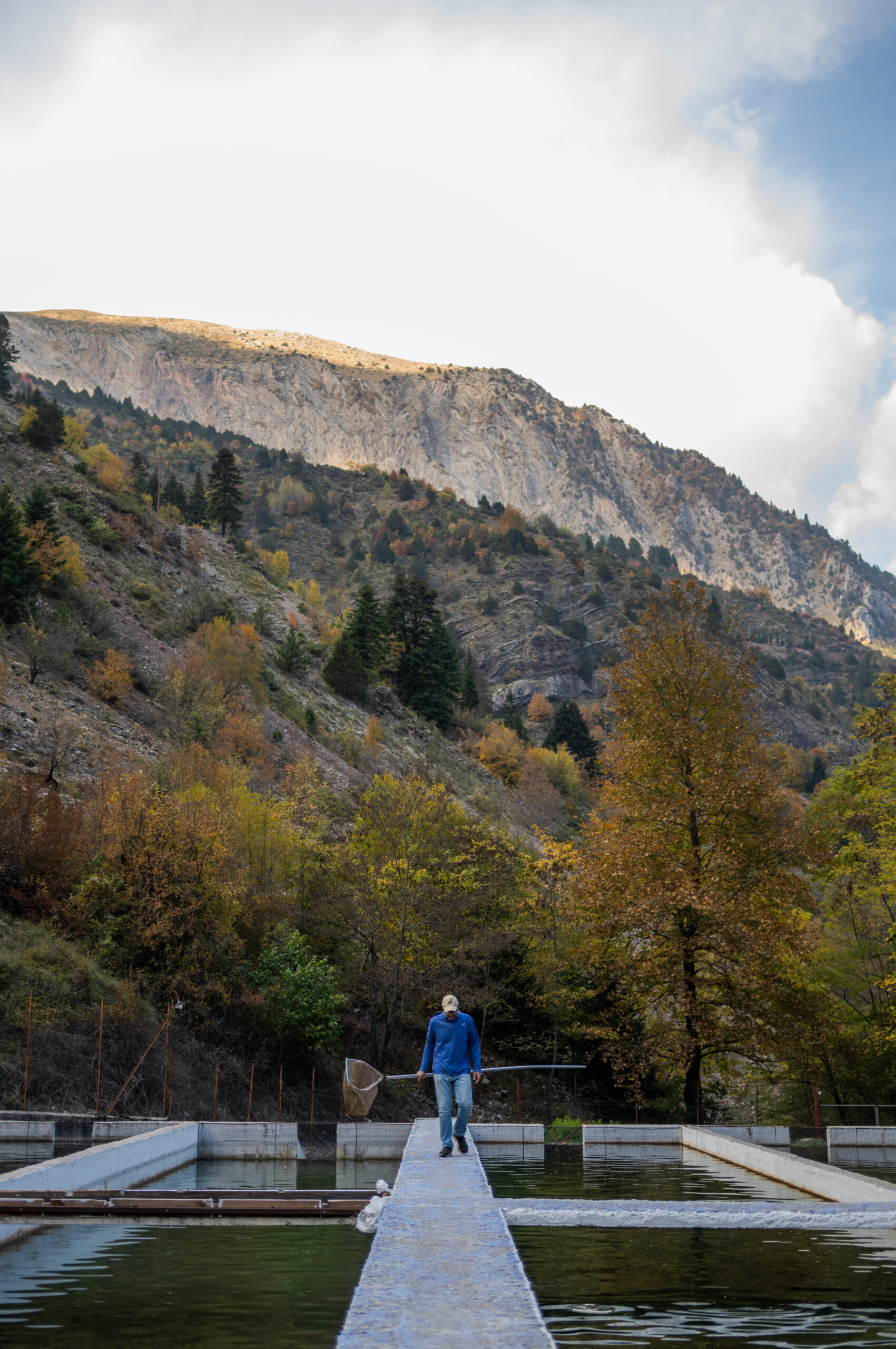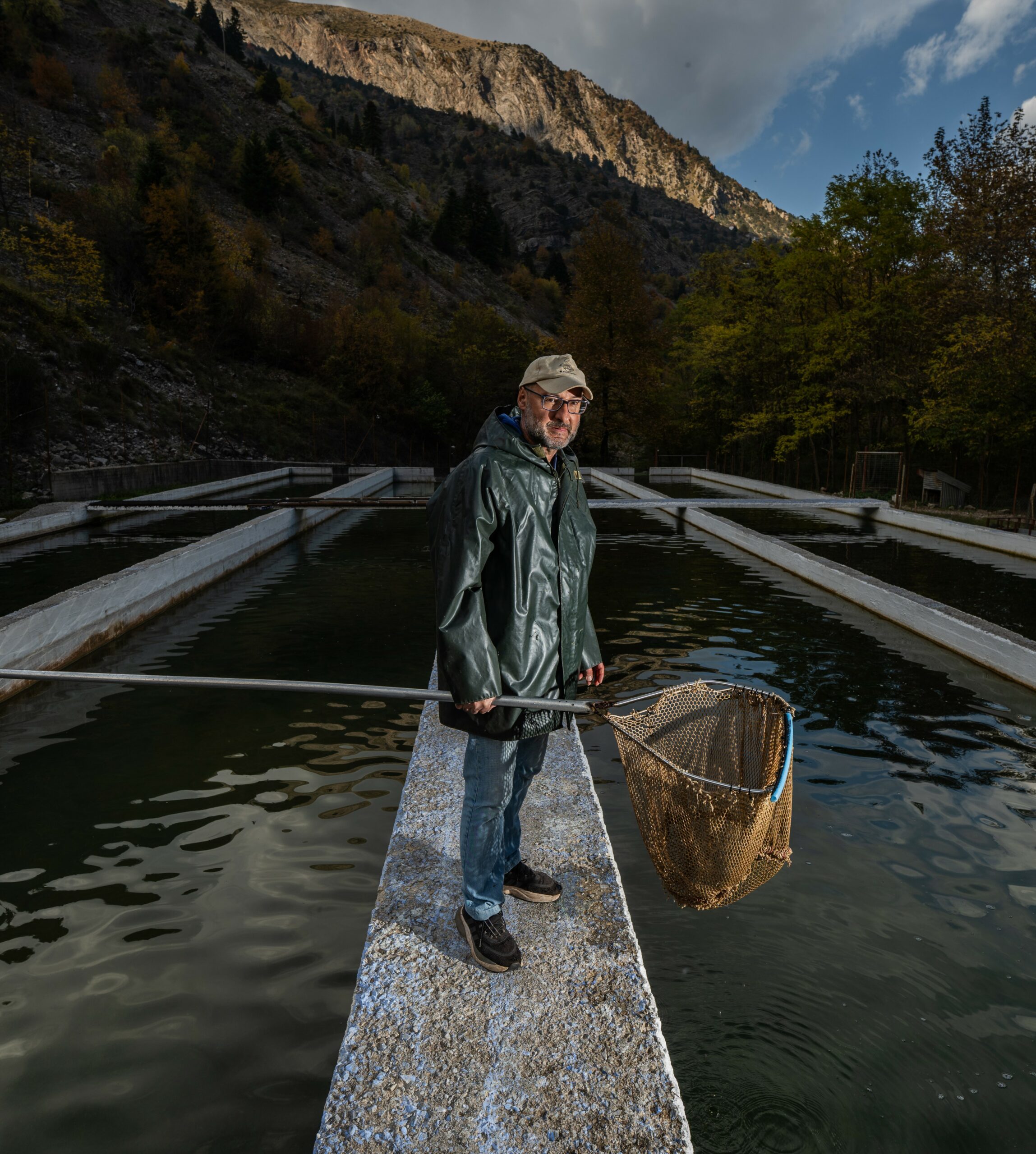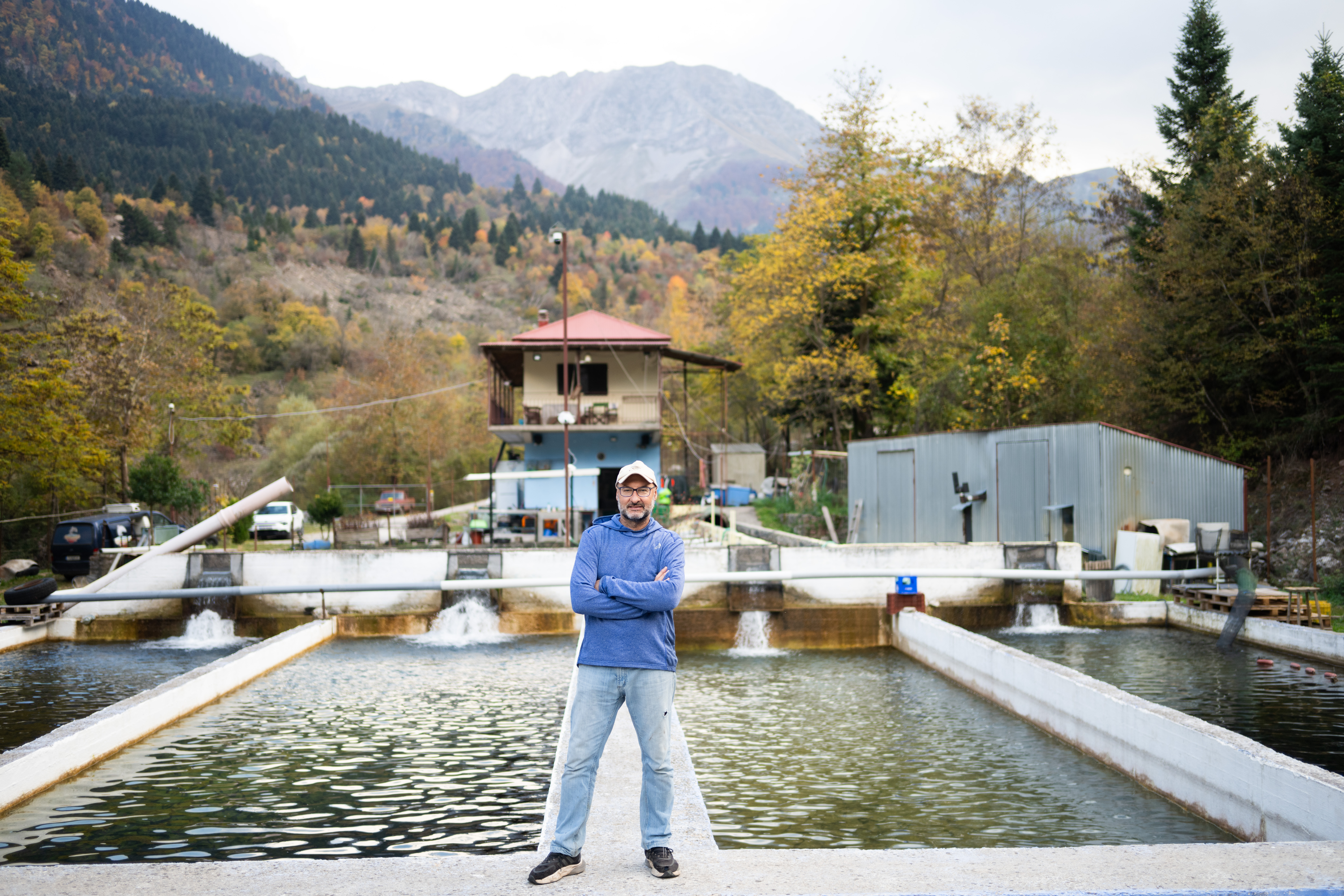 Ο Γιώργος Καλλός μας περιμένει στην είσοδο. Η στάση του σώματός του μαρτυρά την οικειότητα ενός ανθρώπου που βρίσκεται στο φυσικό του περιβάλλον. Η ιστορία του είναι μια ιστορία αντίστροφης πορείας: από την Αθήνα και τις σπουδές γεωπονίας, επέλεξε να επιστρέψει στην ορεινή Ελλάδα, όχι στα οικεία Τρίκαλα της νεότητάς του, αλλά στην Αθαμανία, ένα ορεινό μικρό και σχετικά απομονωμένο χωριό, με ήπια τουριστική ανάπτυξη, σε υψόμετρο 1.000 μέτρων. «Οι σπουδές στη ζωική παραγωγή μου έδωσαν τη θεωρητική βάση» μας εξηγεί καθώς περπατάμε δίπλα στις δεξαμενές, «αλλά η καθημερινή επαφή με τα ψάρια είναι ένα διαφορετικό σχολείο». Από το 2004, κάθε πρωινό τον βρίσκει εδώ, να παρατηρεί, να φροντίζει, να μαθαίνει.