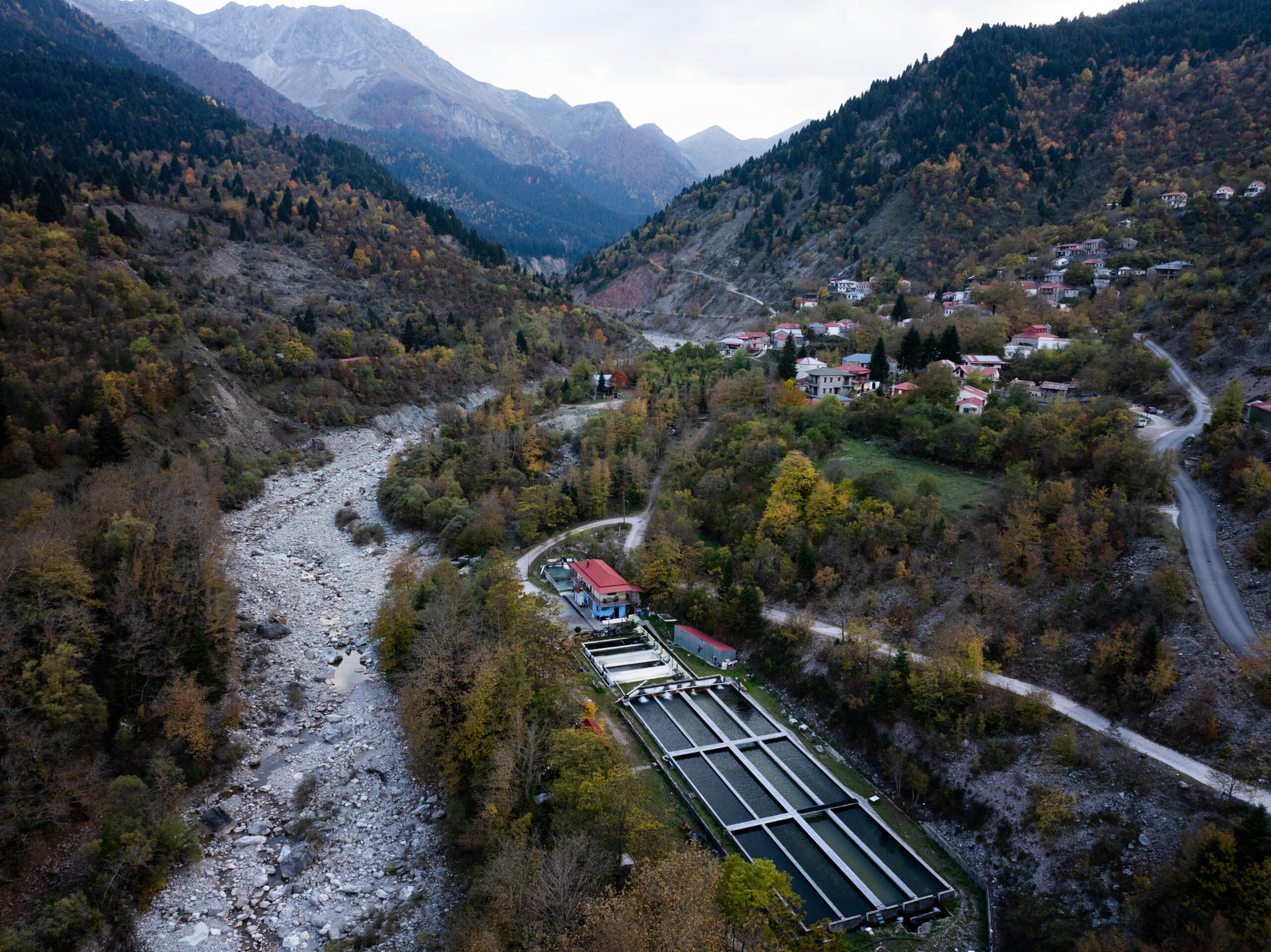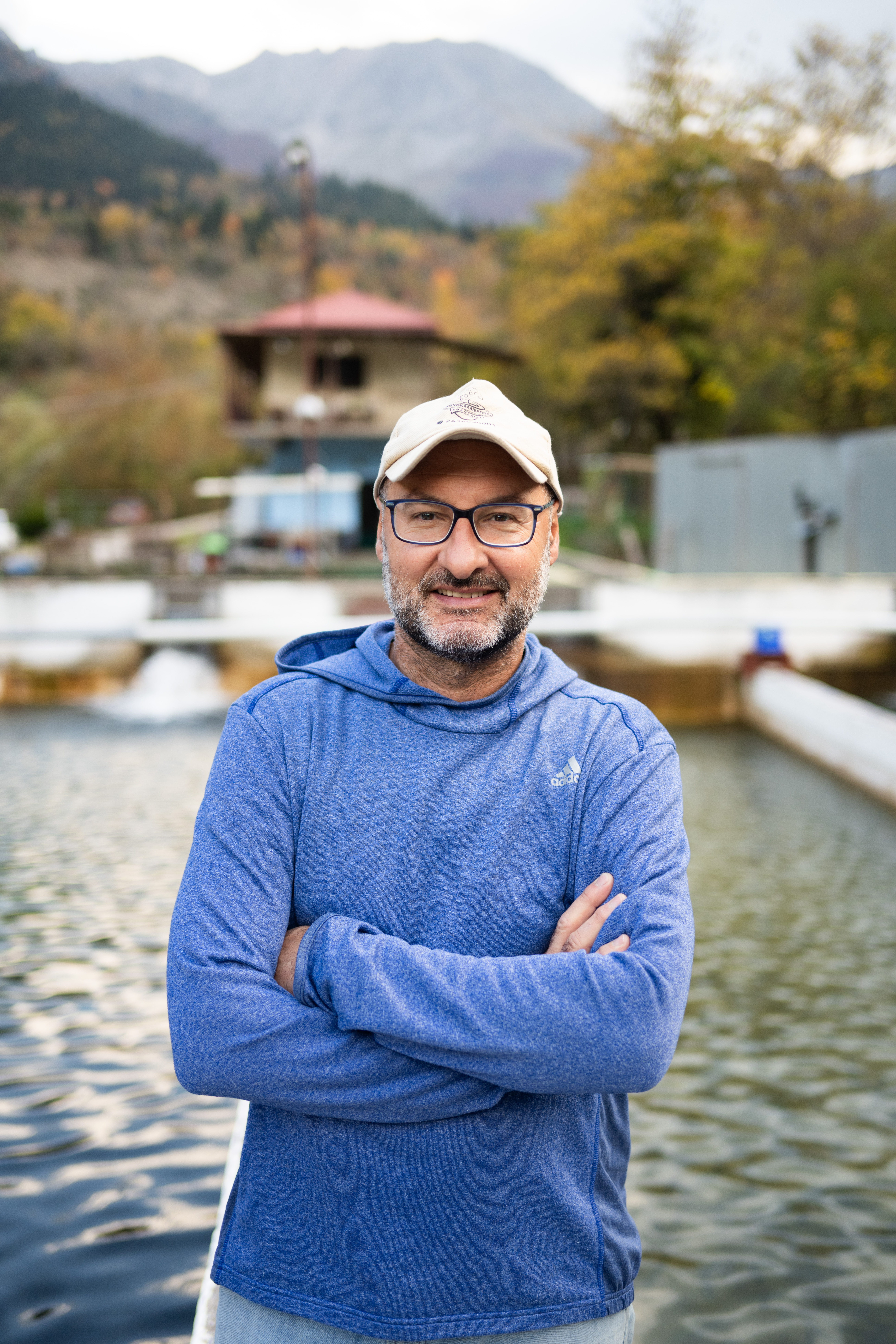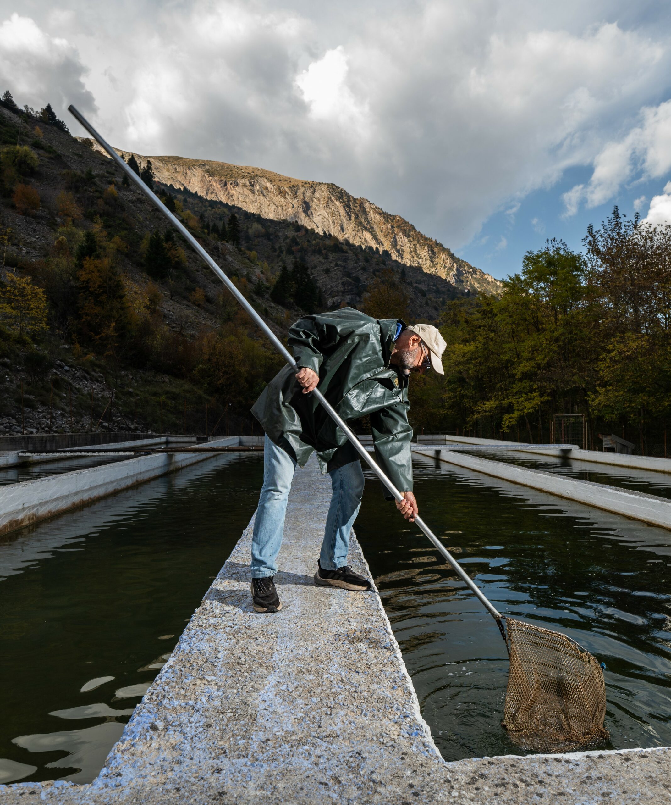Ο Γιώργος Καλλός μας περιμένει στην είσοδο. Η στάση του σώματός του μαρτυρά την οικειότητα ενός ανθρώπου που βρίσκεται στο φυσικό του περιβάλλον. Η ιστορία του είναι μια ιστορία αντίστροφης πορείας: από την Αθήνα και τις σπουδές γεωπονίας, επέλεξε να επιστρέψει στην ορεινή Ελλάδα, όχι στα οικεία Τρίκαλα της νεότητάς του, αλλά στην Αθαμανία, ένα ορεινό μικρό και σχετικά απομονωμένο χωριό, με ήπια τουριστική ανάπτυξη, σε υψόμετρο 1.000 μέτρων. «Οι σπουδές στη ζωική παραγωγή μου έδωσαν τη θεωρητική βάση» μας εξηγεί καθώς περπατάμε δίπλα στις δεξαμενές, «αλλά η καθημερινή επαφή με τα ψάρια είναι ένα διαφορετικό σχολείο». Από το 2004, κάθε πρωινό τον βρίσκει εδώ, να παρατηρεί, να φροντίζει, να μαθαίνει.