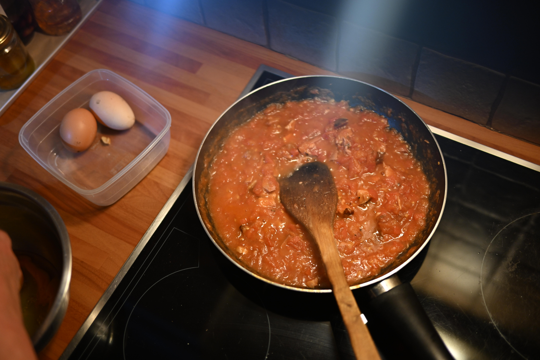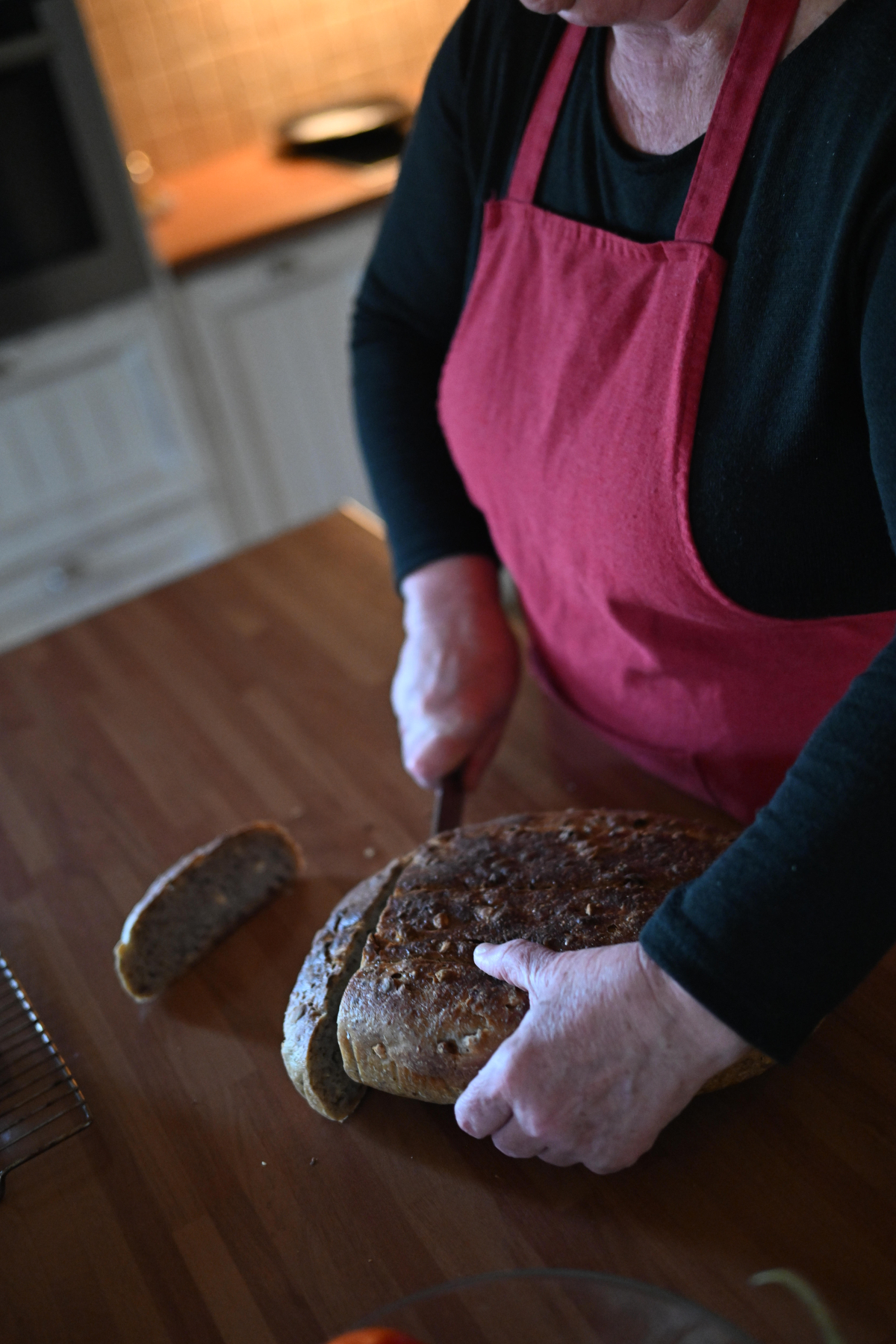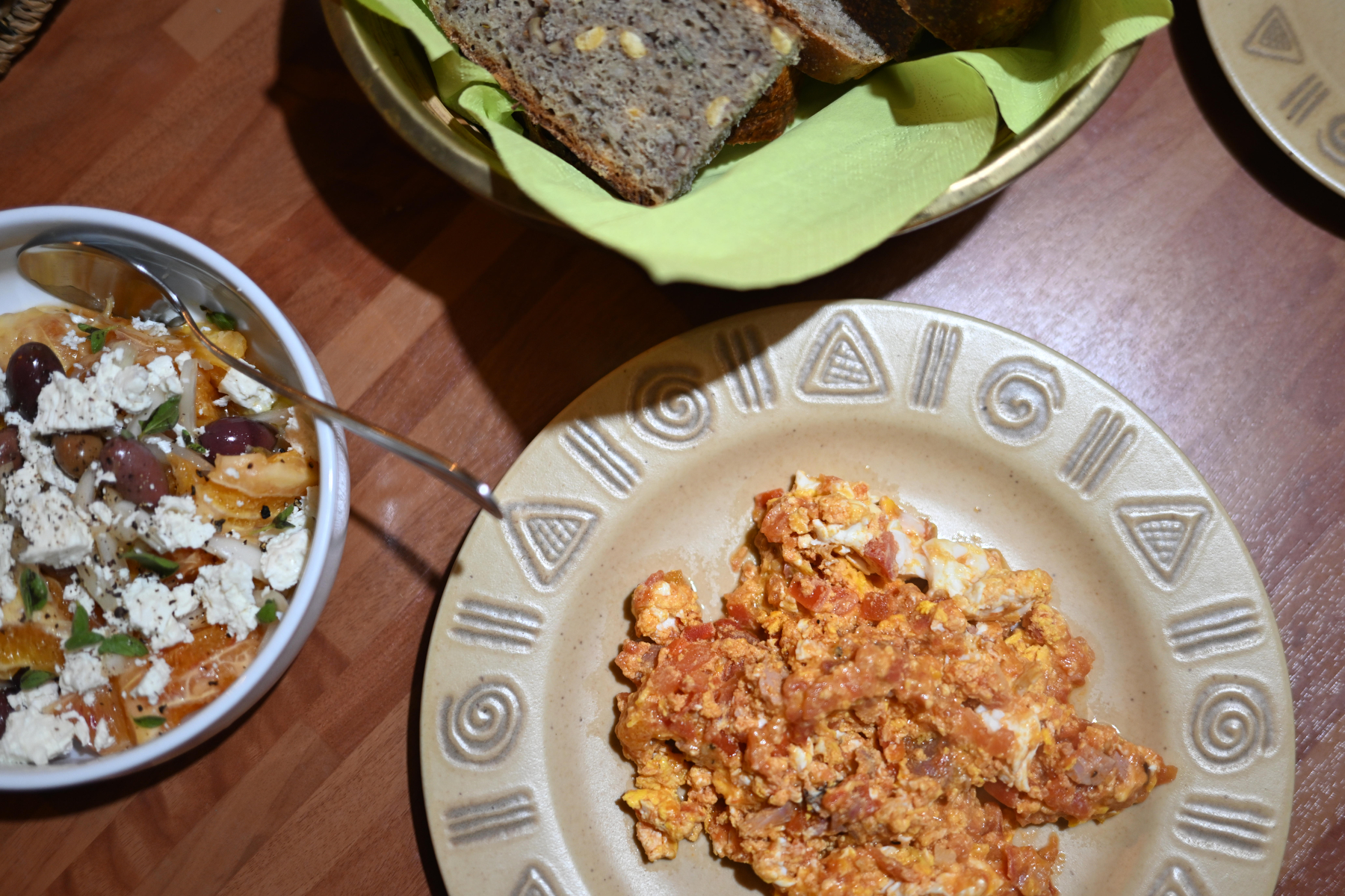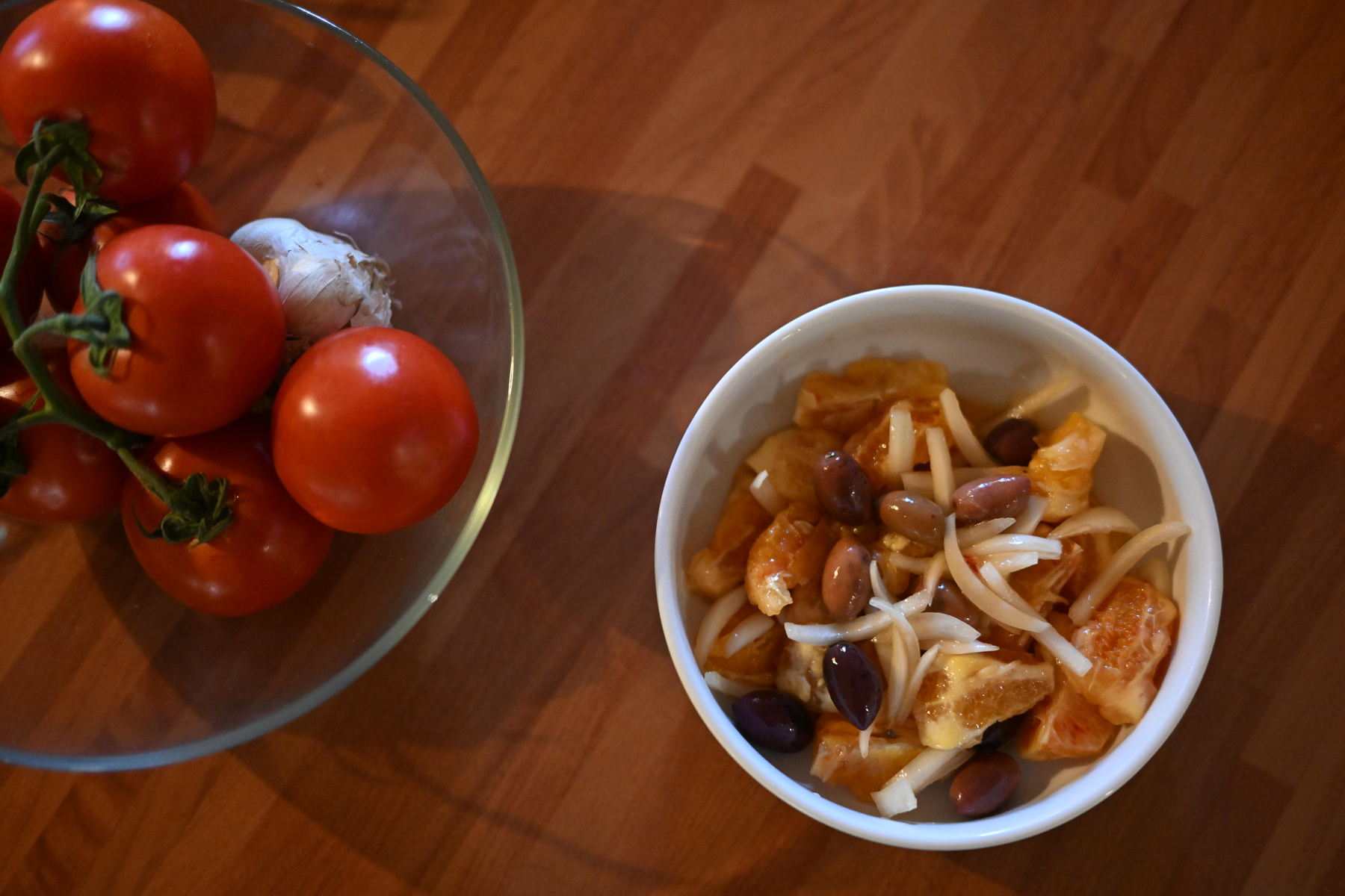 Το πιάτο που ετοιμάζουν είναι απλό στη σύλληψη, πολύπλοκο στην ιστορία του: καγιανάς με παστό και τριμμένη ντομάτα. «Αυτό είναι ένα έδεσμα που αξίζει πραγματικά να δοκιμάσει κανείς όταν βρεθεί στην περιοχή», εξηγεί η Νατάσα, ενώ τα χέρια της κινούνται με χάρη και ακρίβεια. Παράλληλα, δημιουργούν μια τοπική σαλάτα που είναι ποίημα χρωμάτων και γεύσεων: φέτες πορτοκαλιού που λάμπουν σαν μικροί ήλιοι, μαύρες ελιές Καλαμών που κρύβουν όλη τη γεύση της μεσογειακής γης, και λευκά τεμάχια κρεμμυδιού που δίνουν την αναγκαία πικάντικη νότα. Το ψωμί που συνοδεύει όλα αυτά είναι προσμένιο, ζυμωμένο με τον παραδοσιακό τρόπο, χρυσό και τραγανό.