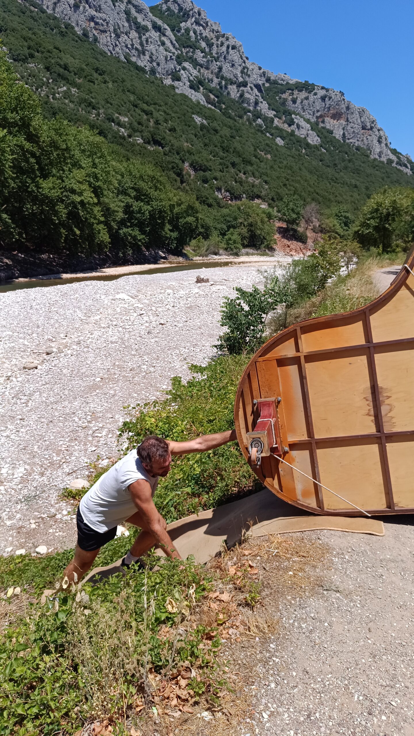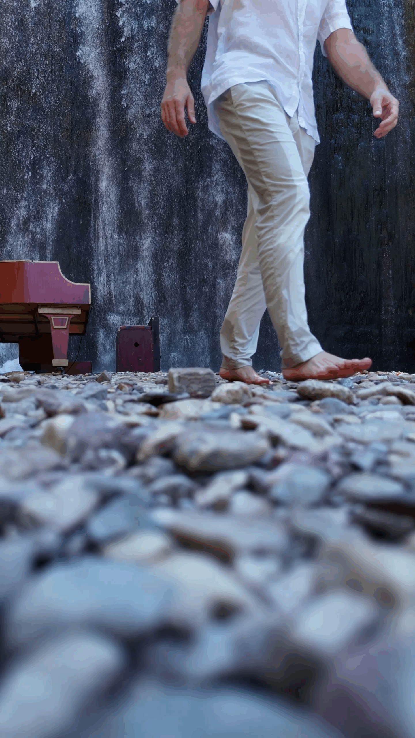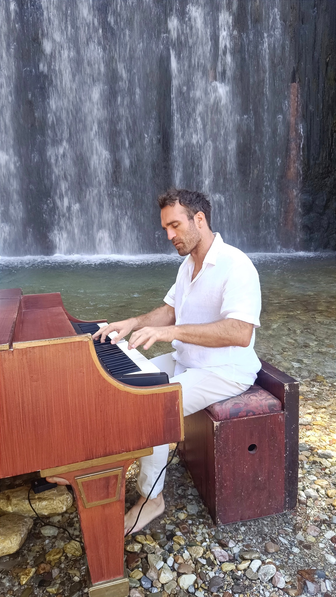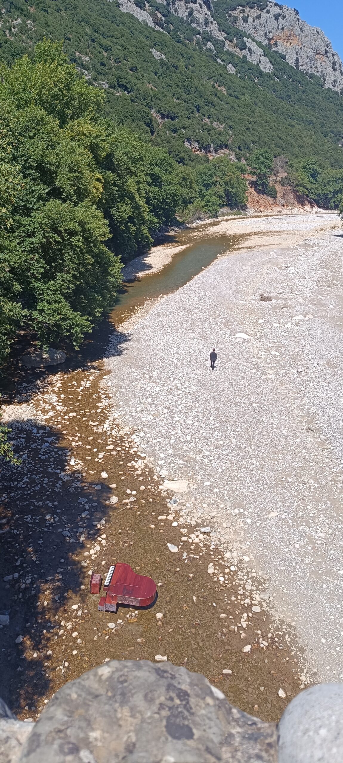«Αρχές Ιούλη του ‘24. Στους καταρράκτες της Παλαιοκαρυάς, κοντά στα Τρίκαλα. Καταμεσήμερο. Λίγο πιο μακριά από το σημείο που το πιάνο θα ακουμπούσε το σώμα του, σταματάει ένα αυτοκίνητο. Βλέπω έναν ηλικιωμένο άνθρωπο να βγαίνει αργά αργά από αυτό και να περπατάει κουτσαίνοντας ελαφρά προς το μέρος μας στηριζόμενος στην ξύλινη μαγκούρα του. «Τι κάνετε;» τον ρώτησα χαρούμενος. Με κοιτούσε αλλά δεν απαντούσε. «Γιατί έρχεστε εδώ;». Δεν μπορούσε να μιλήσει με ευκολία. Είχε τραχειοτομία. Άνοιγε το στόμα του αργά και σταθερά για να καταλαβαίνω τις σχεδόν άηχες λέξεις του. Ο ήχος από τα νερά του καταρράκτη θα έντυνε κάθε γράμμα της φράσης του: «Επειδή δε μιλάω έρχομαι εδώ. Μου αρέσει να ακούω. Το νερό. Μου αρέσει να ακούω το νερό». Του έδειξα το πιάνο. «Έλα κάτσε εδώ!». «Μπορώ;» με ρώτησε. «Για σένα είναι το πιάνο εδώ. Σε περίμενε». Τα μάτια του χαμογέλασαν. «Είναι βαρύ το πιάνο;» με ρώτησε. «Έχω συνηθίσει» του είπα. «Είσαι κουρασμένος;» τον ρώτησα. «Ναι. Αλλά μου αρέσει εδώ. Ξεκουράζομαι εδώ!».