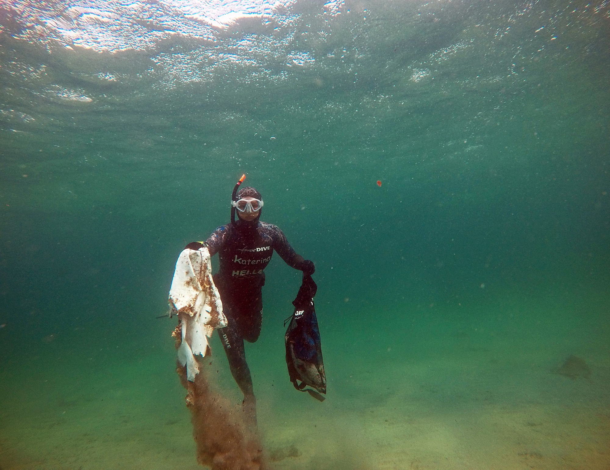 Ακολουθώ πιστά τις οδηγίες της για μια πιο πολύωρη άπνοια κάτω από το νερό αλλά η υποβρύχια φωτογράφηση και βιντεοσκόπηση του καθαρισμού, με συνεχές κράτημα της αναπνοής, διαρκείς καταδύσεις και αναδύσεις, ξανά και ξανά, δεν είναι και το ευκολότερο πράγμα. Η ανάσυρση όμως αμέτρητων σκουπιδιών, σακιών γεμάτων με άμμο, υπερμεγεθών σχοινιών αλλά και ενός ελαστικού από τετράτροχη «γουρούνα», αναζητά την μεγαλύτερη προσπάθεια, τις πιο βαθιές ανάσες, είναι το κίνητρο για καθαρές θάλασσες, βοηθά στην συνειδητοποίηση της έκτασης του προβλήματος, αλλά και επιβραβεύει ψυχικά με τη θέα του «βουνού» από σκουπίδια που μπορεί κανείς να συλλέξει μέσα σε λίγη ώρα δράσης.