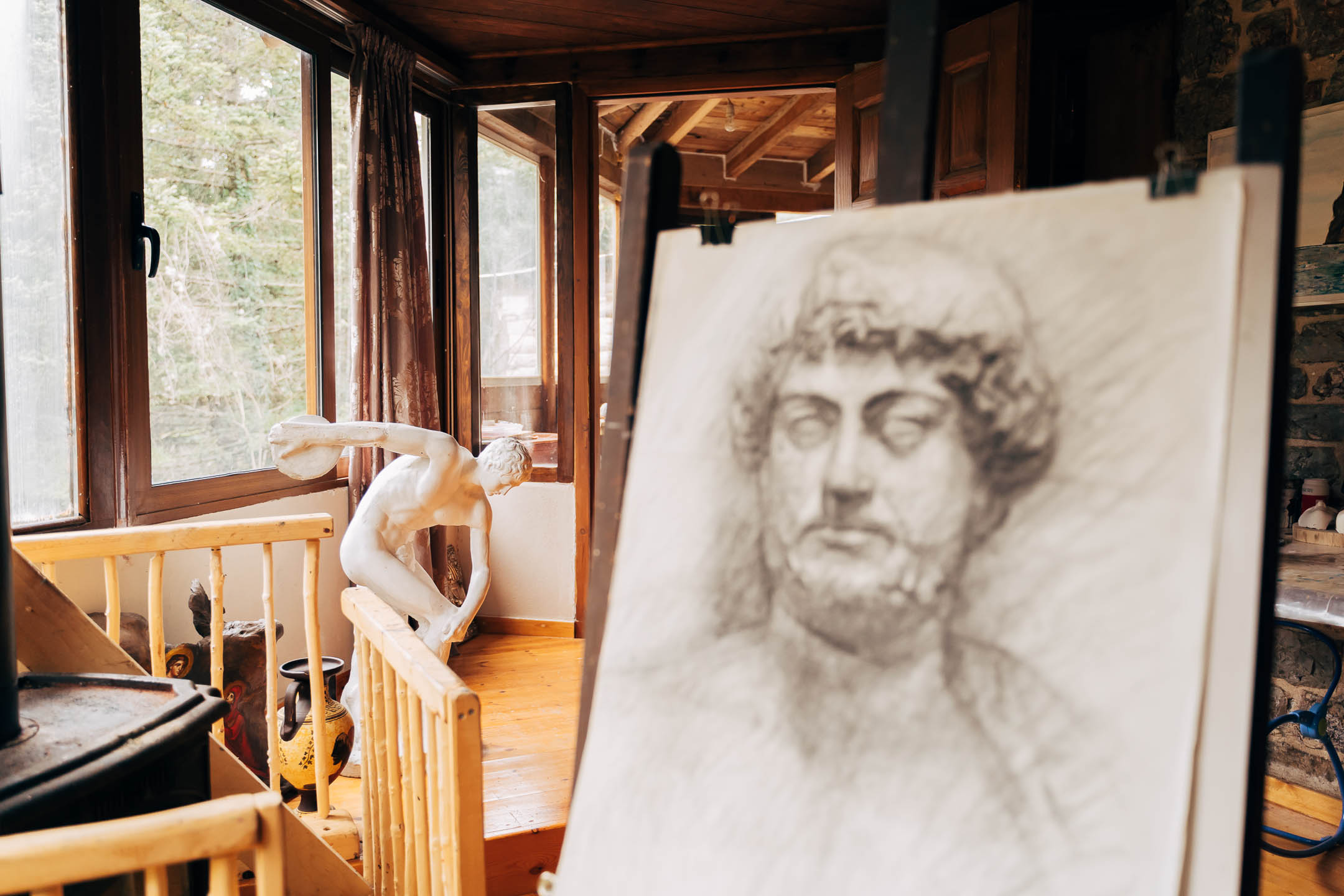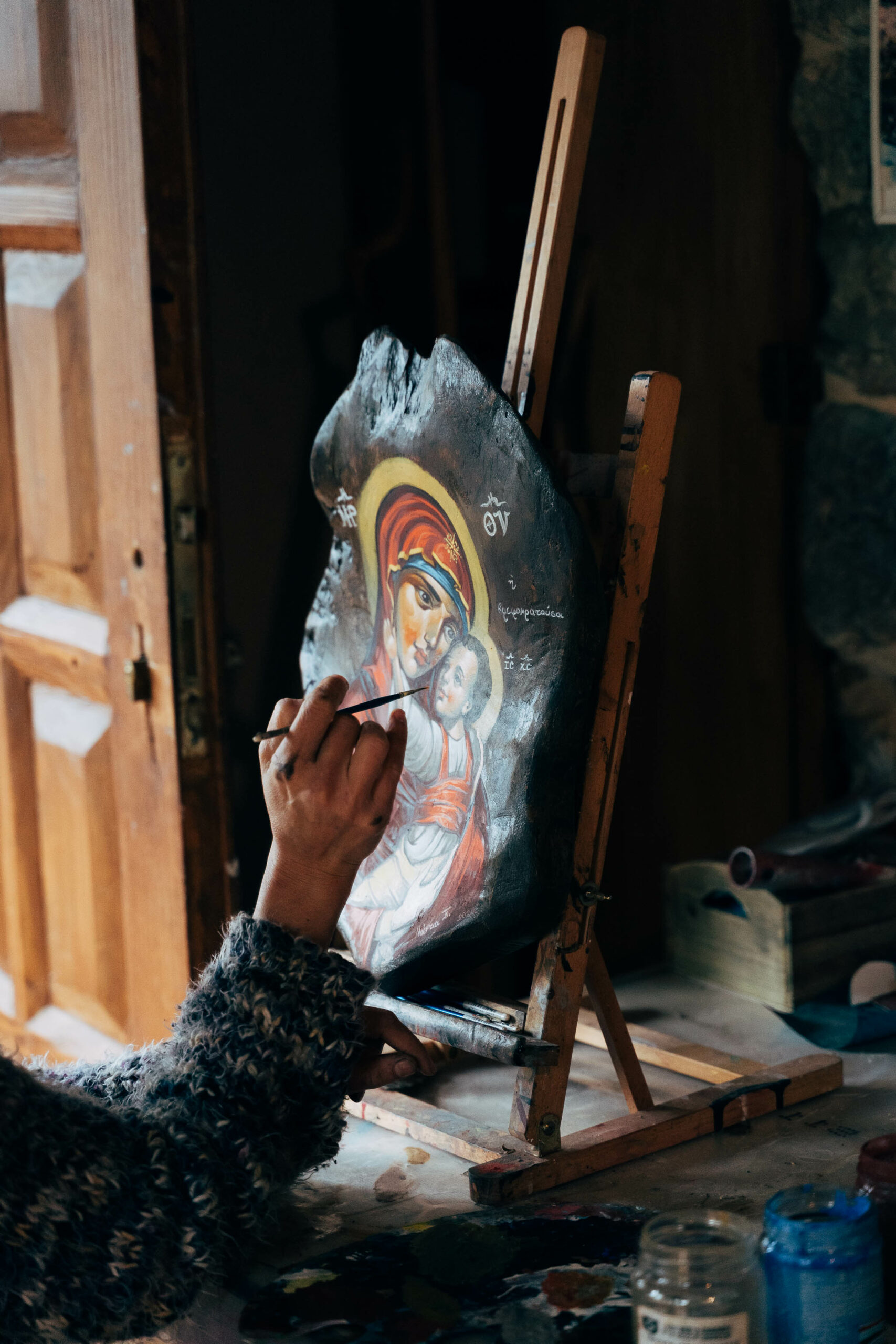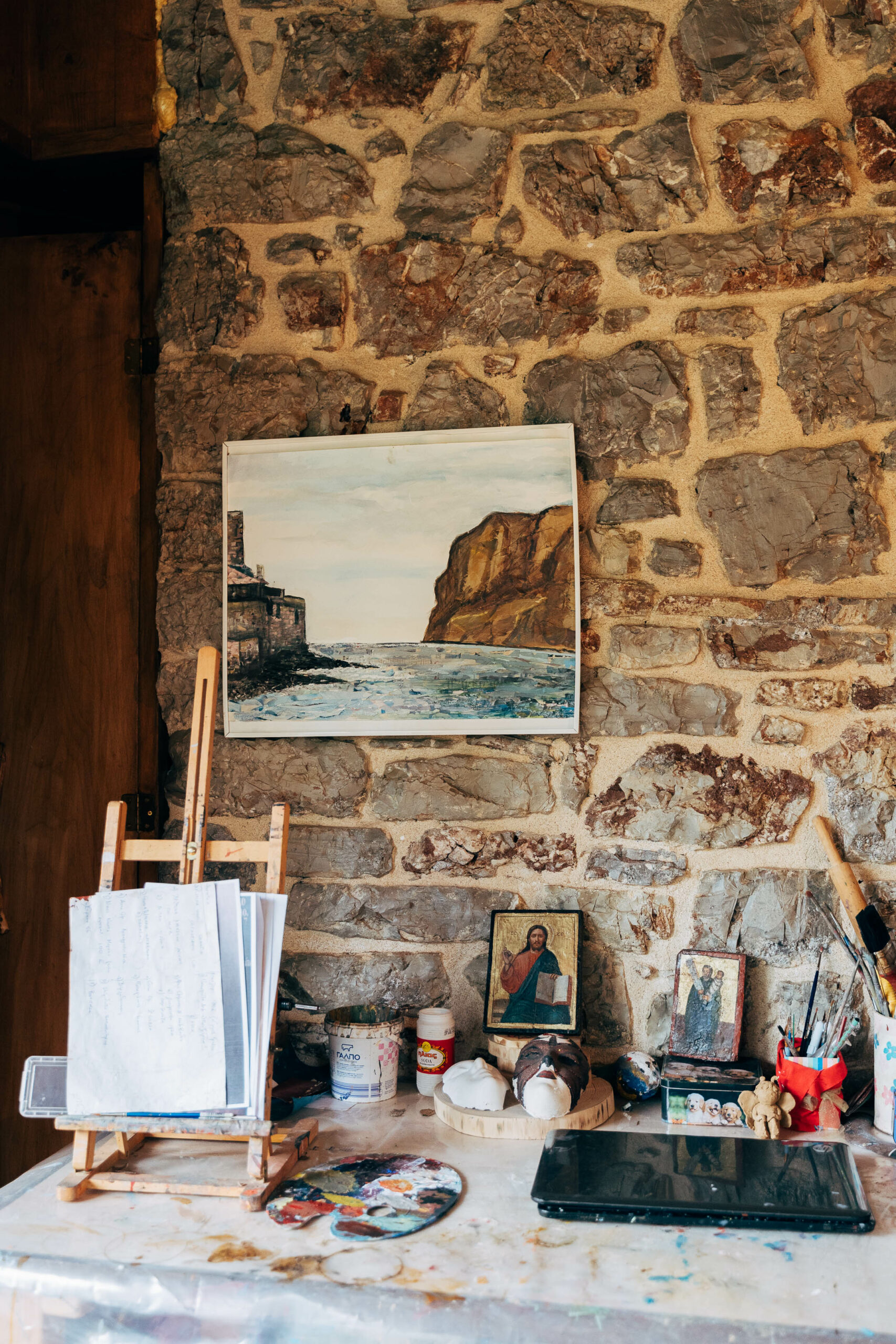 Κάτι τέτοιο ήταν αυτό που συνέβη όταν η Νάντια Παπαδοπούλου, μας υποδέχτηκε στο εργαστήριο αγιογραφίας σε μία πλαγιά του Μαινάλου, με θέα το ελατόδασος. Αρχικά να πω, ότι φθάσαμε εκεί, χωρίς να μας περιμένει αλλά και χωρίς εμείς να ξέρουμε πού πηγαίνουμε. Ήταν περισσότερο μία φθινοπωρινή βόλτα στα βουνά της Αρκαδίας.