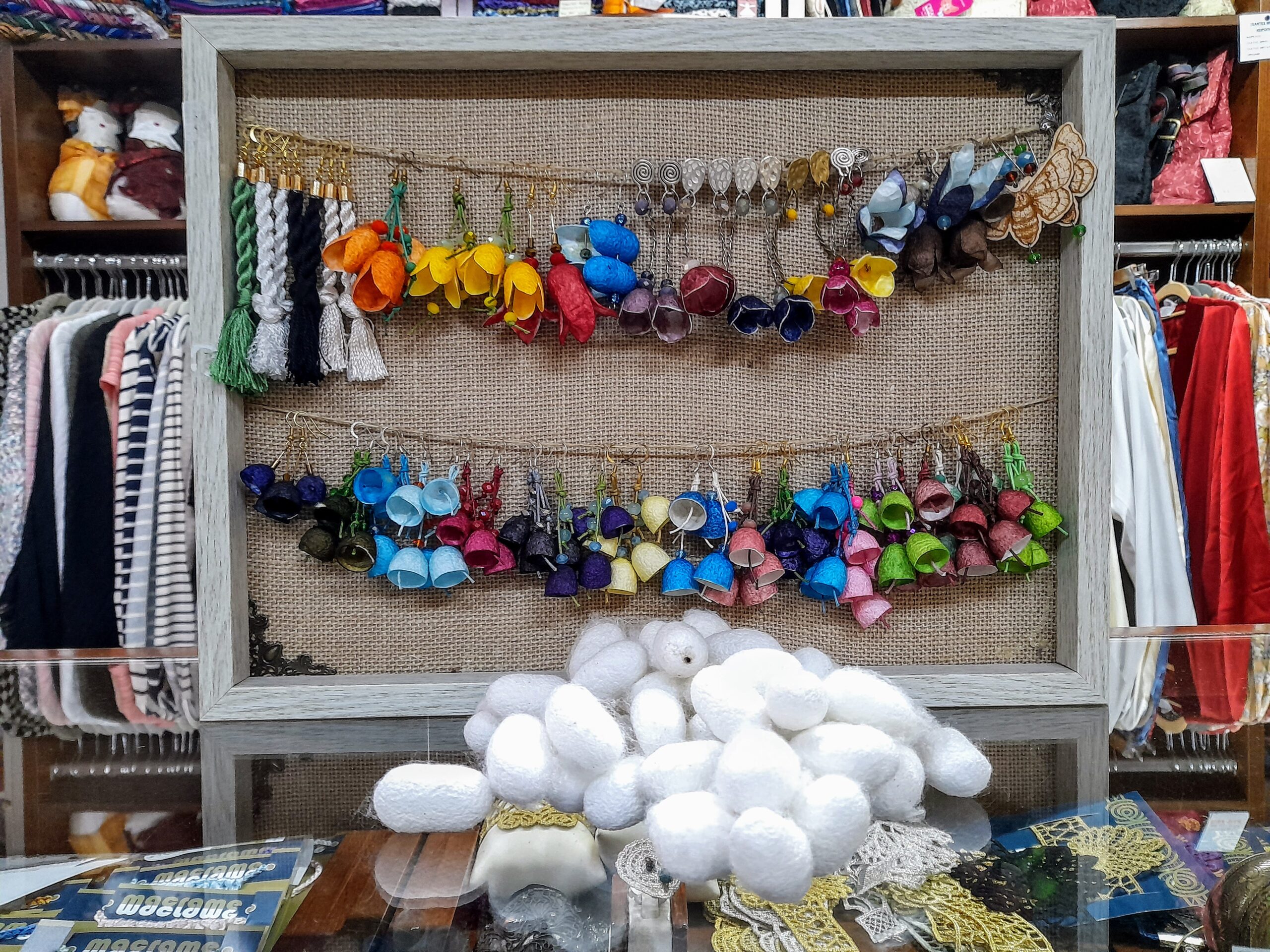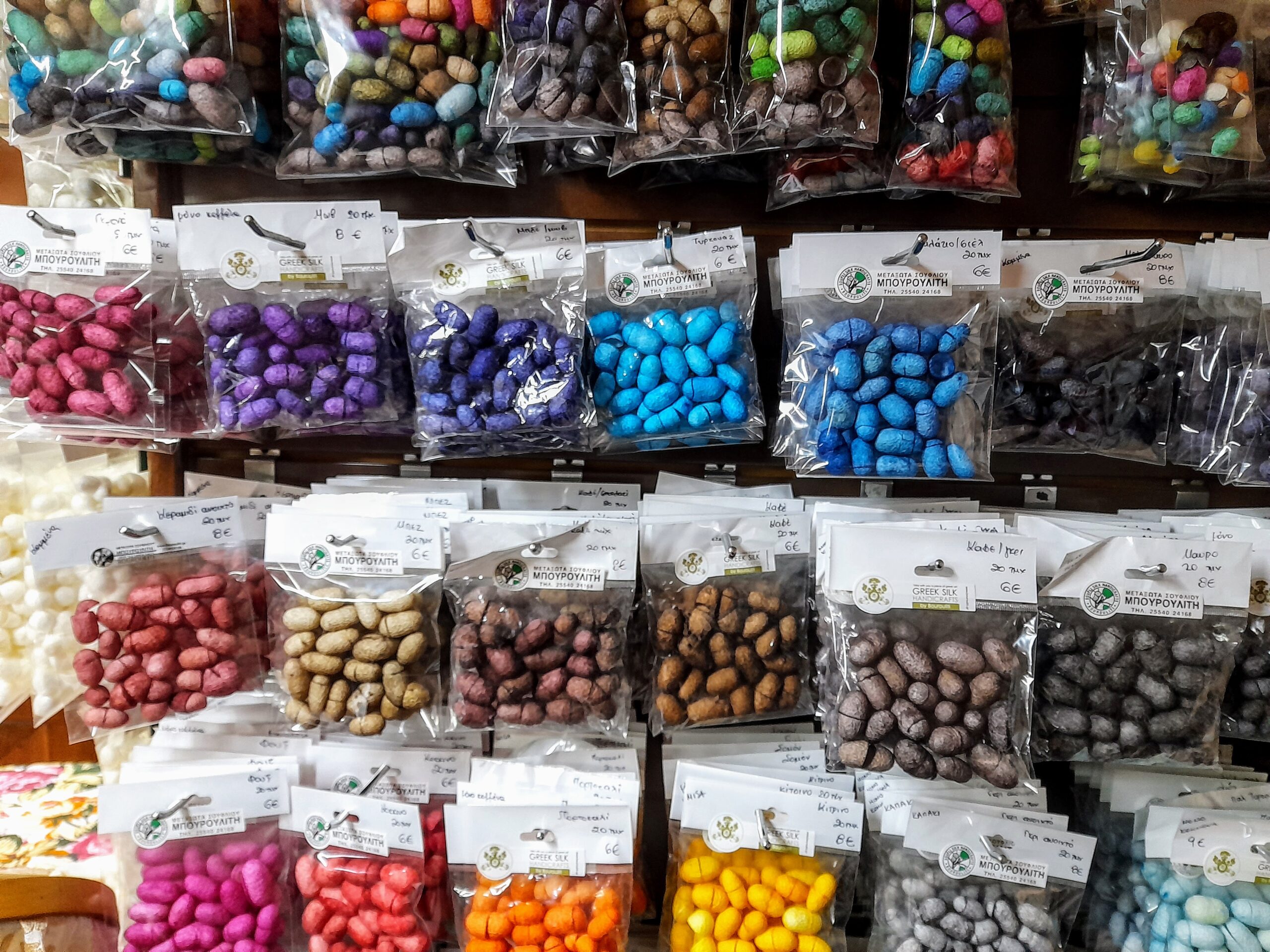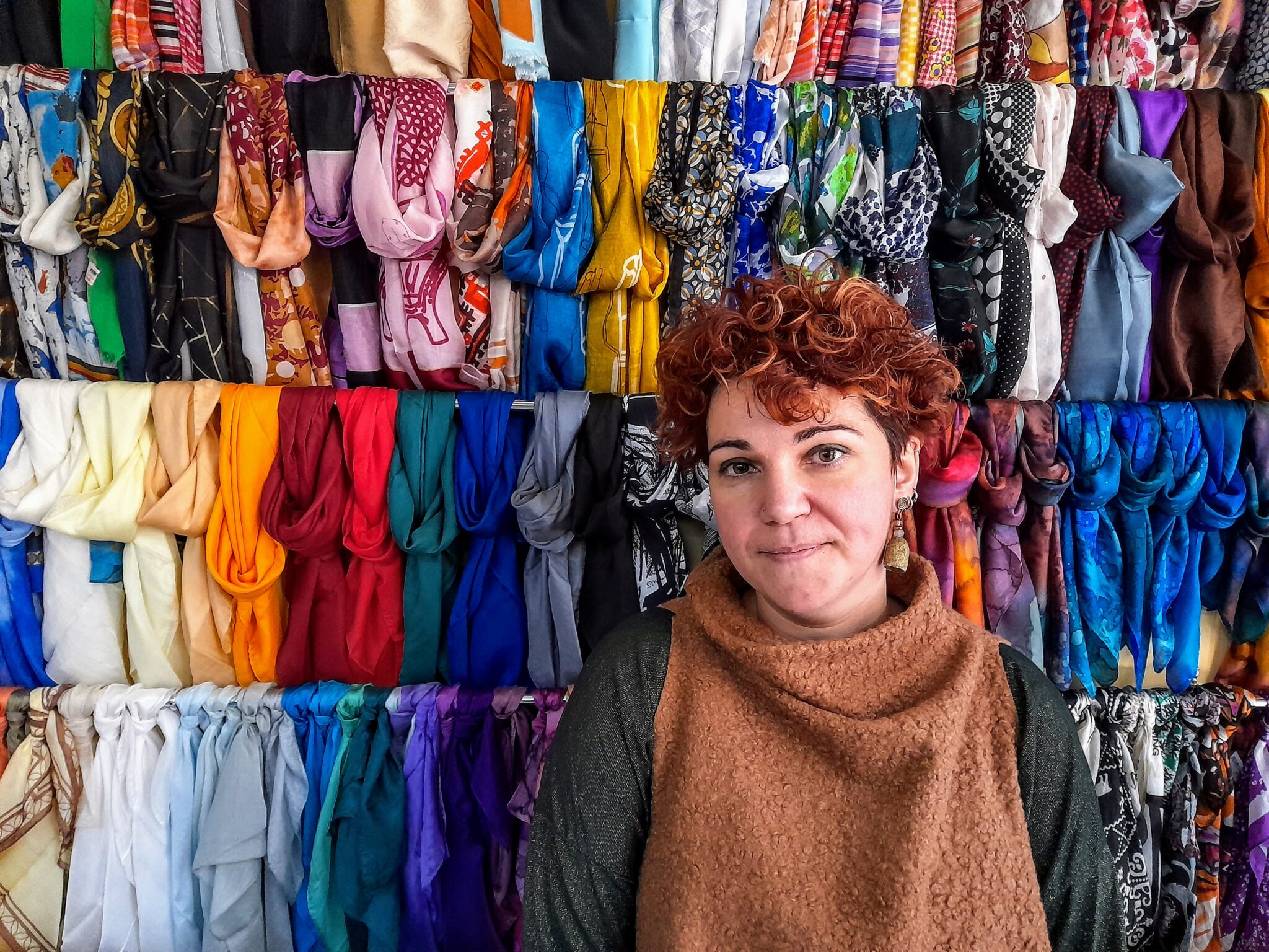 «Σπούδασα εφαρμοσμένες τέχνες και ζωγραφική με δασκάλους εξαιρετικούς καλλιτέχνες όπως ο Νίκος Ναυρίδης, η Κατερίνα Αποστολίδου και ο Τάσος Μισούρας και πολλοί ακόμα που ο καθένας έδωσε και κάτι διαφορετικό στη δουλειά μου. Μετά ακολούθησε το μεταπτυχιακό μου στο Λονδίνο ,στις οπτικές τέχνες και στην ιχνογραφία. Δούλεψα πολύ με πινέλα, με μελάνια, με εγκαταστάσεις, performance, video art και φωτογραφία. Ένα συνεχόμενο ταξίδι στην εικαστική τέχνη. Στην τέχνη που είναι ζωή, στη ζωή που είναι τέχνη. Στο ενδιάμεσο η ποίηση και τα βελόνια, ράψιμο και σχέδιο μόδας. Όλα δένουν το ένα με το άλλο μέσα από ένα χέρι που δημιουργεί» μας λέει, απλώνοντας στον πάγκο μαντήλες, φουλάρια, με θέματα που φέρουν την υπογραφή της ή κοσμήματα και στέφανα γάμου από κουκούλια που η ίδια με μεράκι κατασκεύασε.