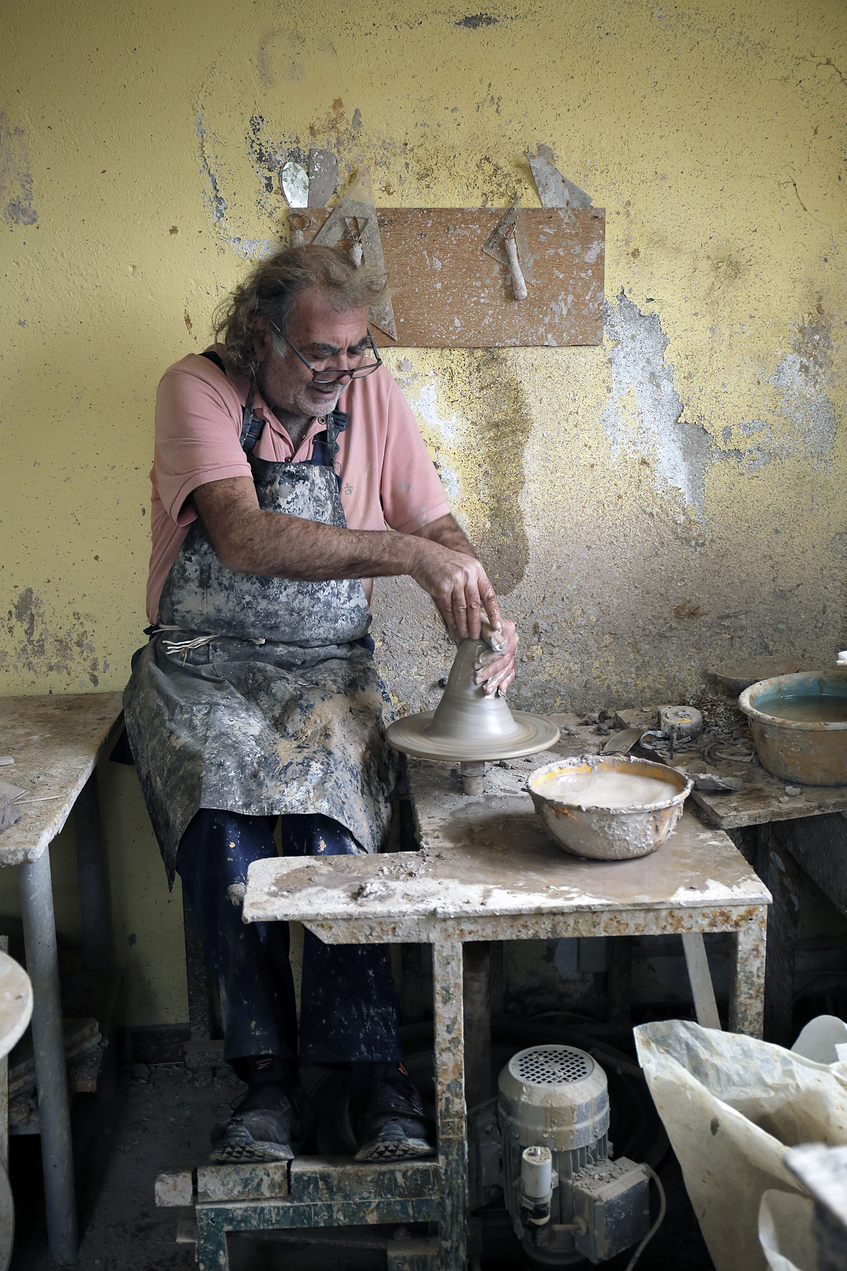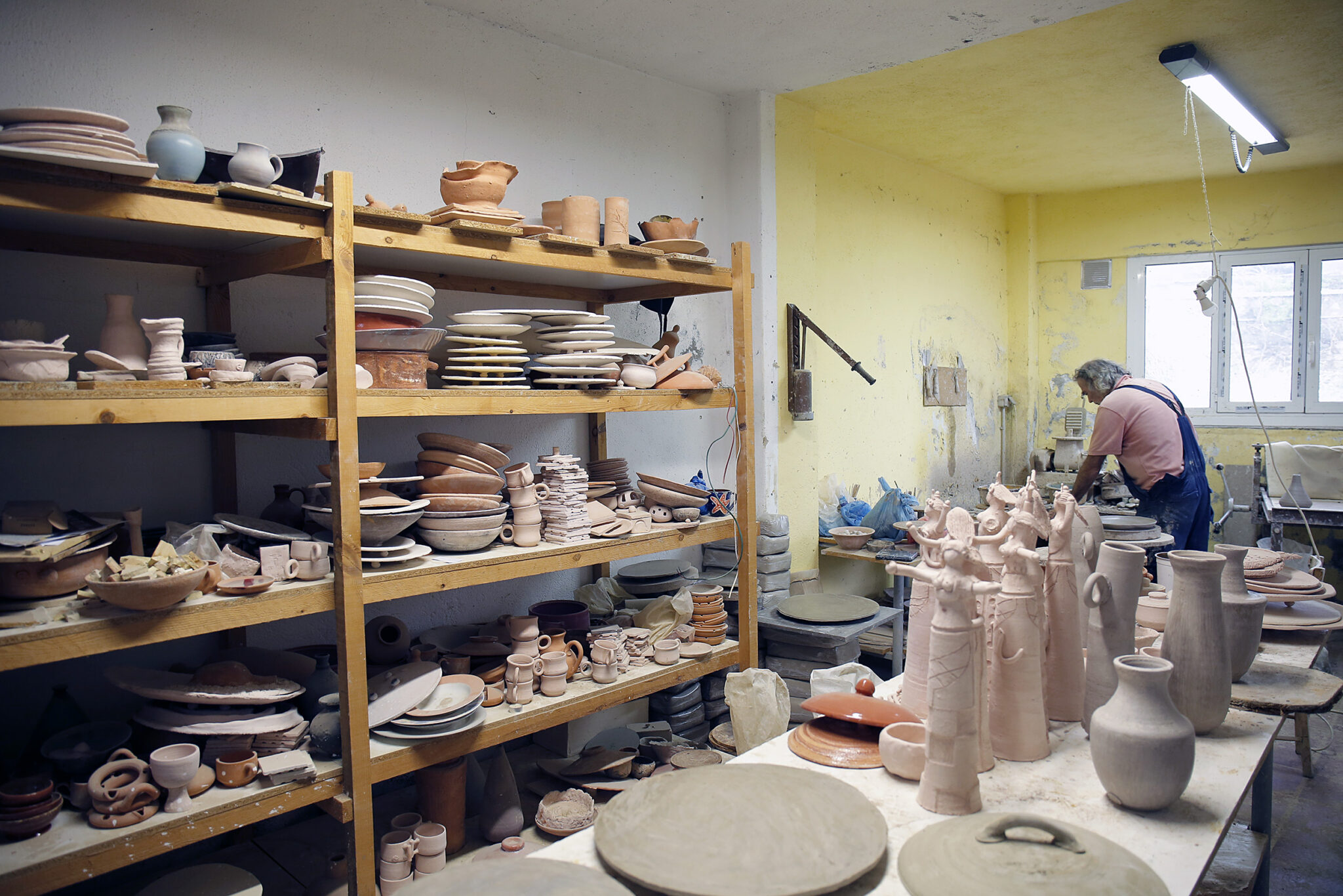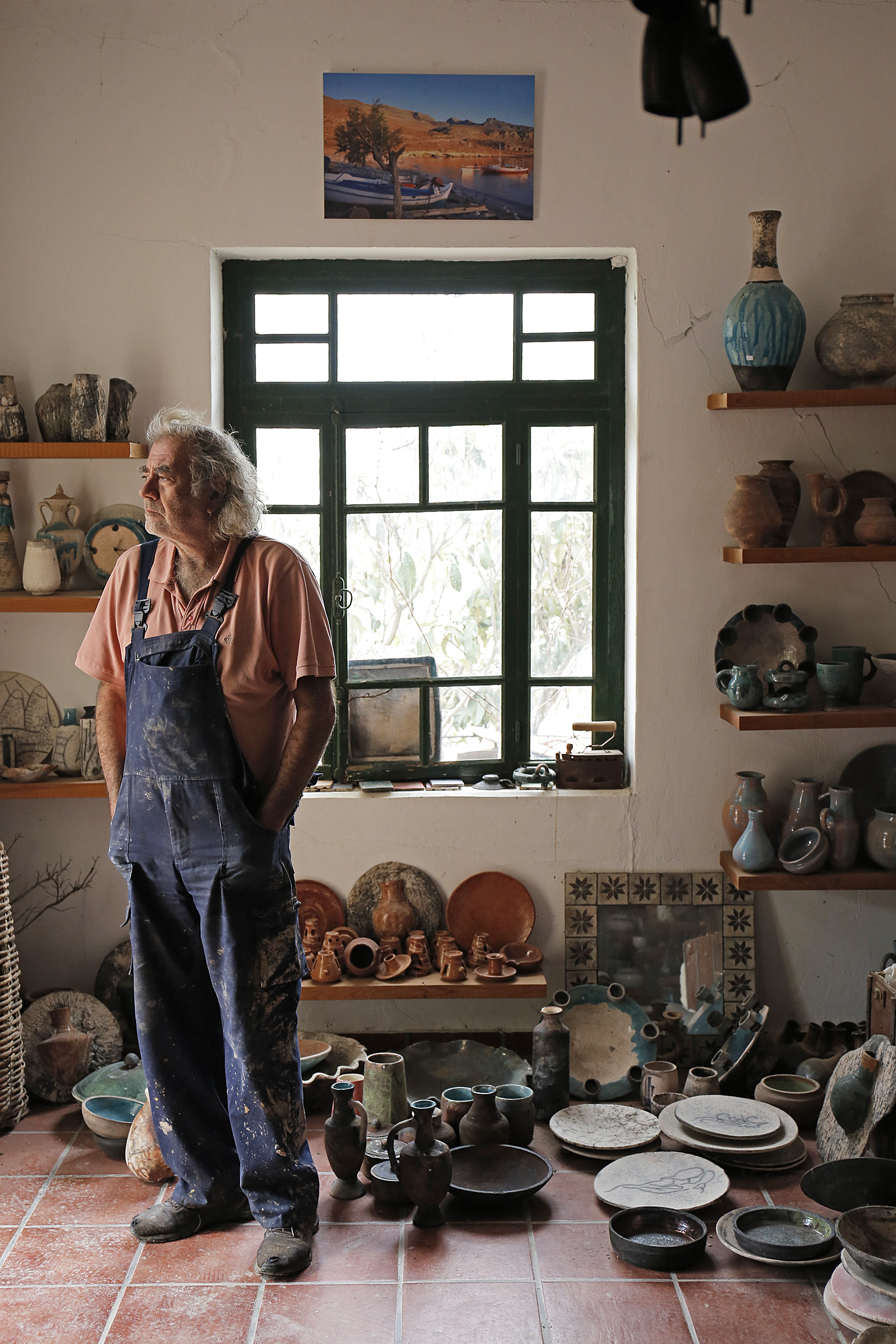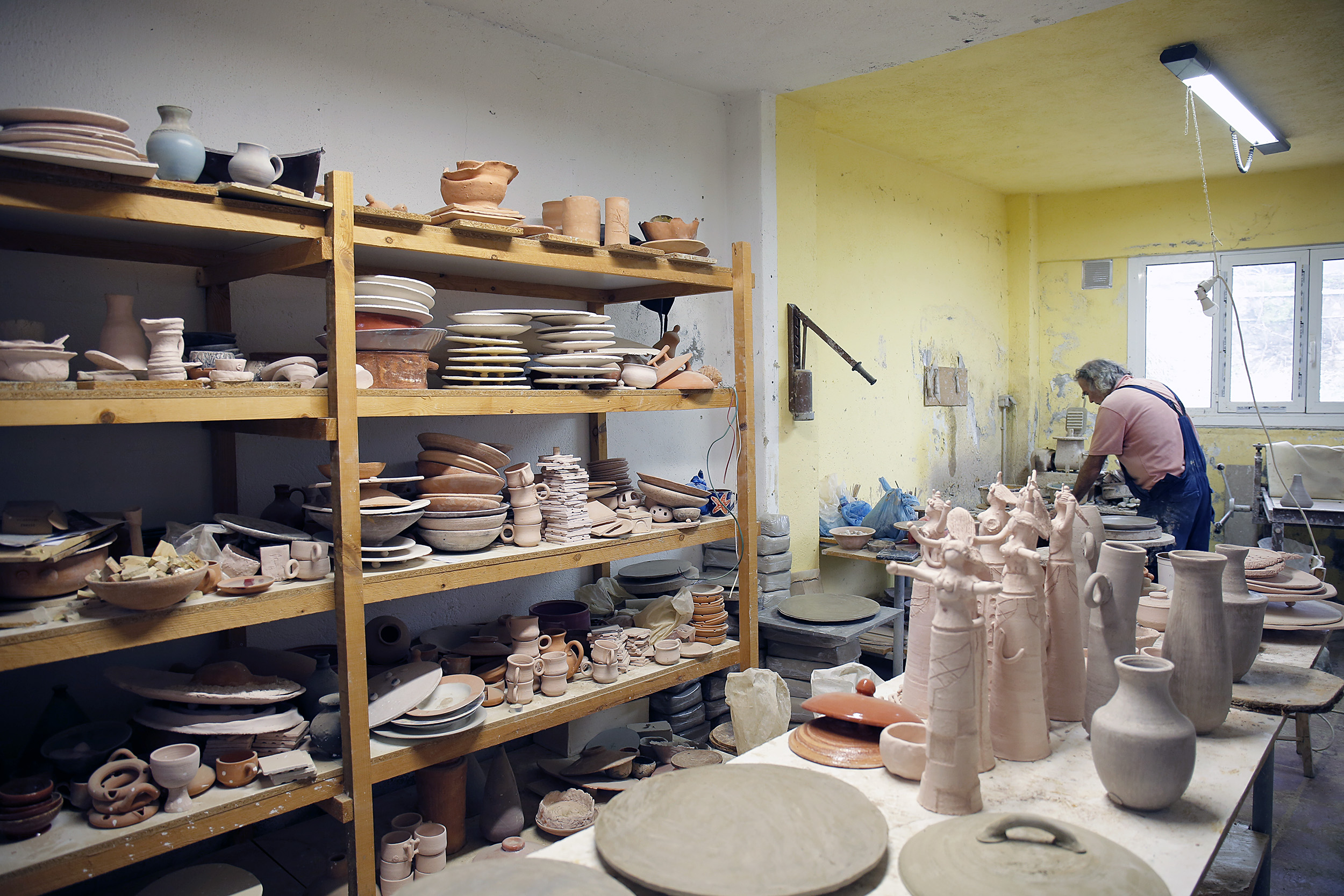 Πριν προλάβω να χωνέψω τον βομβαρδισμό εικόνων, ανοίγει η πόρτα και ο Νίκος, φορώντας μια φόρμα εργασίας, γυαλιά κατεβασμένα χαμηλά στη μύτη και με χέρια ντυμένα στον πηλό, με καλωσορίζει με καλοσύνη. Η Κρήτη μου προκαλεί, κάθε φορά που την επισκέπτομαι, ένα παράξενο, επαναλαμβανόμενο συναίσθημα. Κάθε πόρτα που ανοίγει, κάθε νεύμα πρόσκλησης, κάθε άνθρωπος που γνωρίζω για πρώτη φορά, μου προκαλούν μια απότομη οικειότητα, μια σχεδόν αυτονόητη ασφάλεια πως κάτι καλό και συνάμα παράξενο ήρθα να συναντήσω εδώ. Έτσι ακριβώς και στο εργαστήριο κεραμικής που μόλις ξεκίνησα να παρατηρώ. Κούπες, πιάτα, βάζα κάθε απόχρωσης και τεχνοτροπίας, διακοσμητικά τοίχου αλλά και ειδώλια μινωικής έμπνευσης, υαλωμένα, περίτεχνα αλλά και γήινης υφής δημιουργήματα γεμίζουν το χώρο. Η ησυχία της τοποθεσίας αλλά και το αδύναμο φως που μπαίνει από τα παράθυρα, είναι το καλύτερο σκηνικό για να πούμε ιστορίες.