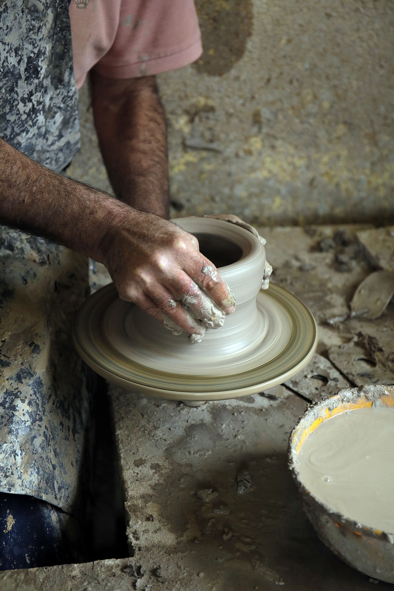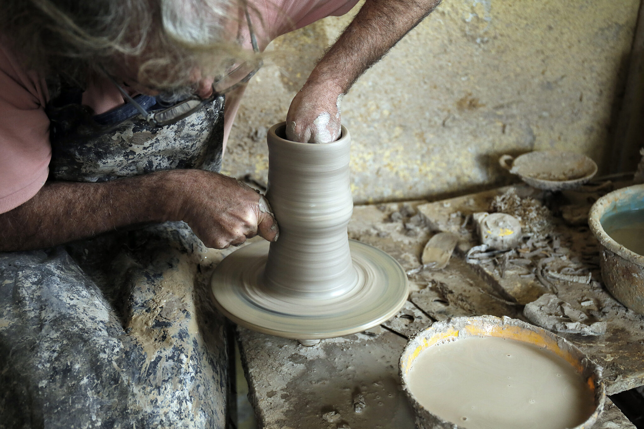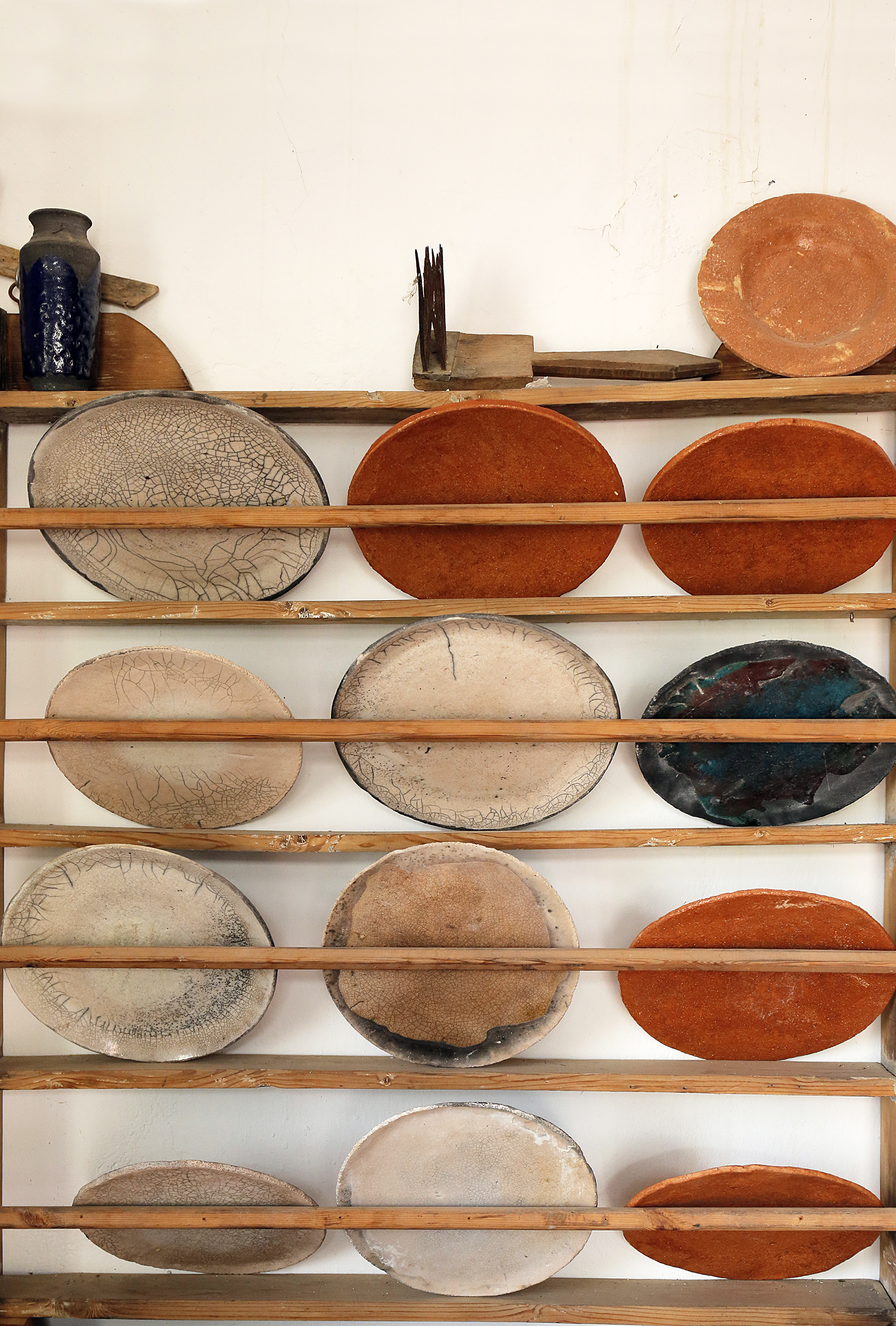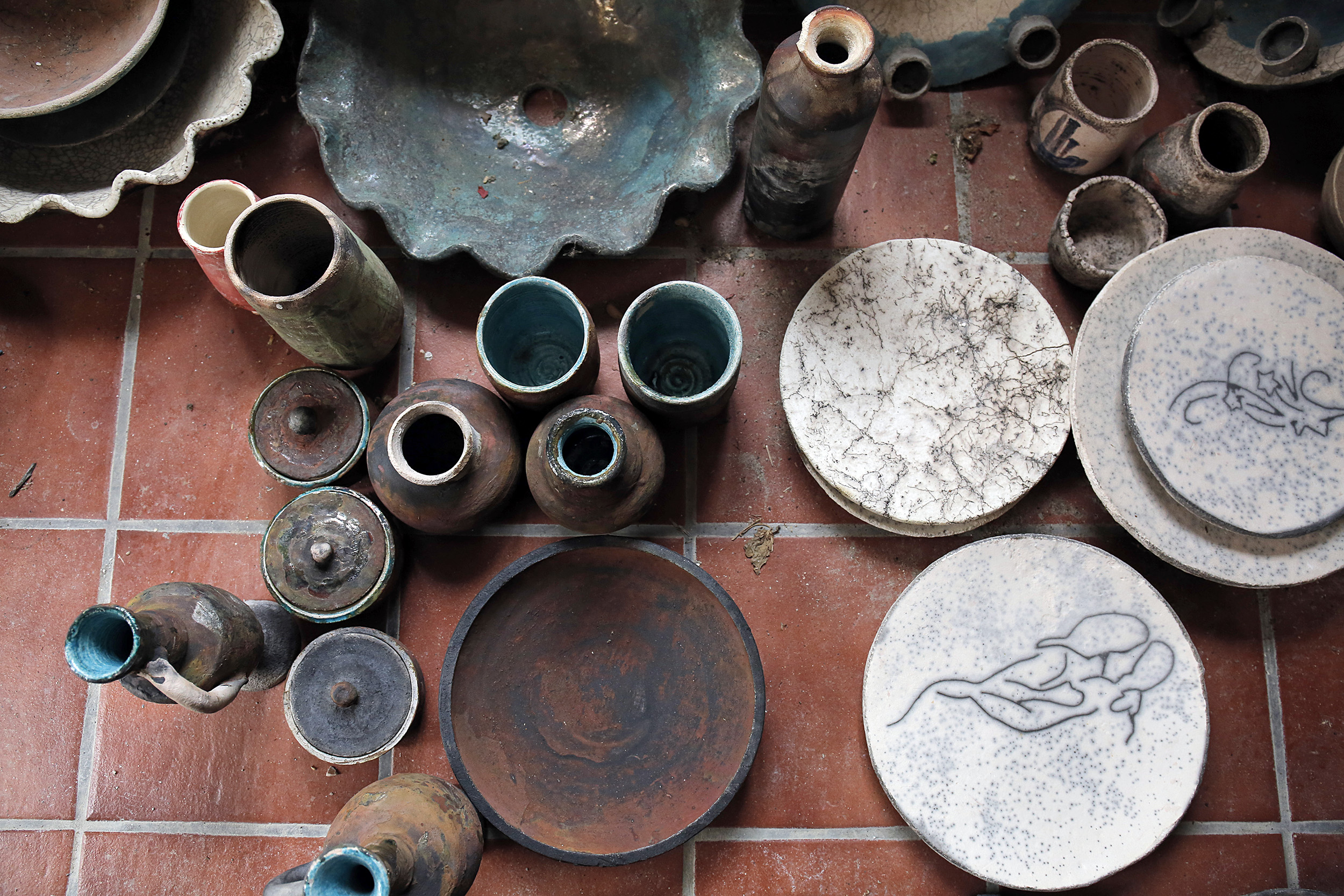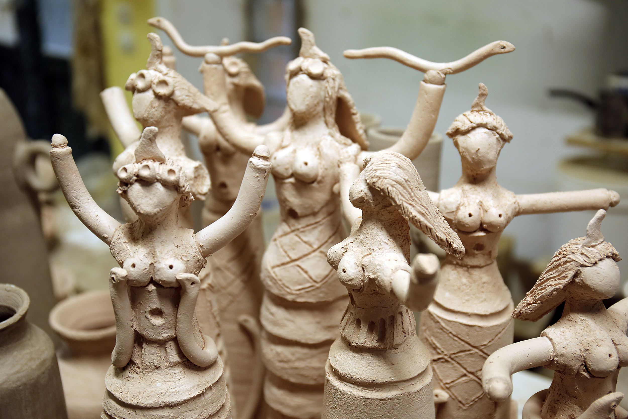 Πριν προλάβω να χωνέψω τον βομβαρδισμό εικόνων, ανοίγει η πόρτα και ο Νίκος, φορώντας μια φόρμα εργασίας, γυαλιά κατεβασμένα χαμηλά στη μύτη και με χέρια ντυμένα στον πηλό, με καλωσορίζει με καλοσύνη. Η Κρήτη μου προκαλεί, κάθε φορά που την επισκέπτομαι, ένα παράξενο, επαναλαμβανόμενο συναίσθημα. Κάθε πόρτα που ανοίγει, κάθε νεύμα πρόσκλησης, κάθε άνθρωπος που γνωρίζω για πρώτη φορά, μου προκαλούν μια απότομη οικειότητα, μια σχεδόν αυτονόητη ασφάλεια πως κάτι καλό και συνάμα παράξενο ήρθα να συναντήσω εδώ. Έτσι ακριβώς και στο εργαστήριο κεραμικής που μόλις ξεκίνησα να παρατηρώ. Κούπες, πιάτα, βάζα κάθε απόχρωσης και τεχνοτροπίας, διακοσμητικά τοίχου αλλά και ειδώλια μινωικής έμπνευσης, υαλωμένα, περίτεχνα αλλά και γήινης υφής δημιουργήματα γεμίζουν το χώρο. Η ησυχία της τοποθεσίας αλλά και το αδύναμο φως που μπαίνει από τα παράθυρα, είναι το καλύτερο σκηνικό για να πούμε ιστορίες.