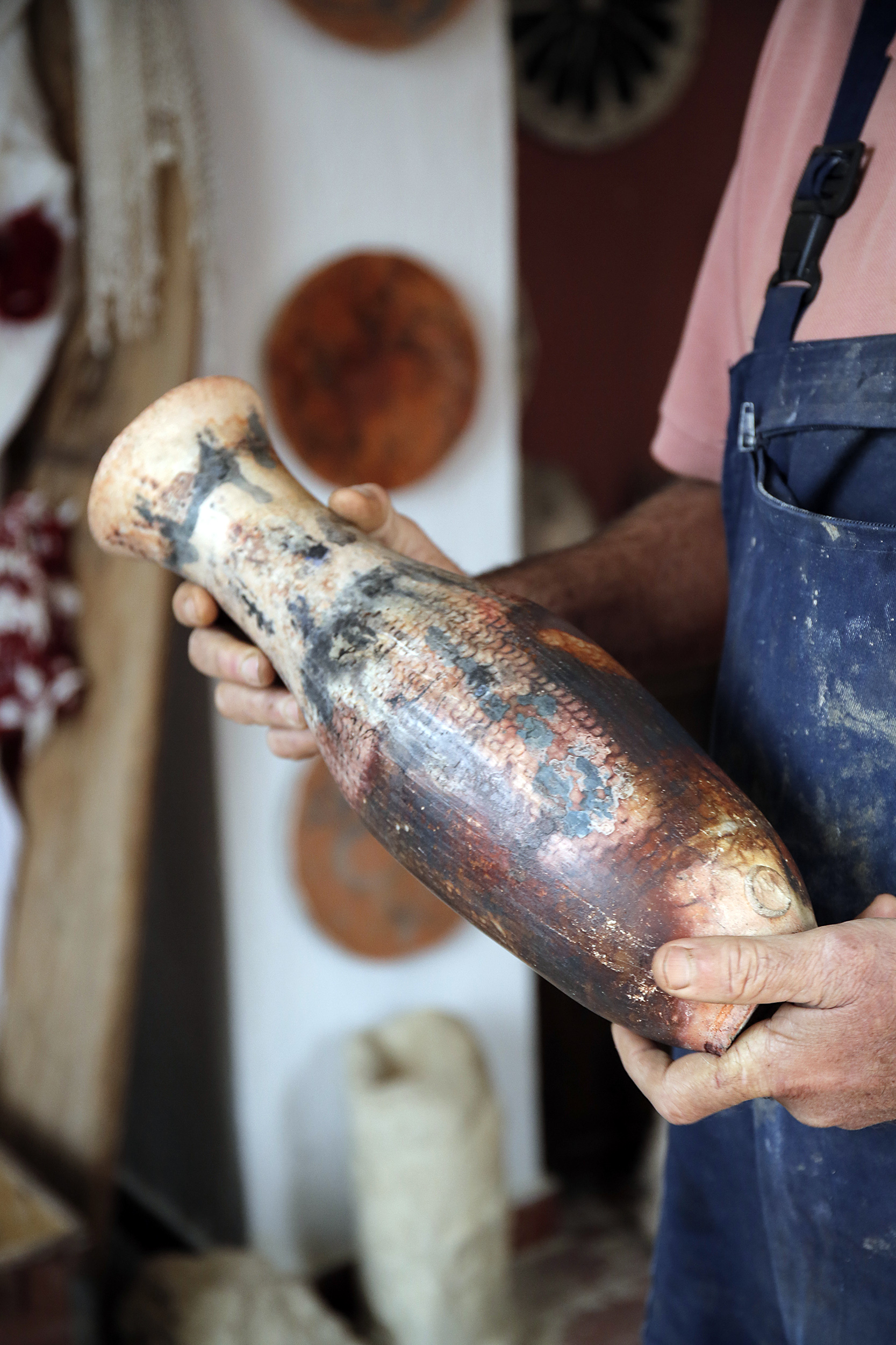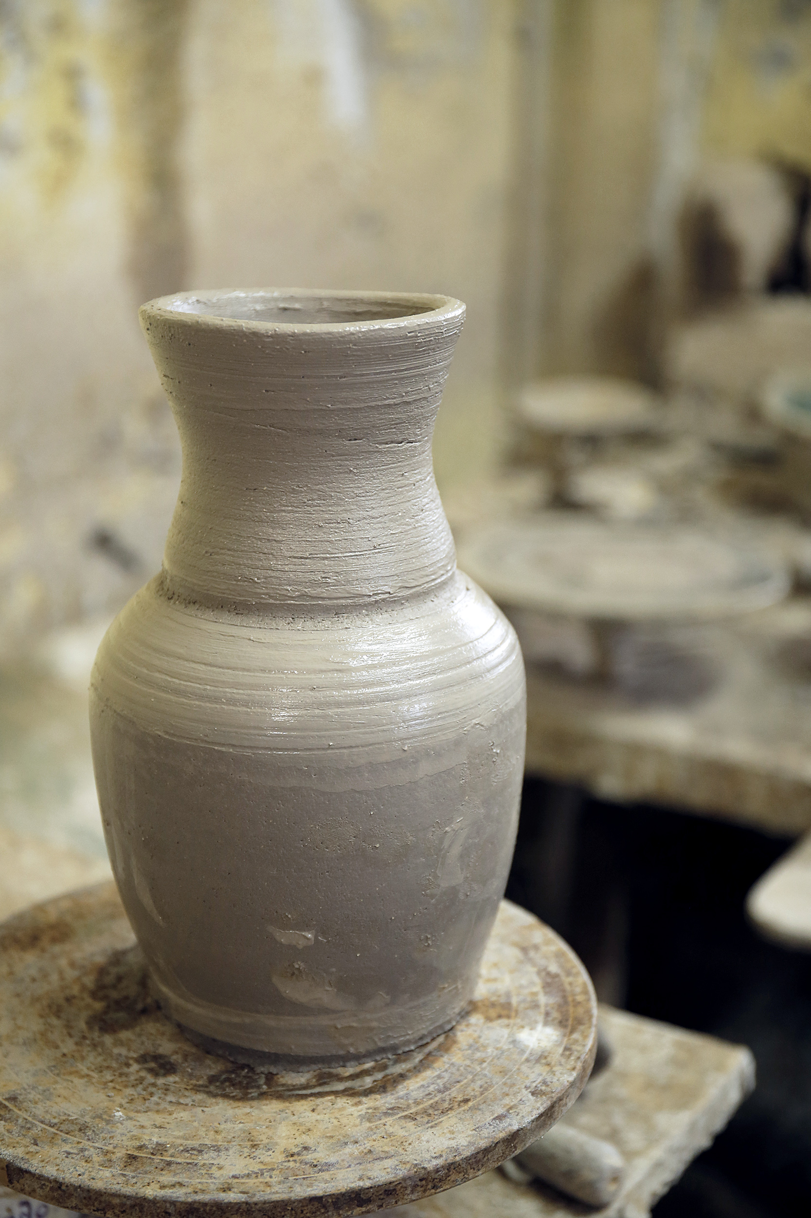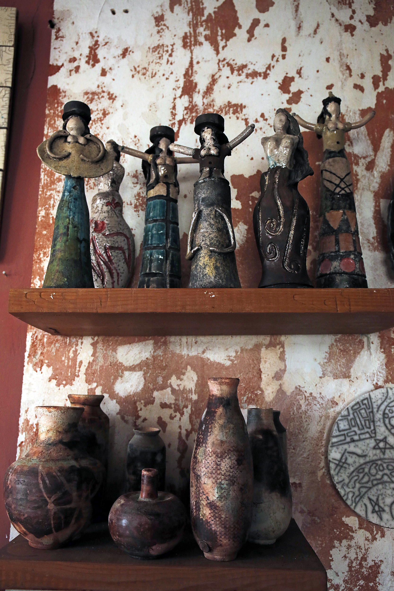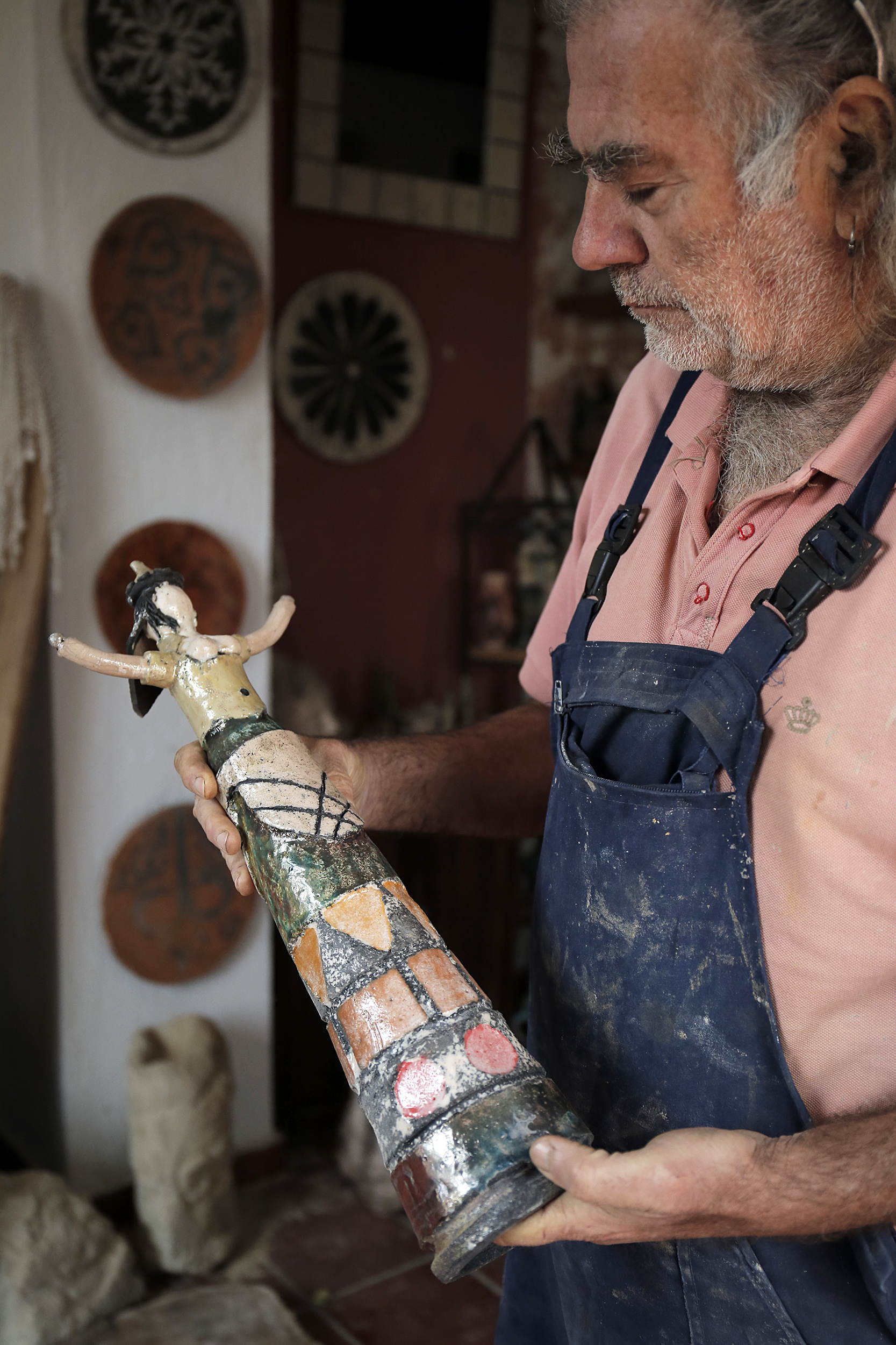 Πριν προλάβω να χωνέψω τον βομβαρδισμό εικόνων, ανοίγει η πόρτα και ο Νίκος, φορώντας μια φόρμα εργασίας, γυαλιά κατεβασμένα χαμηλά στη μύτη και με χέρια ντυμένα στον πηλό, με καλωσορίζει με καλοσύνη. Η Κρήτη μου προκαλεί, κάθε φορά που την επισκέπτομαι, ένα παράξενο, επαναλαμβανόμενο συναίσθημα. Κάθε πόρτα που ανοίγει, κάθε νεύμα πρόσκλησης, κάθε άνθρωπος που γνωρίζω για πρώτη φορά, μου προκαλούν μια απότομη οικειότητα, μια σχεδόν αυτονόητη ασφάλεια πως κάτι καλό και συνάμα παράξενο ήρθα να συναντήσω εδώ. Έτσι ακριβώς και στο εργαστήριο κεραμικής που μόλις ξεκίνησα να παρατηρώ. Κούπες, πιάτα, βάζα κάθε απόχρωσης και τεχνοτροπίας, διακοσμητικά τοίχου αλλά και ειδώλια μινωικής έμπνευσης, υαλωμένα, περίτεχνα αλλά και γήινης υφής δημιουργήματα γεμίζουν το χώρο. Η ησυχία της τοποθεσίας αλλά και το αδύναμο φως που μπαίνει από τα παράθυρα, είναι το καλύτερο σκηνικό για να πούμε ιστορίες.