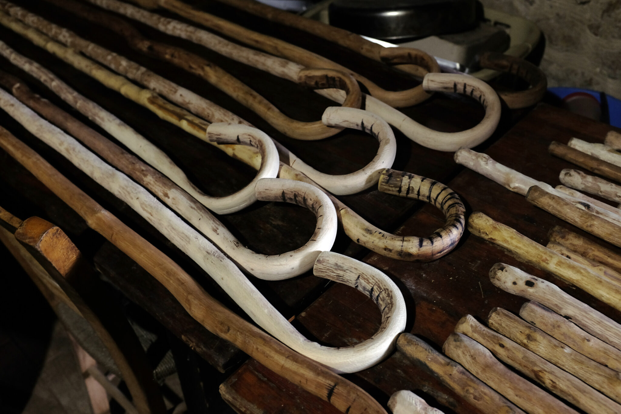 Φορτώνομαι τις φωτογραφικές μηχανές και σκαρφαλώνω στη θέση του συνοδηγού, στο αγροτικό το οποίο φανερώνει αμέσως τους λόγους χρήσης του. Πάγος δεν υπήρξε ούτε στιγμή για να σπάσει και οι κουβέντες ζωηρεύουν πριν φτάσουμε στο σπίτι όπου ζει και εργάζεται σε ένα ξέφωτο, λίγο έξω και ψηλότερα από το χωριό. Φθάνοντας στο τσιμεντένιο οίκημα, σπίτι αλλά και μαντρί και εργαστήριο ταυτόχρονα, ένα πολύ μικρό κατσικάκι, 2-3 μηνών, σαν κατοικίδιο έρχεται να μας προϋπαντήσει, μπλέκοντας στα πόδια μας, εξοικειωμένο και άφοβο. «Ορφάνεψε στη γέννα του», μου εξηγεί ο Μανώλης «και το μεγαλώνω εγώ μέχρι να ενωθεί με τα υπόλοιπα ζώα του κοπαδιού». Μια στοίβα από κατσούνες στέκουν όρθιες δίπλα στην πόρτα κάτω από το υπόστεγο. Πολλά ξύλα βρίσκονται στοιβαγμένα στην αυλή, κάποια για καύση αλλά αμέσως γίνονται αντιληπτά αυτά που προορίζονται για την κατασκευή του χαρακτηριστικού κρητικού μπαστουνιού. Καμιά δεκαριά είναι τοποθετημένα μέσα σε έναν κουβά νερό στη μια τους άκρη, για να μείνουν νωπά μέχρι την επεξεργασία τους.