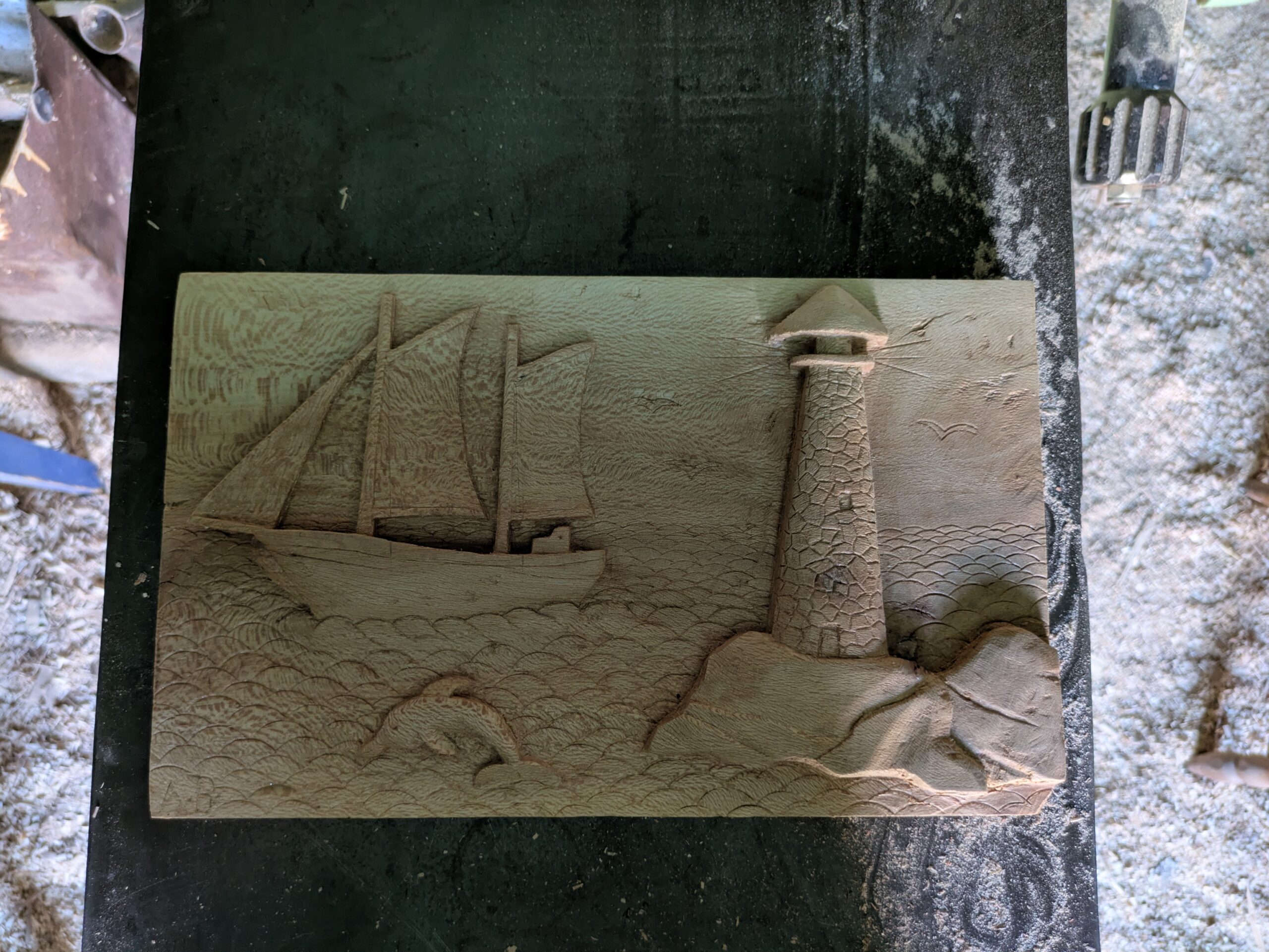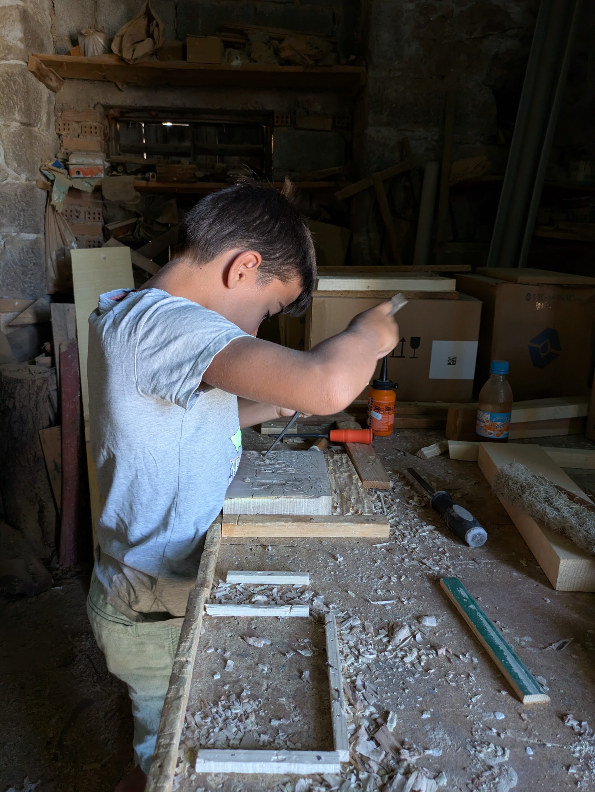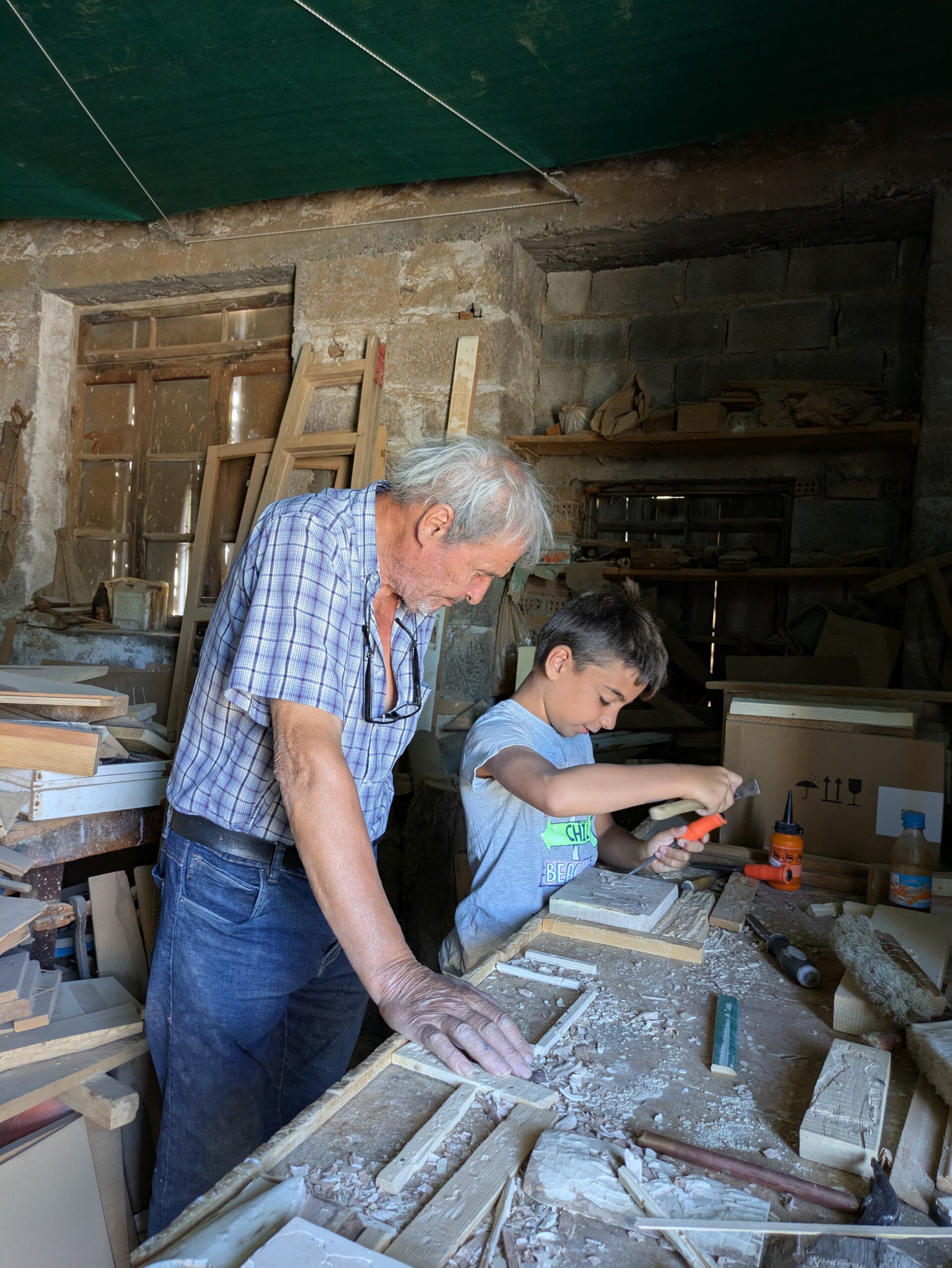 Την πρώτη φορά ο γιος μου, ο 10χρονος Φίλιππος, πηγαίνει από περιέργεια, γιατί οι φίλοι του έχουν κολλήσει και βρίσκονται εκεί καθημερινά, σε σημείο που έχουν μεταθέσει πιο αργά το υπόλοιπο πρόγραμμα των καλοκαιρινών διακοπών τους (μπάνιο, φαγητό, παιχνίδι). Αμέσως κολλάει κι εκείνος. Μαθαίνουμε ότι το εργαστήριο ανοίγει ακόμα και Κυριακές και αργίες. Μέσα στις τρεις εβδομάδες των διακοπών μας ολοκληρώνει σχεδόν μόνος του δύο έργα ξυλογλυπτικής: ένα καράβι και μια εξωτική παραλία με φοίνικες.