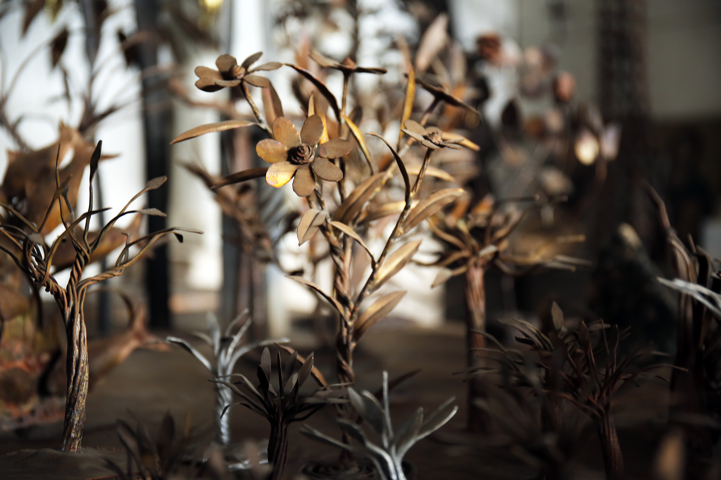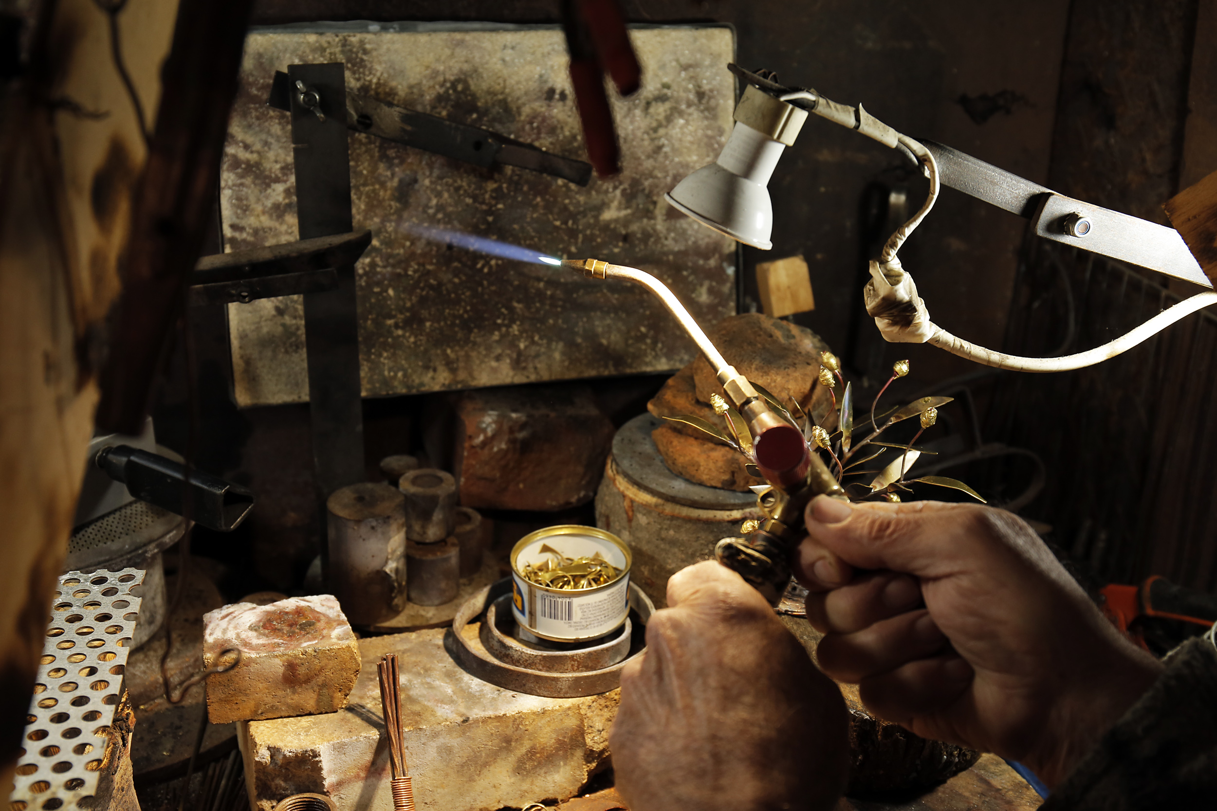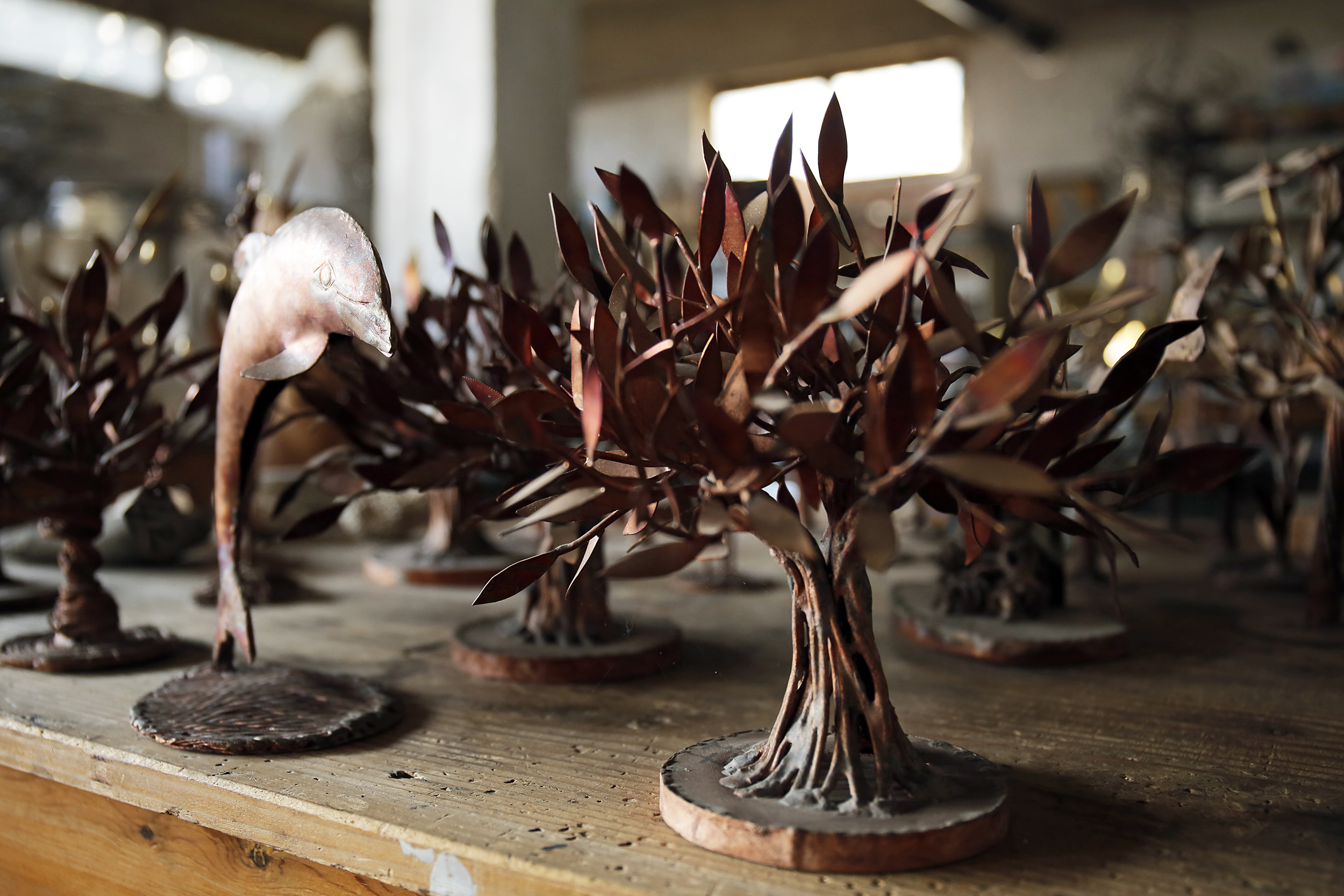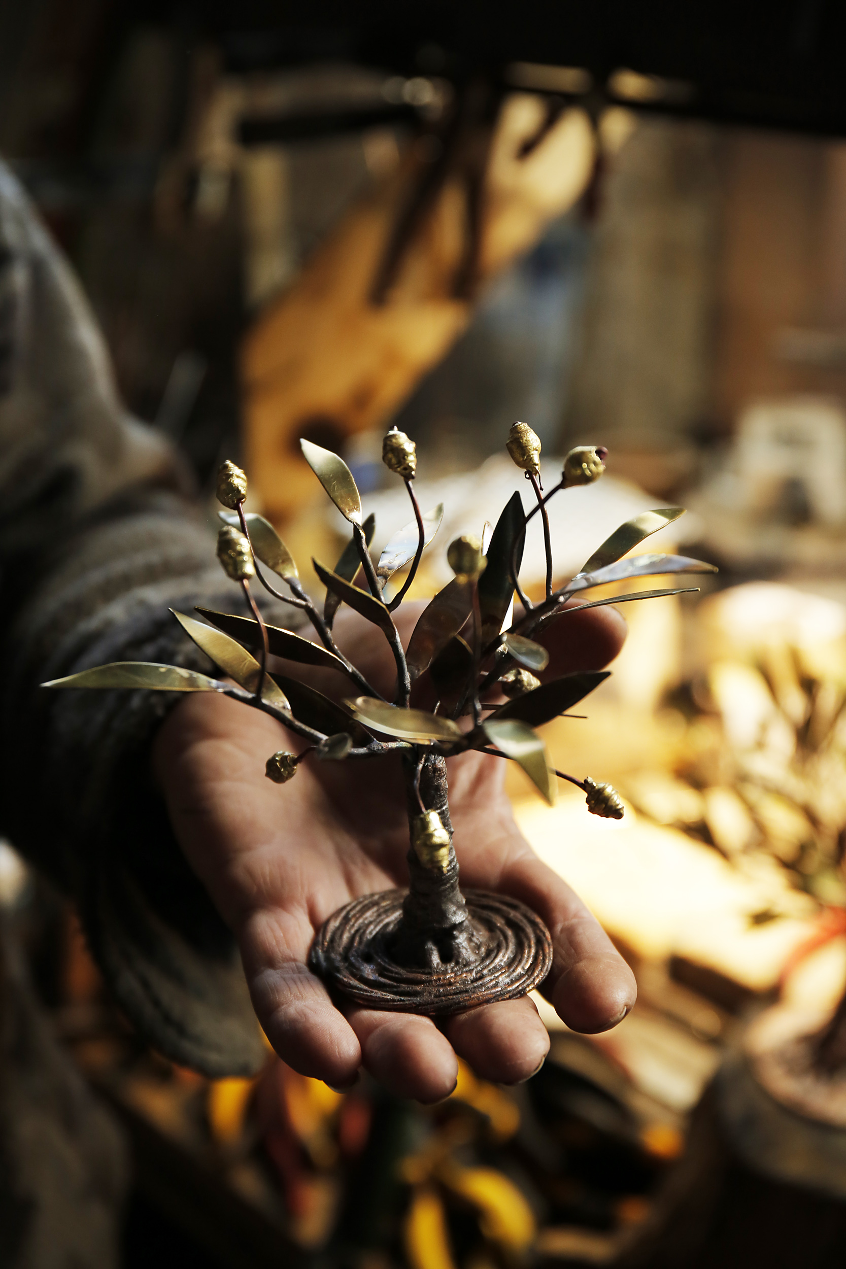 Καθώς ετοιμάζει την ακίδα ασετιλίνης με το απόκοσμο οινοπνευματί χρώμα για να μου δείξει ένα μεγάλο κομμάτι της δουλειάς που χρειάζεται ένα ελαιόδεντρο για να ολοκληρωθεί, αντιλαμβάνομαι, χρησιμοποιώντας δικά του λόγια, πως ο Μανόλης παραμένει ερασιτέχνης, «εραστής της Τέχνης», πως ο ίδιος μαθαίνει κάτι καινούριο κάθε μέρα και πως προσπαθεί να διατηρεί την αθωότητα του ανέγγιχτου από τα χρόνια εμπειρίας, τεχνίτη. Κάθε ελαιόδεντρο έχει κάπου, σε κάποιο από τα φυλλαράκια του, τον αριθμό τους χαραγμένο, πόσα χρειάστηκε να κόψει δηλαδή, με τα ειδικά ψαλίδια του ένα ένα για να τιμήσει με αυτόν τον τρόπο και την αγάπη του για το πολύτιμο αυτό δέντρο. Ανάλογα στο μέγεθος, ένα τέτοιο έργο μπορεί να του πάρει έως τέσσερις ημέρες για να ολοκληρωθεί.