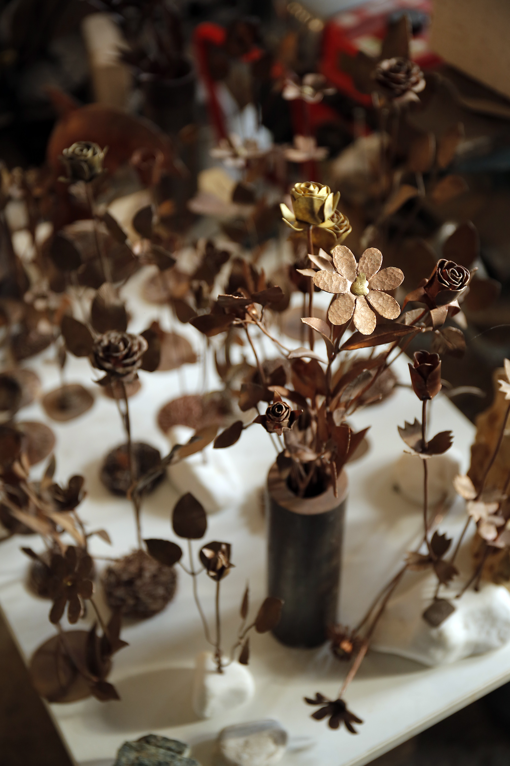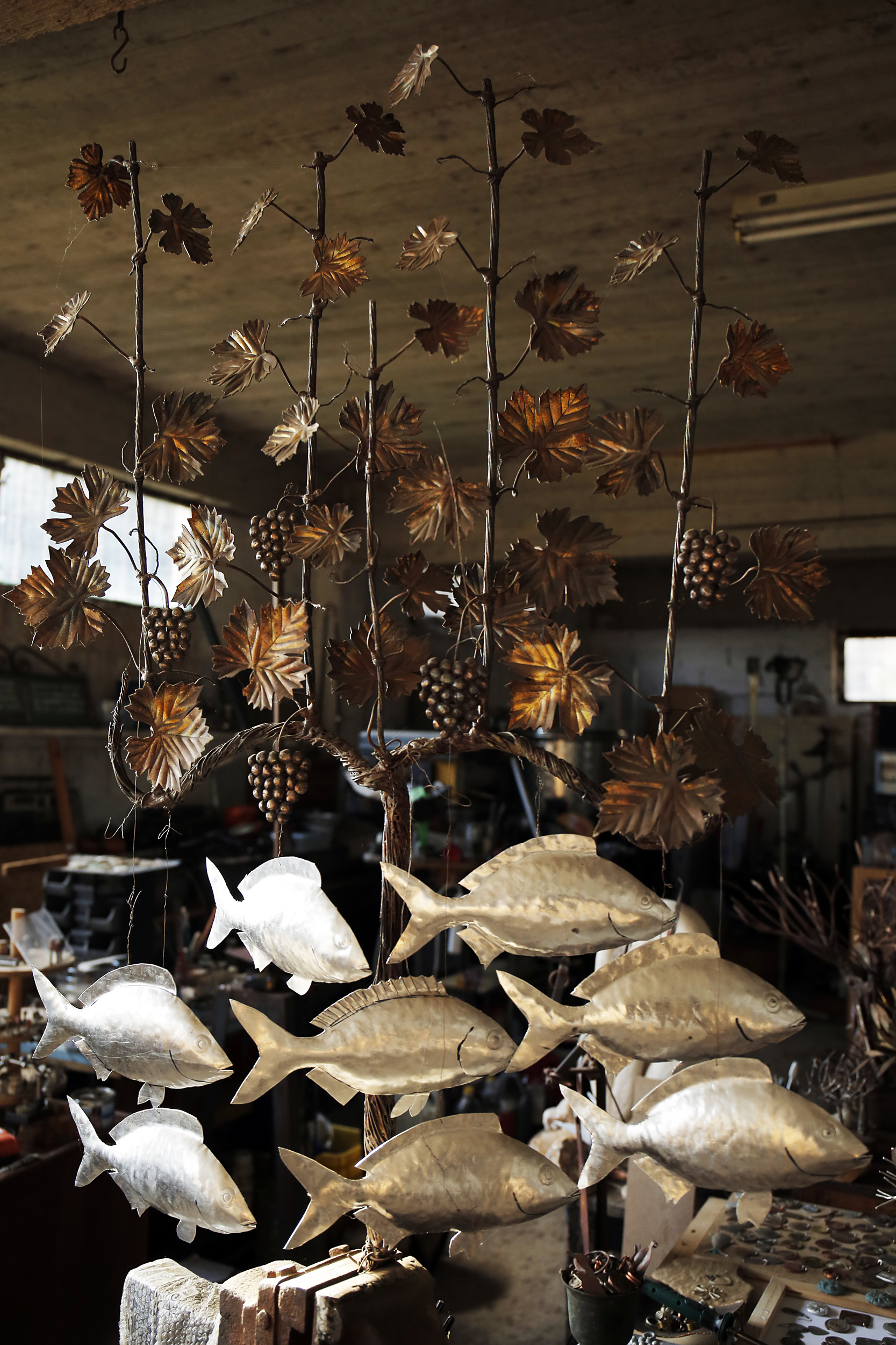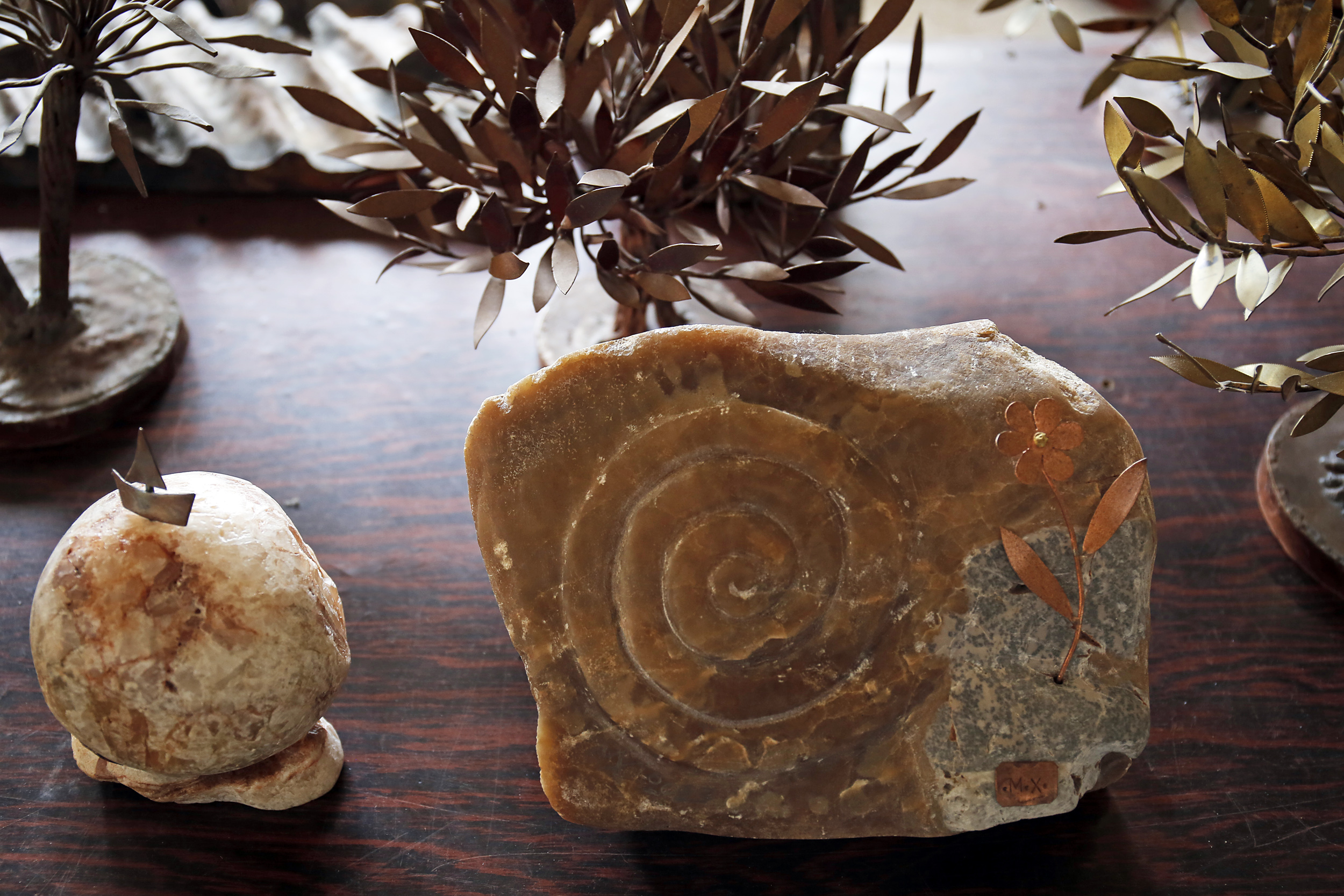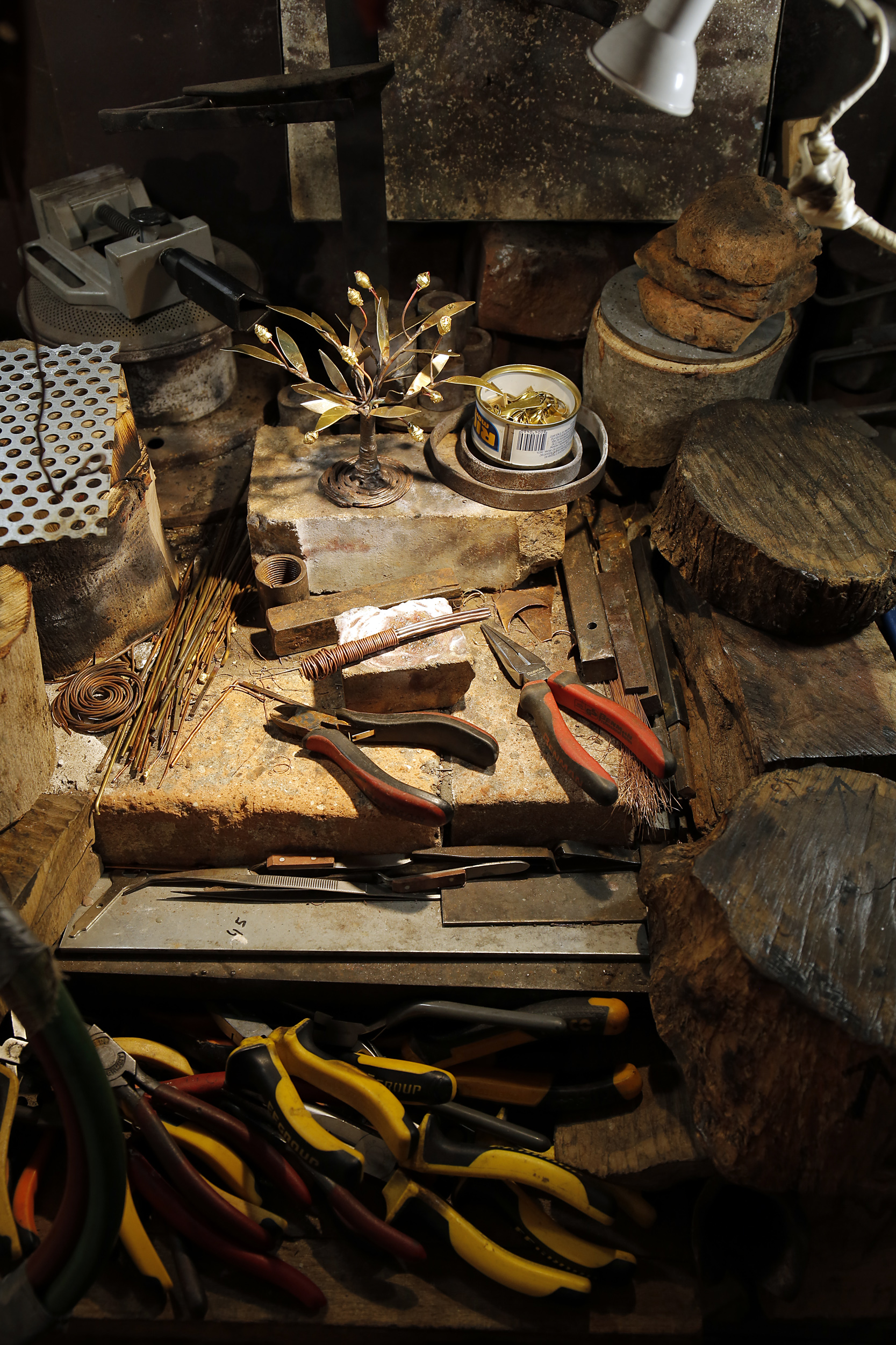 Για πέντε χρόνια κατασκεύαζε και έμαθε να κατασκευάζει όλα τα μεταλλικά αντικείμενα, ακριβή αντίγραφα της εποχής, για την αναστήλωση του νησιού. «Έμαθα να κατασκευάζω ακόμη και κλειδαριές» μου εξηγεί δείχνοντάς μου μερικές που στέκονται σε μια γωνιά του εργαστηρίου προκαλώντας μου άμεσα σπαζοκεφαλιά, προσπαθώντας να κατανοήσω πως λειτουργεί μια κλειδαριά. «Το μέταλλο πρέπει να το ξεφοβηθείς για να το δουλέψεις» μου λέει, εξηγώντας παράλληλα το θαυμασμό που έχει ο ίδιος για την ομορφιά και τα μυστικά του υλικού αυτού και της επεξεργασίας του.