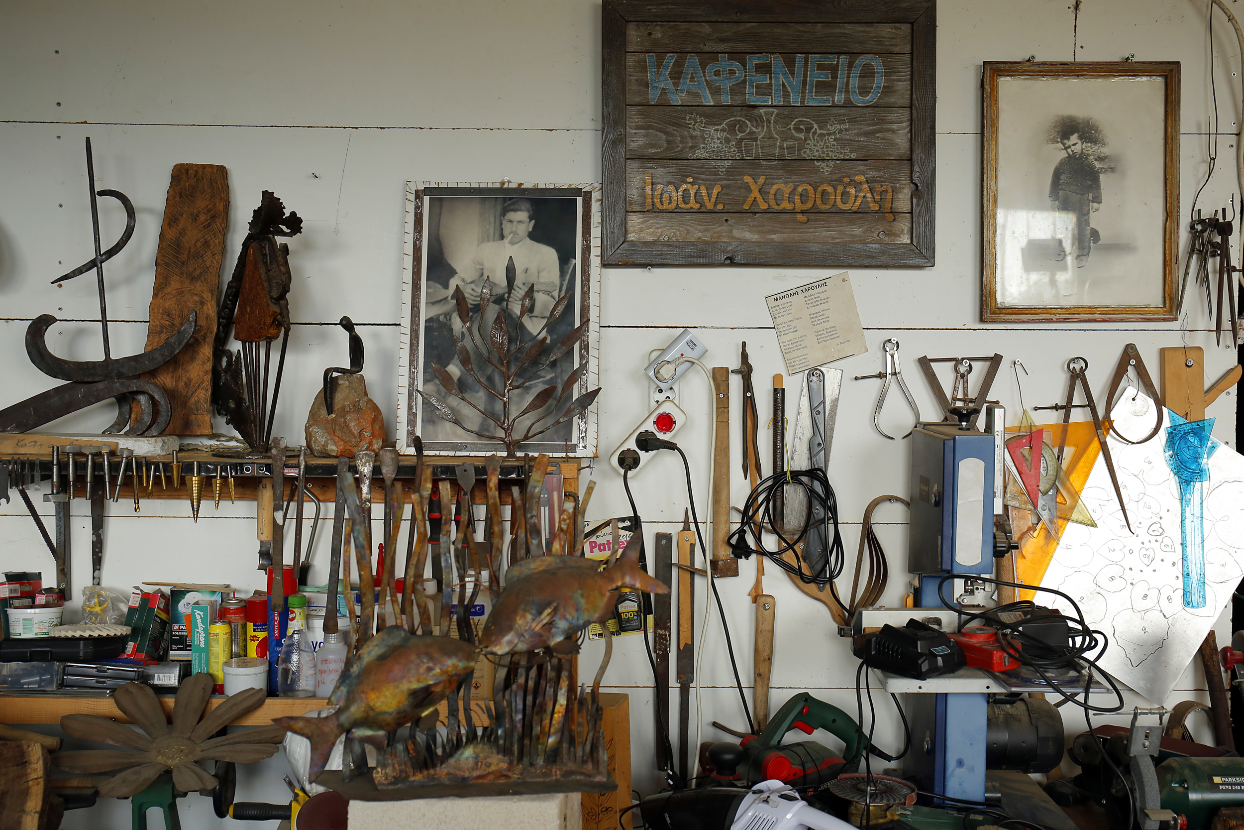 Καθώς έχει αφοσιωθεί στη λεπτοδουλειά στον πάγκο του, κάνω μια τελευταία βόλτα μέσα στο χώρο παρατηρώντας στοιχεία μιας ζωής, αναμνηστικές φωτογραφίες, μια πινακίδα καφενείου του πατέρα του Ιωάννη, δίσκους, βιβλία, αφίσες από συναυλίες του γιου του Γιάννη Χαρούλη, με τον οποίο εμφανίζεται κάποιες φορές στις συναυλίες του, φωτογραφίες από τις εμφανίσεις του σε κινηματογραφικές ταινίες και σε τηλεοπτικές σειρές, όπως ο ρόλος του ιερωμένου στη γνωστή σειρά «Το νησί», καθώς και κάποιες παράξενες κρητικές λύρες, φτιαγμένες εν μέρει από κονσερβοκούτια, οι οποίες, όπως μου αποδεικνύει λίγο αργότερα, έχουν και ήχο κανονικό.
