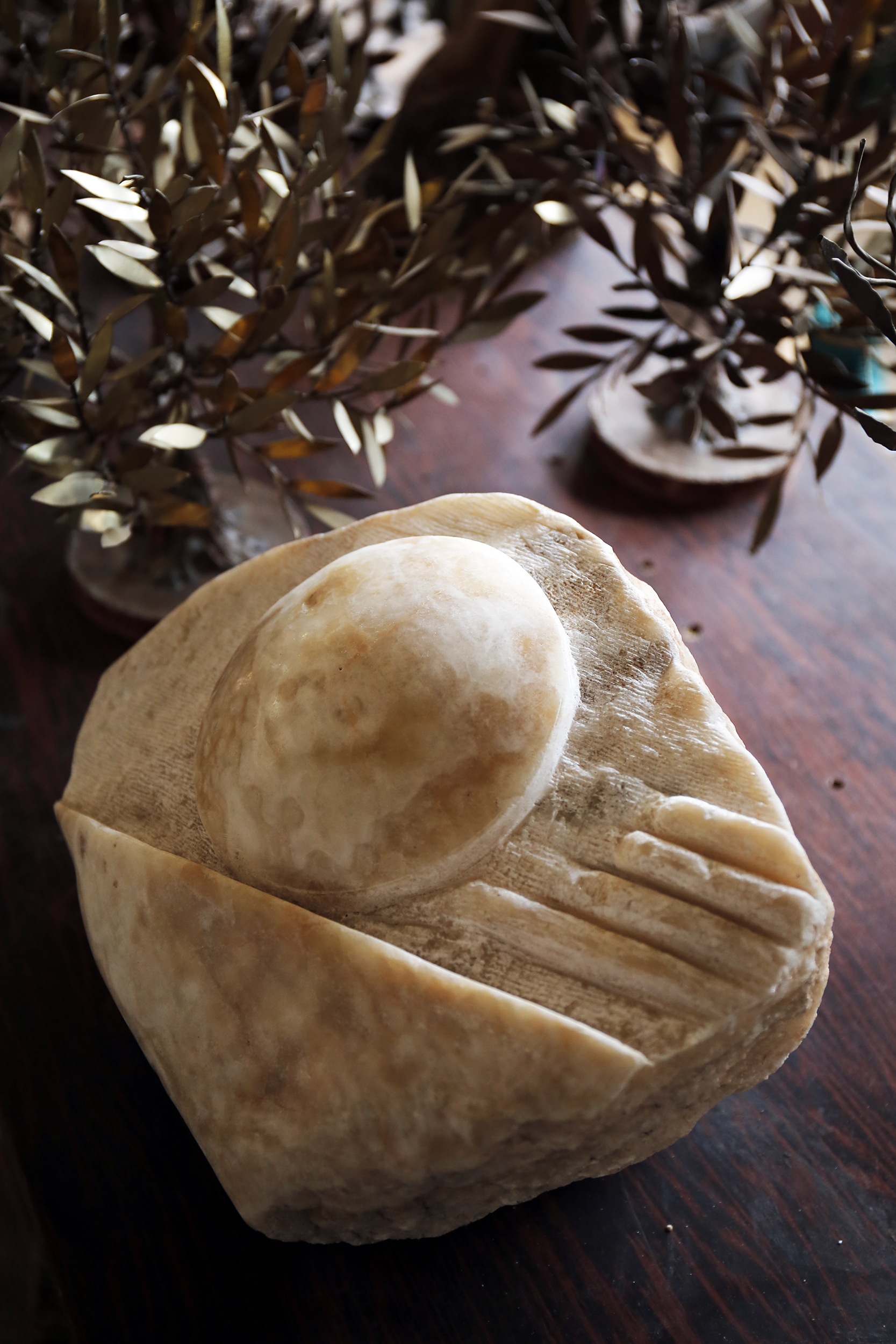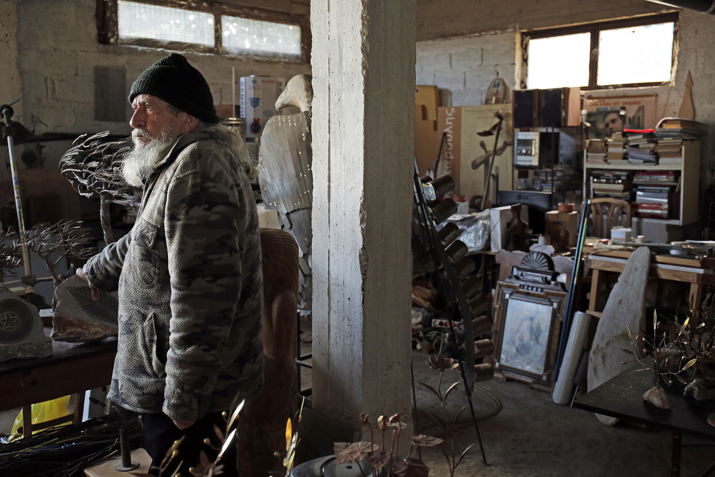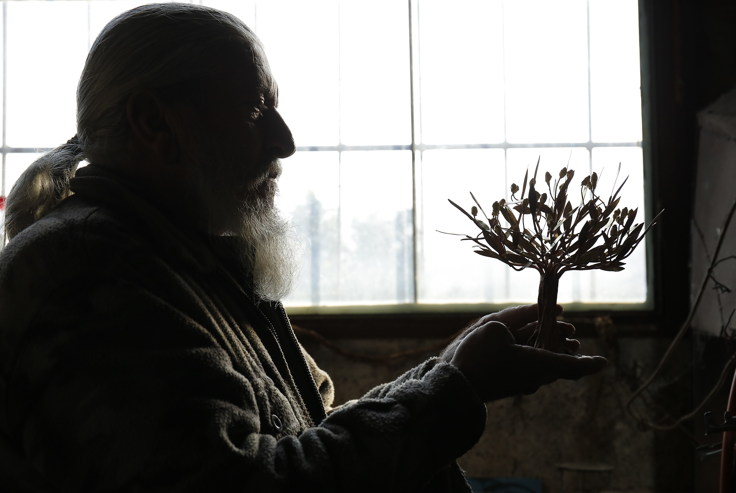Χαμένοι κάπως στη μετάφραση και μετά από άλλες δύο επικοινωνίες, ξεκινάμε με τις τηλεφωνικές του οδηγίες να τον ανταμώσουμε στο κτήμα του στις παρυφές του χωριού. Η μυρωδιά από το κάψιμο νωπών ξύλων στην ατμόσφαιρα αναμεμιγμένη με αυτήν του υγρού χώματος μετά τη χθεσινοβραδινή βροχή μας συνοδεύει μέχρι να τον δούμε να στέκει στο δρόμο έξω από το σπίτι του. Αδύνατος, στητός, με γενειάδα λευκή να φεγγοβολά και μάτια έντονα, χαμογελαστά, μας καλωσορίζει και μας οδηγεί, δίπλα από τη φορτωμένη μανταρινιά, στα σκαλάκια που οδηγούν στο εργαστήριό του. Ευρύχωρο, ψηλοτάβανο ατελιέ, μπετό και τσιμεντόλιθοι, αποχρώσεις γκρι, ουδέτερες, ιδανικό για την ανάδειξη των έργων του.