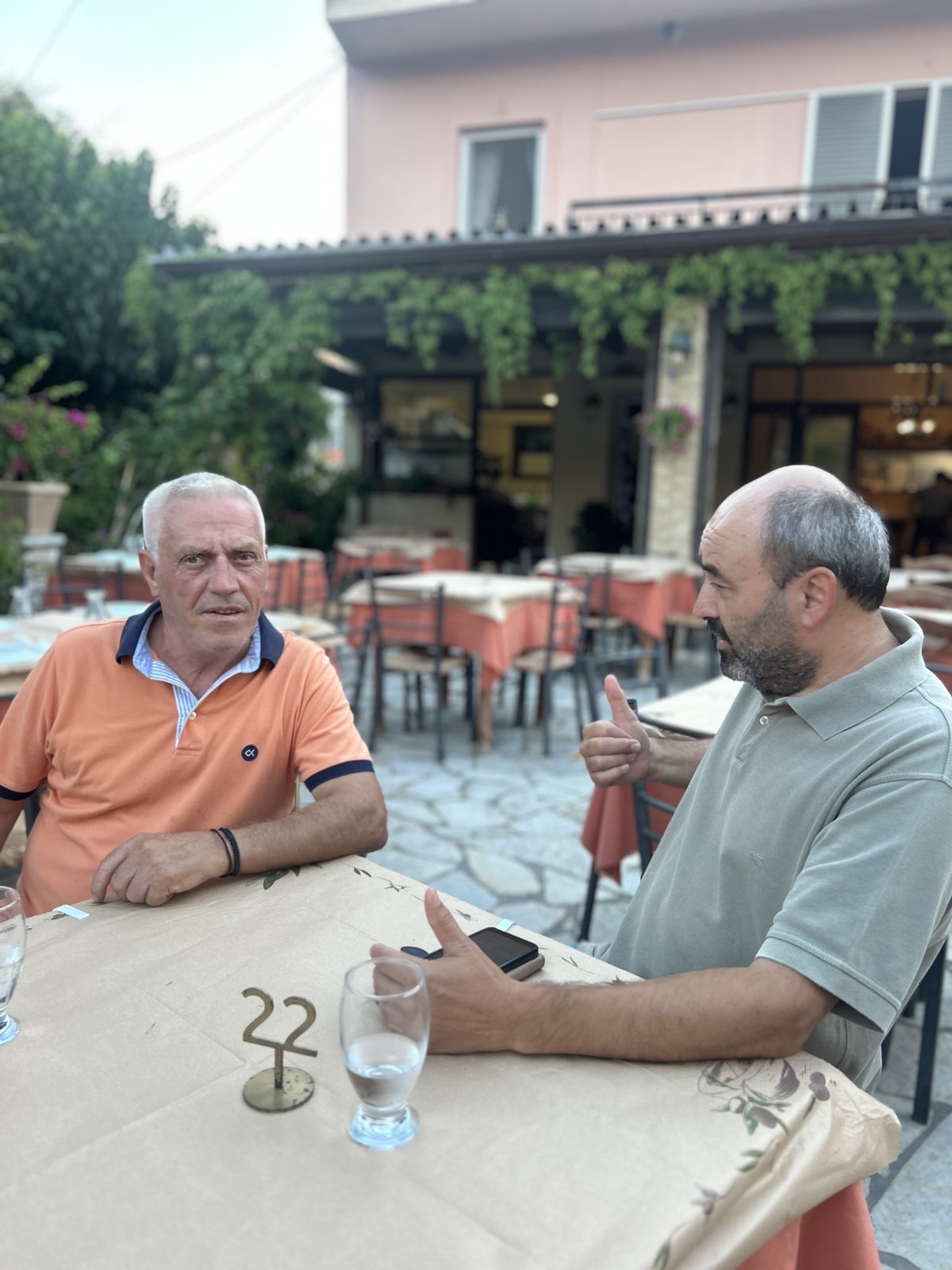 -(Γελάει) Προχτές το μεσημέρι έπινα καφέ στη Ναύπακτο, στο Λιμάνι. Δίπλα μου μια παρέα από το εξωτερικό, που φυσικά δεν με γνώριζαν, σηκώνονται να φύγουν και ακούω τον διάλογο: «Παιδιά πού θα πάμε το βράδυ για φαγητό;» ρωτάει ο ένας. Και απαντά ο άλλος: «Έχω ακούσει τα καλύτερα για τον Κόπανο, στο Τρίκορφο, εκεί θα πάμε». Αμάν ρε παιδιά, σκέφτηκα, δεν υπάρχουν αλλού μαγαζιά, τι στο καλό έχει ο Κόπανος; Ανάσα δεν παίρνουμε. Άκου φίλε, για να σοβαρευτούμε. Εγώ λεφτά δεν έκανα στη ζωή μου. Και δεν με νοιάζει γιατί την έζησα και τη ζω! Στο τέλος της μέρας δεν μετράω τι μου άφησαν οι πελάτες στο συρτάρι! Μου αρκεί ο καλός τους λόγος, το χαμόγελό τους, η εμπιστοσύνη που μου έχουν και η υπόσχεση που δίνουν τα μάτια τους ότι θα ξανάρθουν. Με πολλούς από αυτούς συνδέομαι με σχέσεις ζωής. Κι αυτό είναι το μεγαλύτερο κέρδος μου. Όσα πήρα από την μπάλα (γνωριμίες, φιλίες, ανθρώπινες σχέσεις), τα ίδια και άλλα τόσα παίρνω από την ταβέρνα. Και μου αρκούν!