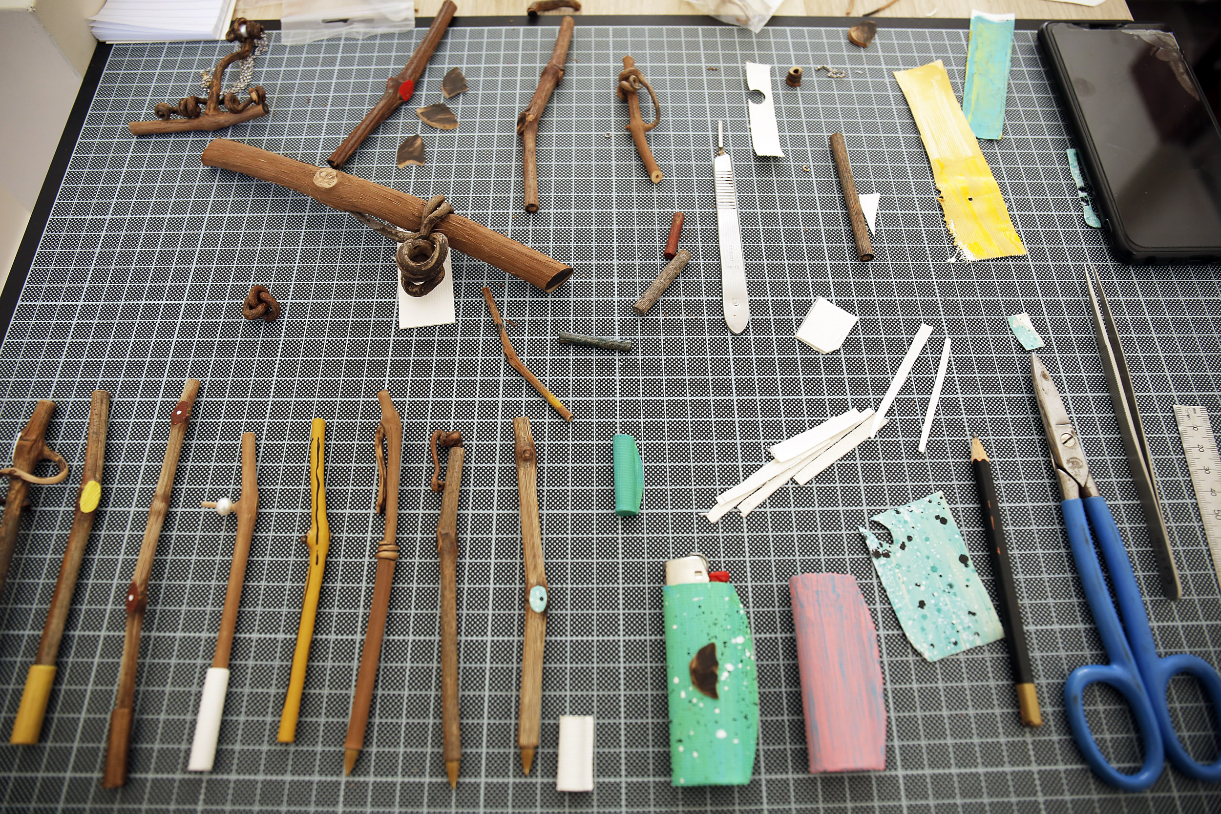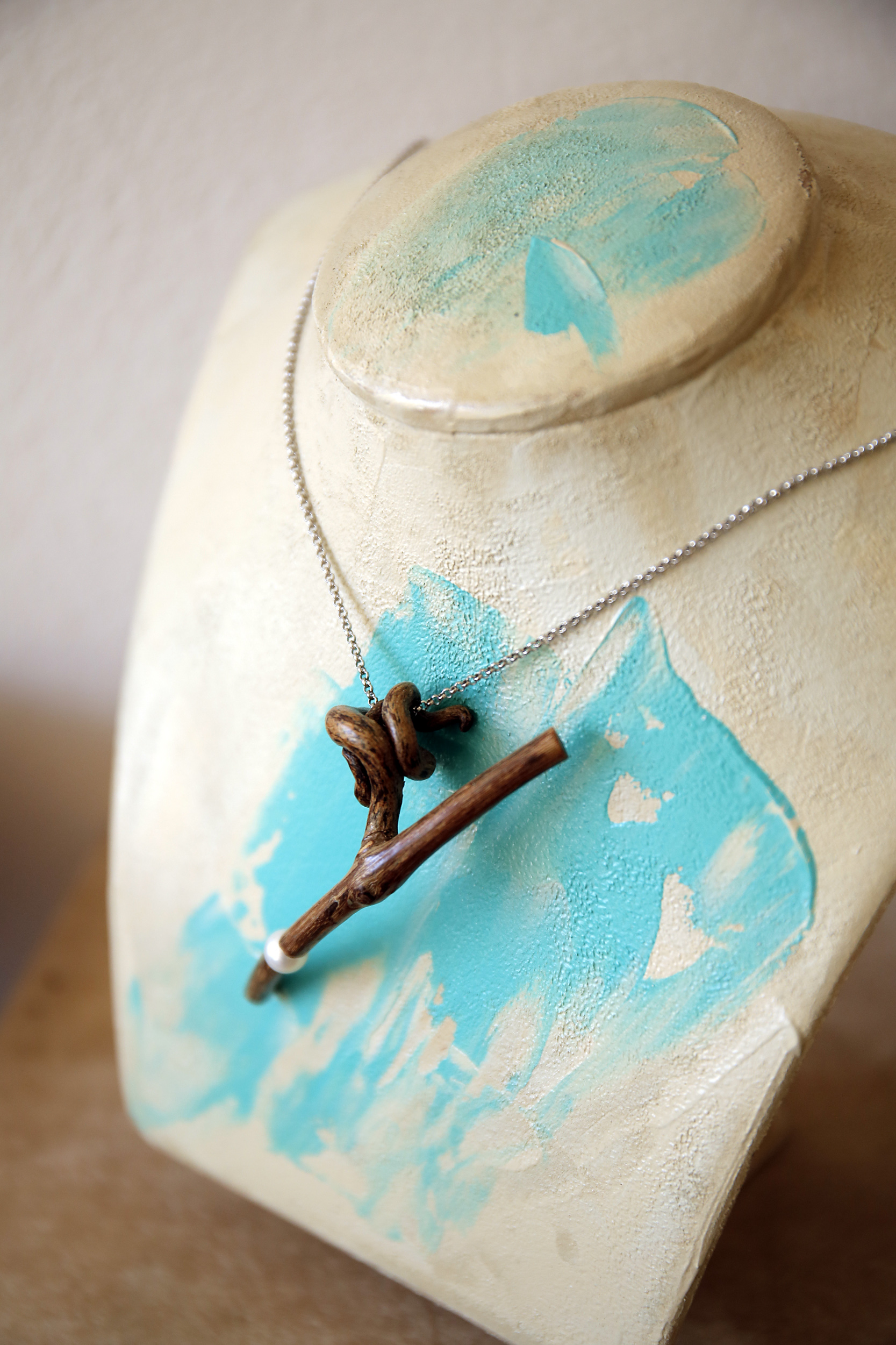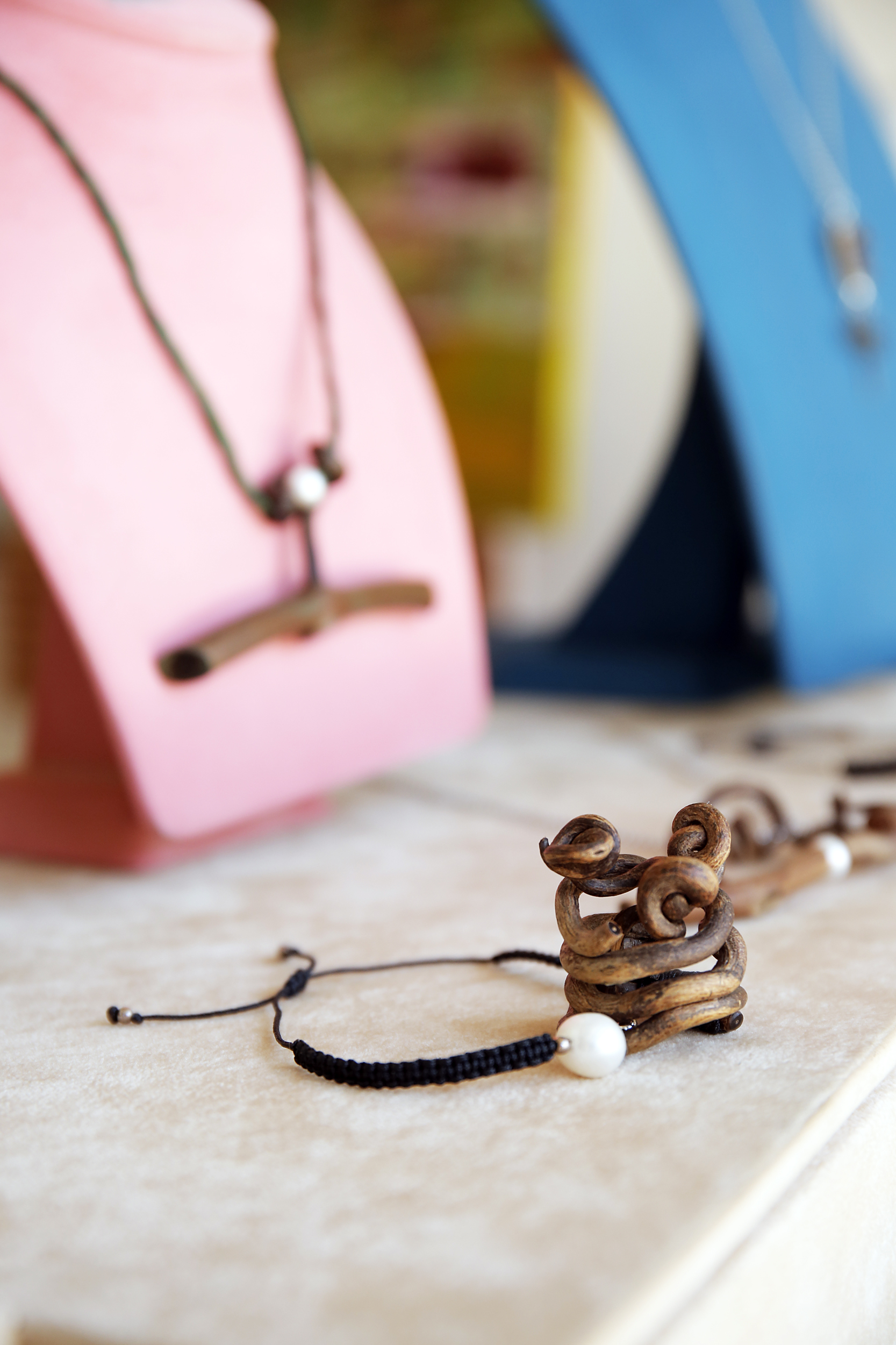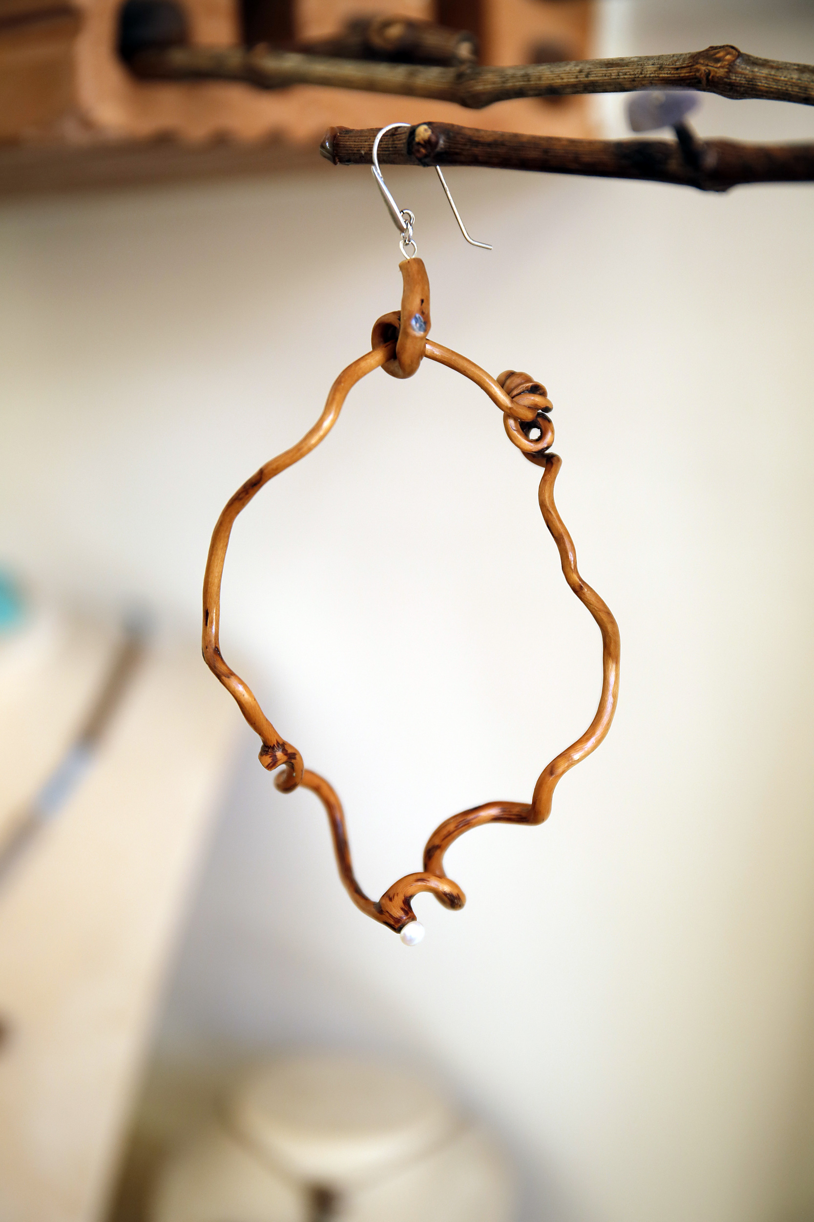 Οι τοίχοι είναι γεμάτοι με ολοκληρωμένα έργα, τα οποία συνδυάζουν τη ζωγραφική και έχουν ενσωματωμένο ένα κομμάτι από το αμπέλι. «Ξεκίνησα να ζωγραφίζω και σταδιακά, έκανα τη σύνδεση με την οινική ιστορία της περιοχής» σημειώνει, ενώ, ταυτόχρονα περιεργάζομαι διάφορα μικροαντικείμενα, όπως σκουλαρίκια, κολιέ, δαχτυλίδια, αλλά και διακοσμητικά.