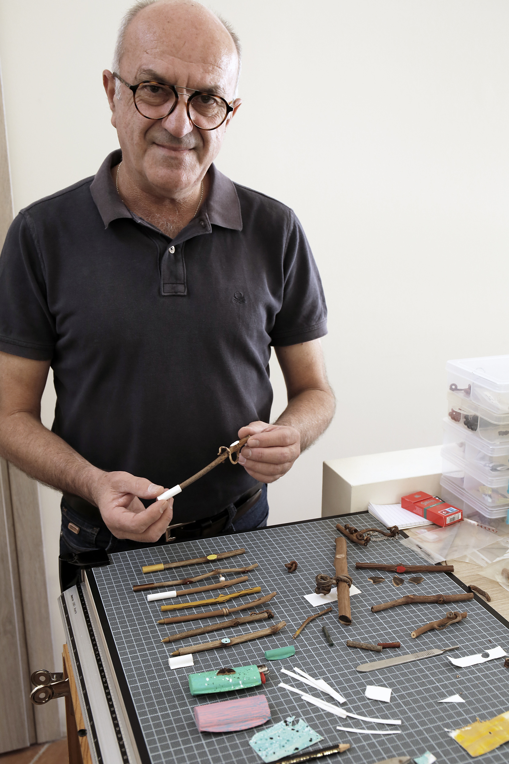 Συναντώ τον Χρήστο Λάζαρη, ο οποίος διατηρεί εδώ το ατελιέ και το εργαστήριό του. Με καλοδέχεται και σταδιακά, μαθαίνω για την πορεία της ζωής του και για τα γεγονότα που έμελλε να τον σημαδέψουν, ευτυχώς όχι ανεξίτηλα. Σήμερα, ασχολείται με τη δημιουργία μικρών έργων τέχνης. Σε όλα, υπάρχει μία κοινή συνισταμένη. Είναι η ενσωμάτωση τμήματος από τον φλοιό ή τον κορμό του αμπελιού. «Με τον τρόπο αυτό, δίνω τη δυνατότητα στον επισκέπτη, φεύγοντας να πάρει μαζί του κάτι που θα του θυμίζει τη Νεμέα και τη σύνδεση με το αμπέλι», θα μου πει, ενώ ψάχνει να ξεχωρίσει από τον πάγκο εργασίας ένα μικρό δείγμα.