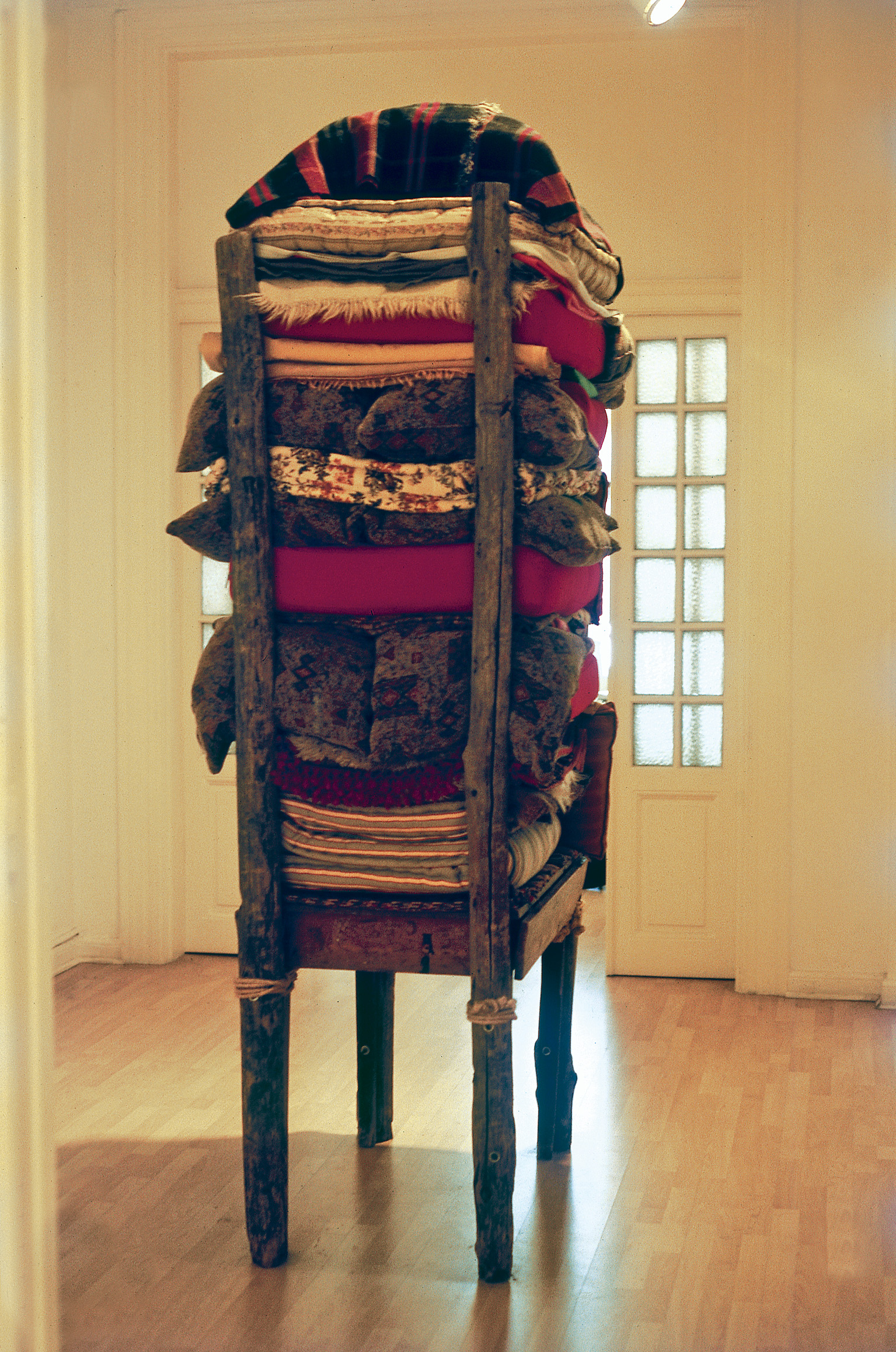 Τα προσωπικά του βιώματα και οι ευνοϊκές καλλιτεχνικές συνθήκες τον έφεραν σε επαφή με το ύφασμα ως εικαστικό υλικό ήδη από τη δεκαετία του ’80. «Όταν ήρθα από την Ιταλία, το 1982, πήγαινα και έπαιρνα κουβέρτες Ακριλάν από τη Νάουσα, στο Νομό Ημαθίας, η οποία τότε ήταν πόλη παραγωγής τους» θυμάται. Η σχέση του «με τις κλωστές και το πανί» συνεχίστηκε, και πριν από πέντε, έξι χρόνια άρχισε να παρεμβαίνει σε βελέντζες, που εξελίχθηκαν στο «προσφιλές μου υλικό. Αναζητώντας τις, έγινα ένας καλός ρακοσυλλέκτης».