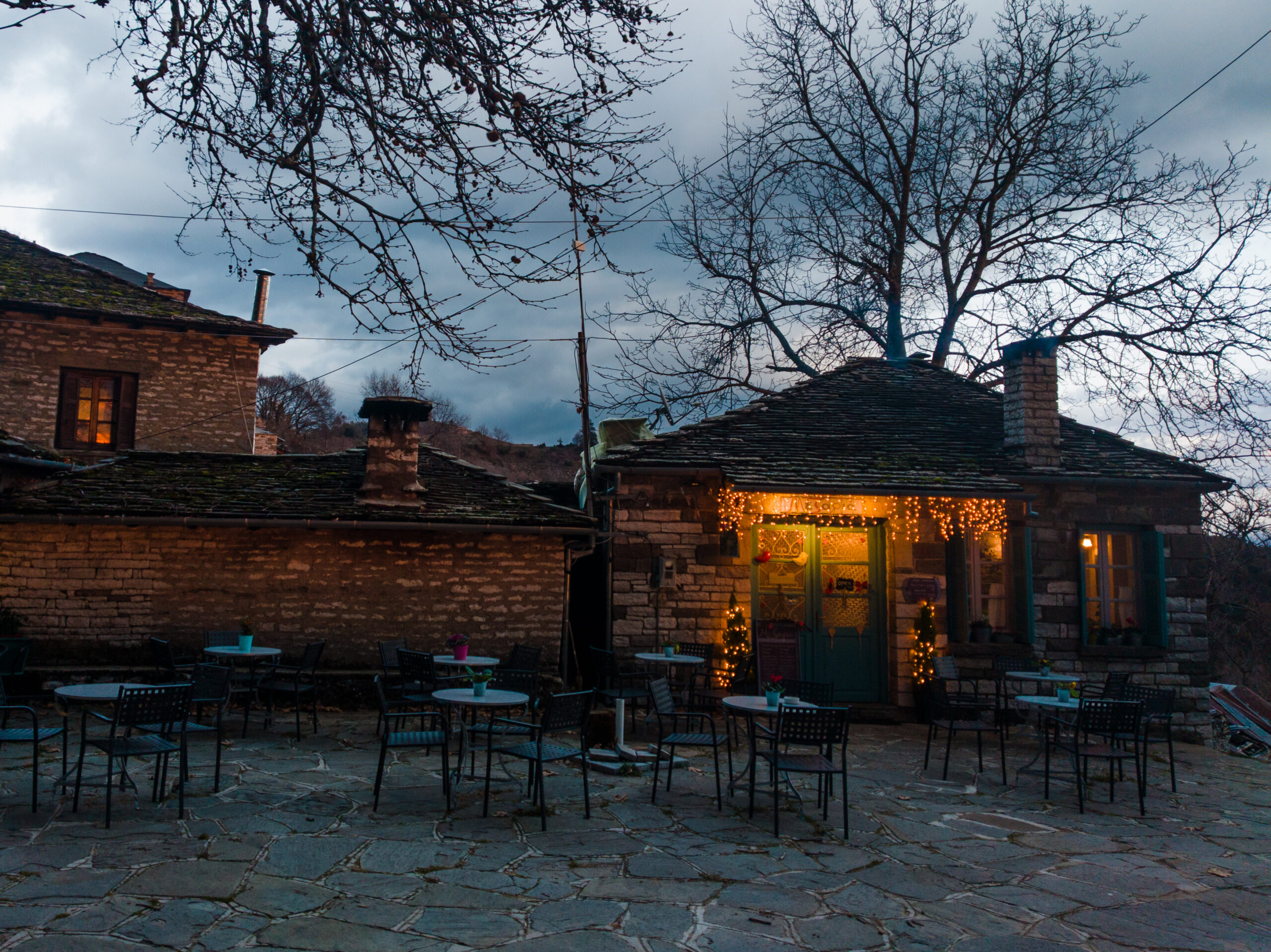 Το καφενείο μπήκε στην ζωή μου έξι χρόνια αφότου έφυγα από την Αθήνα. Είναι ένα προσωπικό εγχείρημα με σκοπό να διατηρήσω τον εαυτό μου σε ανεκτά κοινωνικά επίπεδα και να λέω καμία κουβέντα, γιατί αλλιώς με την ελάχιστη ανθρώπινη επαφή που έχω δέκα χρόνια τώρα, απλά θα γρύλιζα και εγώ σαν την Ούρσα, τον σκύλο που απέκτησα εδώ. Σίγουρα δεν μπορώ να χαρακτηρίσω το καφενείο καθημερινότητα. Νομίζω είμαι ο χειρότερος επιχειρηματίας εστίασης στην περιοχή, με διαφορά. Η φωτογραφία έχει πάντα προτεραιότητα και ο καιρός εδώ έχει πάντα ενδιαφέρον. Οπότε εκεί που ξεκινάω με όλη την καλή διάθεση να ανοίξω το καφενείο, βλέπω σύννεφα, ομίχλες και μουντάδα που μου αρέσει απίστευτα και αντί να ακολουθήσω το καλντερίμι που πάει κάτω για το καφενείο, παίρνω τα φωτογραφικά και ανεβαίνω στο βουνό για καμιά δυο μέρες. Ευτυχώς σταθεροί πελάτες και φίλοι δείχνουν κατανόηση. Μερικοί μου αφήνουν και σημειώματα, «ήρθαμε και δεν σε βρήκαμε, καλές λήψεις» και διάφορα άλλα. Περισσότερο λειτουργώ με τηλέφωνο, γράψ’ το για να ξέρει ο κόσμος. Αργίες, τριήμερα, γιορτές και το καλοκαίρι που έχει ζέστη είμαι παρών και «σίγουρα» θα με βρείτε στην ‘Μεζαριά’ για να μην αδικώ και τον εαυτό μου τόσο πολύ. Η καφενειακή, αν μπορούμε να την πούμε έτσι καθημερινότητα, είναι απλή. Ξυπνάω, κάνω τις δουλειές του σπιτιού που πρέπει να γίνουν, καθαριότητες κτλ και μετά κατεβαίνω στο καφενείο. Τη χαμηλή περίοδο είμαι ανοικτός μόνο τα Σαββατοκύριακα και όπως είπα, καλοκαίρια και γιορτές προσπαθώ να φανώ πιο συνεπής.