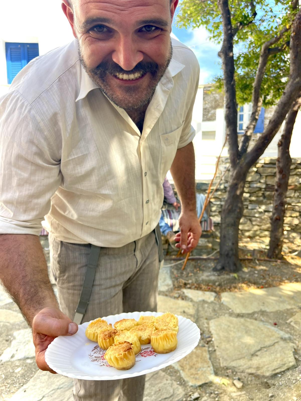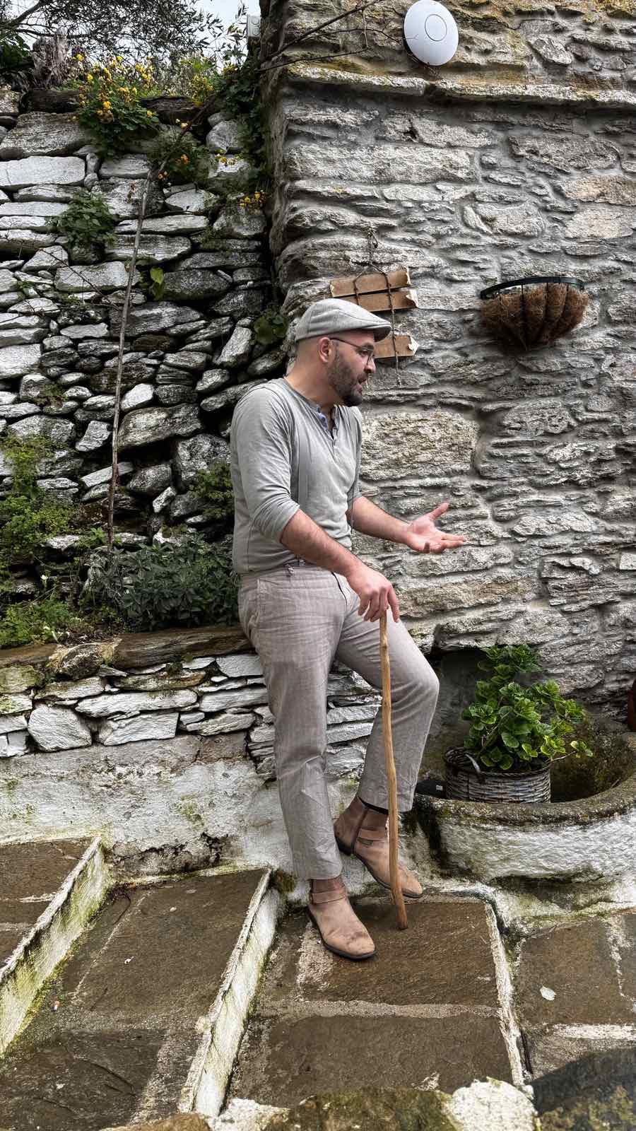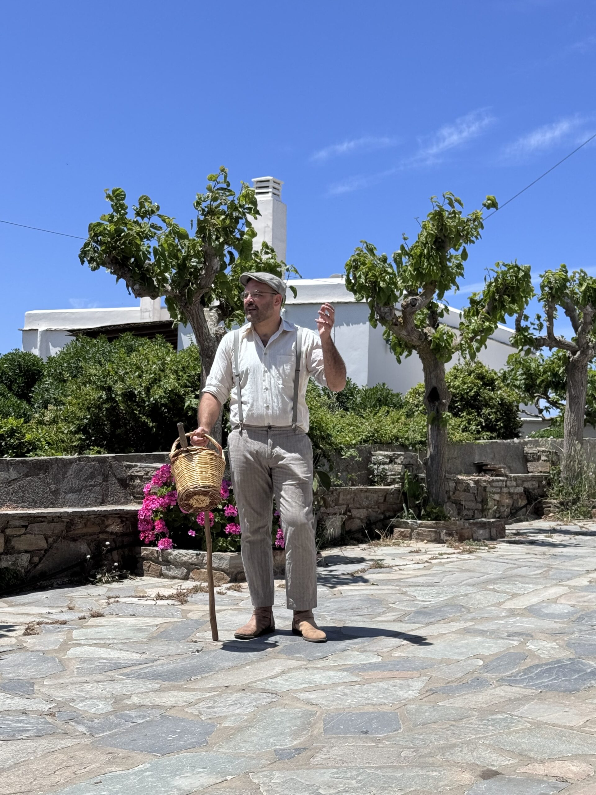 Με απλά λόγια, περιηγεί ντόπιους και ξένους επισκέπτες στα σοκάκια της Στενής, αλλά και σε άλλα μέρη, και τους διηγείται ιστορίες για τα παλιά, για τη ζωή, για καταστάσεις και τόπους. Μιλά για το λαογραφικό μουσείο που υπήρξε άλλοτε μαγαζί και τηλεφωνείο, ενώ αργότερα στέγασε τη χωροφυλακή, αποκαλύπτοντας την ιστορία που κρύβεται πίσω από κάθε χώρο. Εξηγεί τον ρόλο των πηγαδιών και το πώς το νερό ένωνε τους ανθρώπους σε αυτό το άνυδρο νησί, με τρόπο που συνδυάζει επιστημονική και λαογραφική προσέγγιση. Αφηγείται ακόμα τη διαδρομή του σιταριού, από το χωράφι μέχρι τον ξυλόφουρνο και το πιάτο.