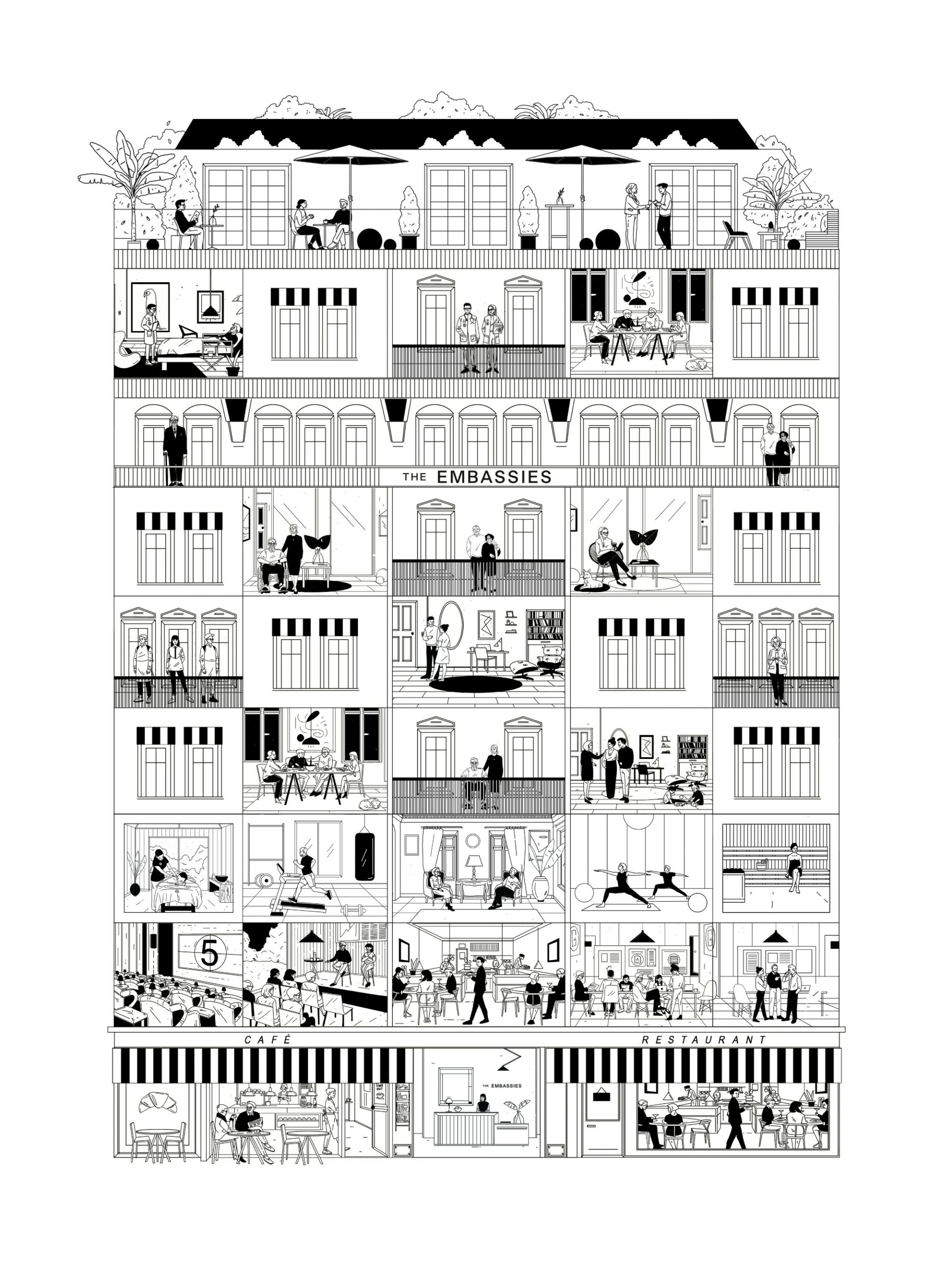 Την αναλαμβάνει μία συνεργάτιδά μας, από τις κορυφαίες διακοσμήτριες στον κόσμο, η Βρετανίδα Ιλς Κρόφορντ, για την οποία υπάρχει ένα πολύ ωραίο επεισόδιο στην σειρά ντοκιμαντέρ του Netflix “Abstract: The Art Of Design”. Πραγματικά καταλαβαίνει αυτό που θέλουμε να κάνουμε. Για εμάς, το όλο κόνσεπτ γεννήθηκε πάνω στην εμπειρία μου όταν είδα ότι η γιαγιά και ο παππούς μου έπρεπε να πάνε σε ένα γηροκομείο που ήταν μικρό και τόσο φριχτό που δεν ήθελα καν να τους επισκεφτώ όταν ήμουν παιδί. Χρειάστηκε να κάνω μια έρευνα να δω πώς είναι τα γηροκομεία σε ολόκληρο τον πλανήτη (είδα πάνω από 100 κοινότητες τέτοιου είδους). Η μεταβολή της δημογραφικής πυραμίδας υπέρ των ηλικιωμένων έκανε εύκολο το κέρδος γι’ αυτού του είδους τις «κοινότητες». Αλλά για εμάς ο άνθρωπος είναι στον πυρήνα κάθε αποφάσης που παίρνουμε. Και αυτό είναι ένα στοιχείο που κάνει το προϊόν μας να διαφέρει σε σχέση με ότι προσφέρεται «εκεί έξω» αυτή τη στιγμή, δεν υπάρχει κάτι παρόμοιο που να έχει αναπτυχθεί σε διεθνή κλίμακα. Στην Ελλάδα και συγκεκριμένα κοντά στη Θεσσαλονίκη υπάρχει ένας πολύ ωραίος χώρος αλλά δεν παύει να είναι ένας ωραίος χώρος αποκλειστικά για ηλικιωμένους. Εμείς δεν θέλουμε να κάνουμε ακόμα μια αλυσίδα γηροκομείων. Υπάρχουν χώροι στα κτήρια που ετοιμάζουμε, που είναι πολύ ελκυστικοί για ανθρώπους στα 30, 40 ή τα 50 τους. Έτσι μπαίνεις σε μία από τις “Embassies” και δεν έχεις μόνο ηλικιωμένους.
