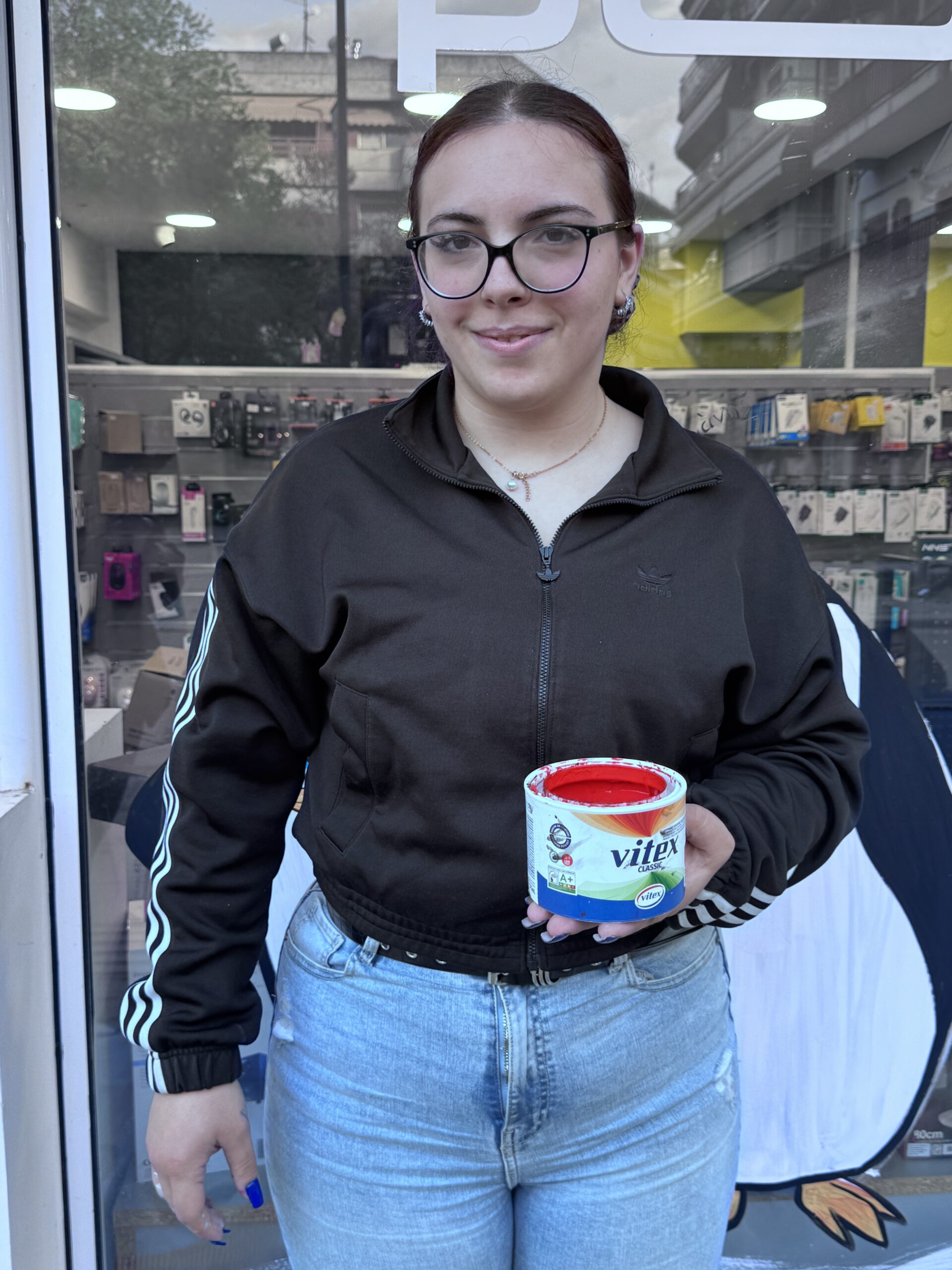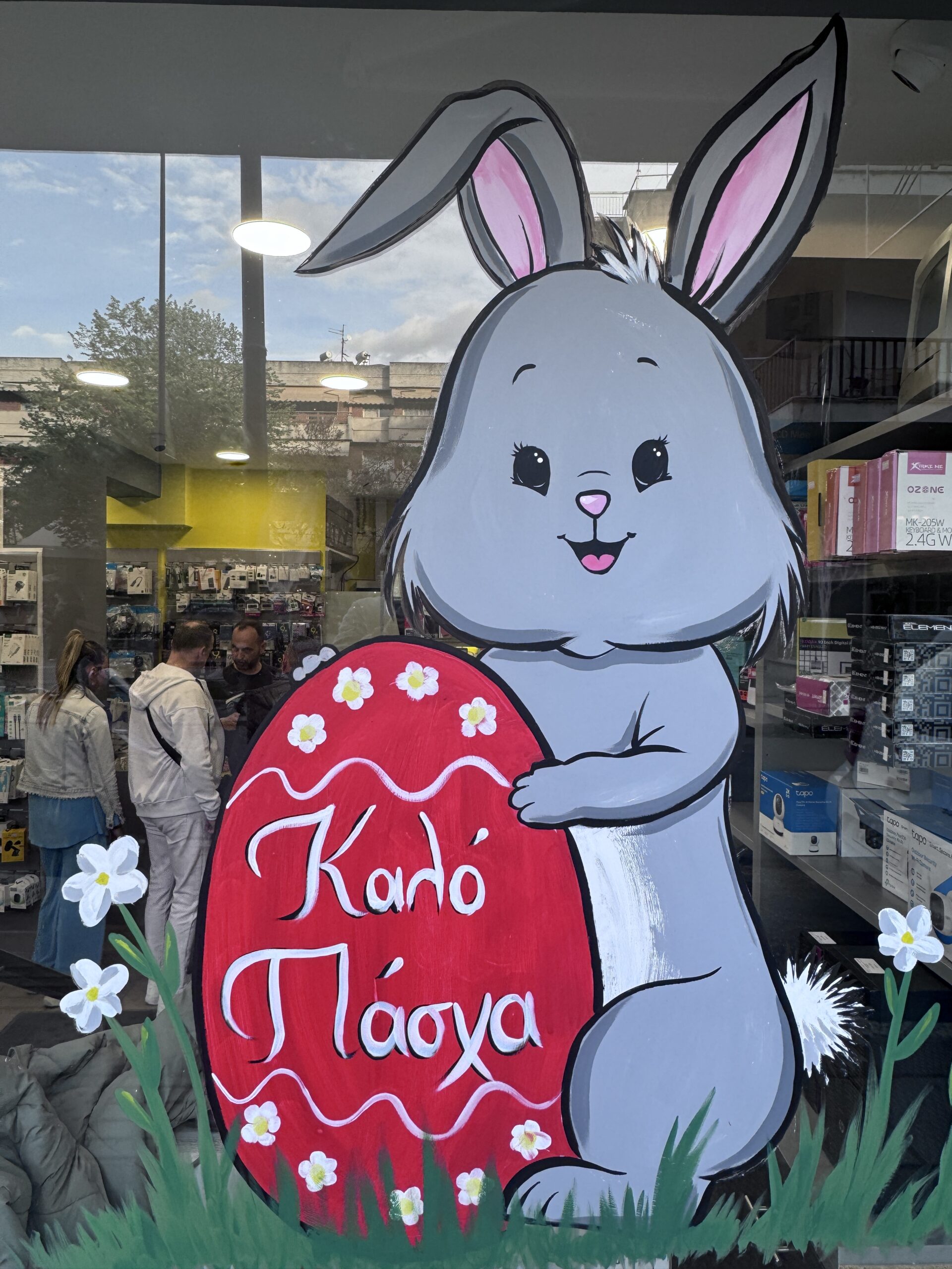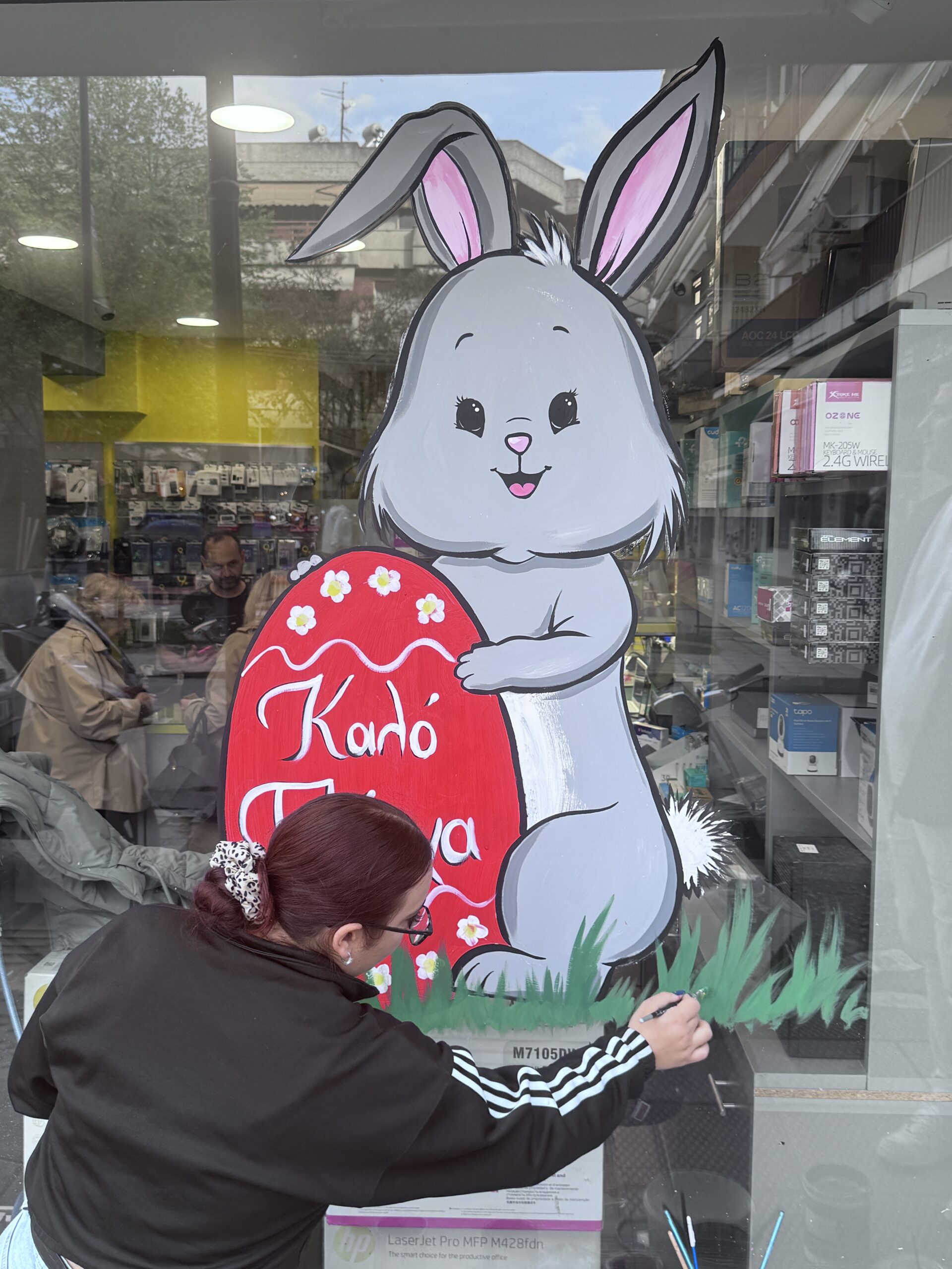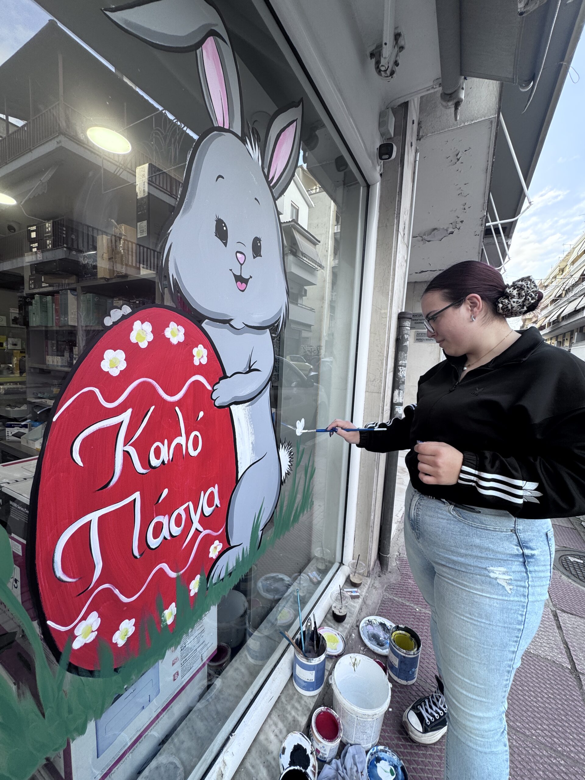 Αφού τελειώνει το σχέδιο στη βιτρίνα, που σχετίζεται με το Πάσχα, προτείνει να συνεχίσουμε τη συζήτησή μας σε ένα κοντινό καφέ. Ρωτώ τη Σταυρούλα πώς καταφέρνει να συνδυάζει τις σπουδές και την τέχνη της στην καθημερινότητά της. Η απάντησή της αποκαλύπτει μια πολυσχιδή προσωπικότητα. «Με τη δασκάλα μου από το φροντιστήριο, έμαθα να ζωγραφίζω στις βιτρίνες καταστημάτων, κυρίως καρτούν και εποχιακά σχέδια», αφηγείται με ενθουσιασμό. «Μου αρέσει να αλλάζω την όψη ενός καταστήματος, να του δίνω πνοή! Ανάλογα με την εποχή και τη διάθεση, ζωγραφίζω κάτι σχετικό».