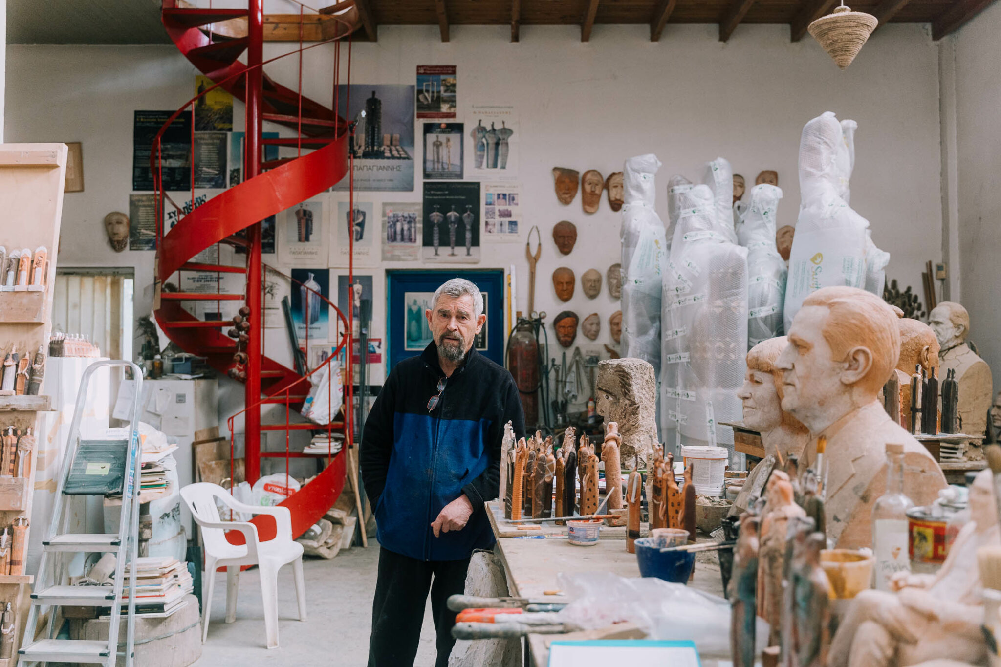 Είναι Τρίτη μεσημέρι. Έχουμε συνεννοηθεί από την προηγούμενη εβδομάδα ότι ανάλογα με το πρόγραμμα της ημέρας, θα είμαστε στο ατελιέ που διατηρεί στη Μεταμόρφωση Αττικής γύρω στις 2 το μεσημέρι. «Ελάτε ό,τι ώρα θέλετε. Εγώ θα είμαι όλη μέρα» μας είπε στο τηλέφωνο. Τα πράγματα πήγαν κατ’ευχήν και είμαστε συνεπείς. Πριν χτυπήσουμε το κουδούνι, μας έχει ήδη δει και κατεβαίνει για να συναντηθούμε. Η αλήθεια είναι ότι έχοντας επισκεφθεί πολλές φορές το μοναδικό αυτό μουσείο, υποπτευόμουν ότι ο χώρος που ο καλλιτέχνης δημιουργεί θα ήταν ένα ευρύχωρο ατελιέ με ψηλά ταβάνια και πολλά αντικείμενα. Πράγματι, είναι κάπως έτσι, ωστόσο έχει μία αύρα που δύσκολα μπορεί κανείς να μεταφέρει. Είναι επίσης αυτή η μοναδική αίσθηση που είσαι εκεί με το δημιουργό, ο οποίος είναι πρόθυμος ώστε να μιλήσει για το καθένα από αυτά τα έργα, να δείξει την τεχνική, να αστειευτεί, να πει τα πράγματα όπως έχουν.