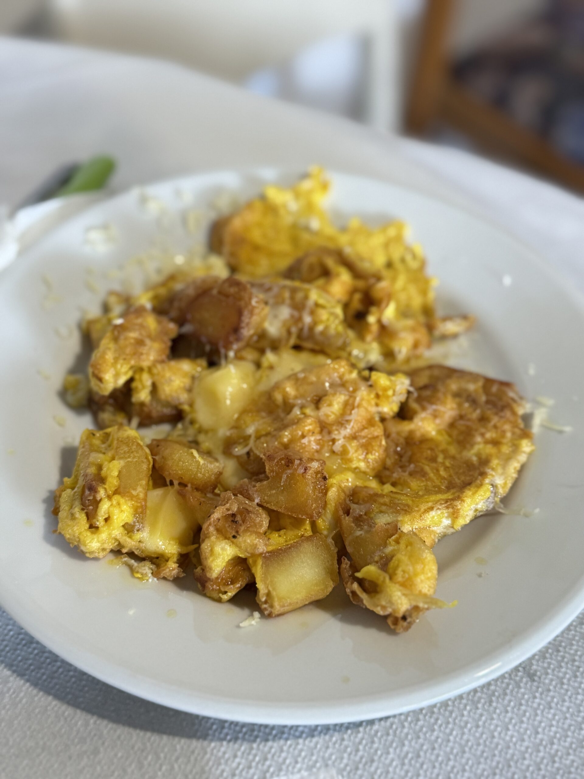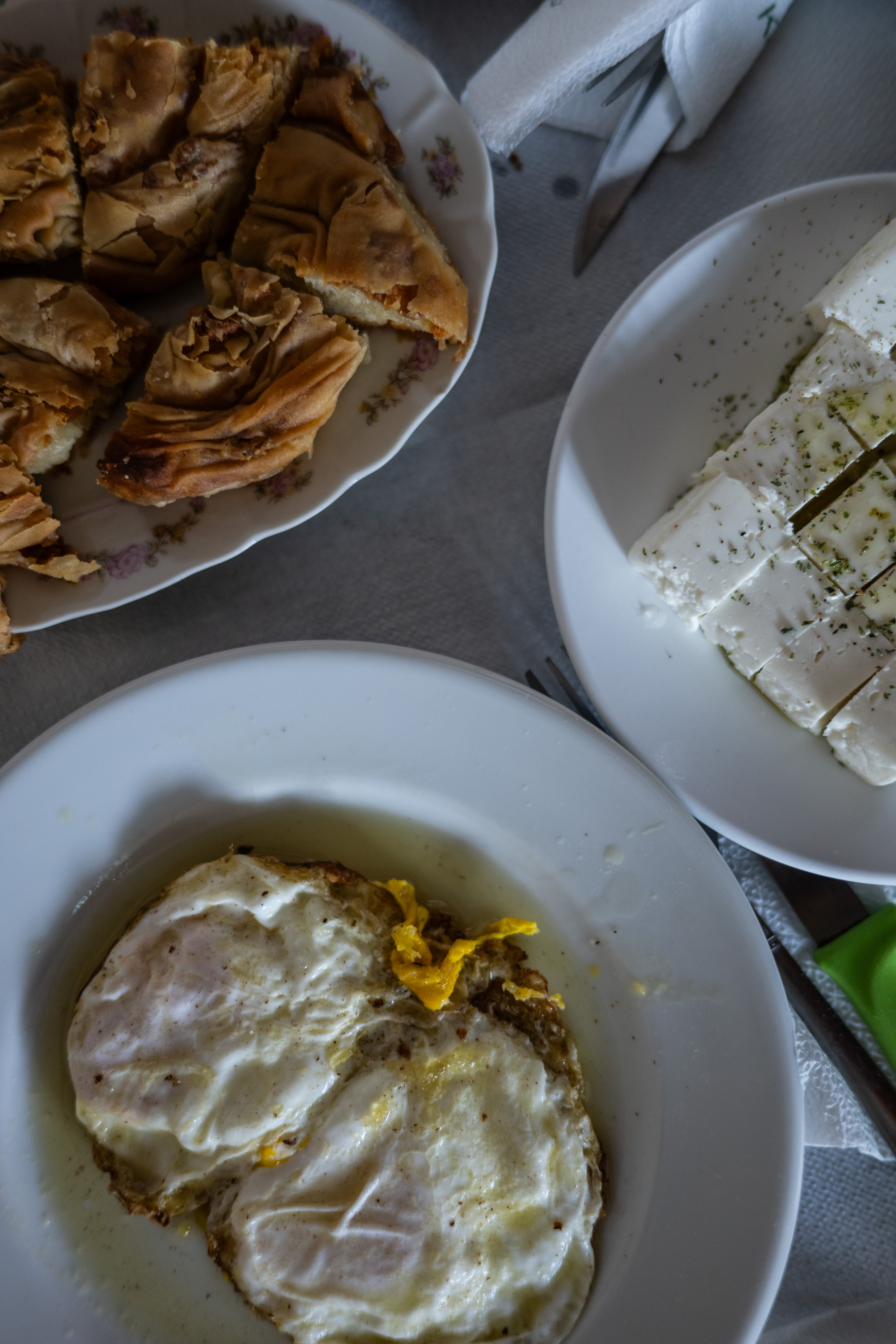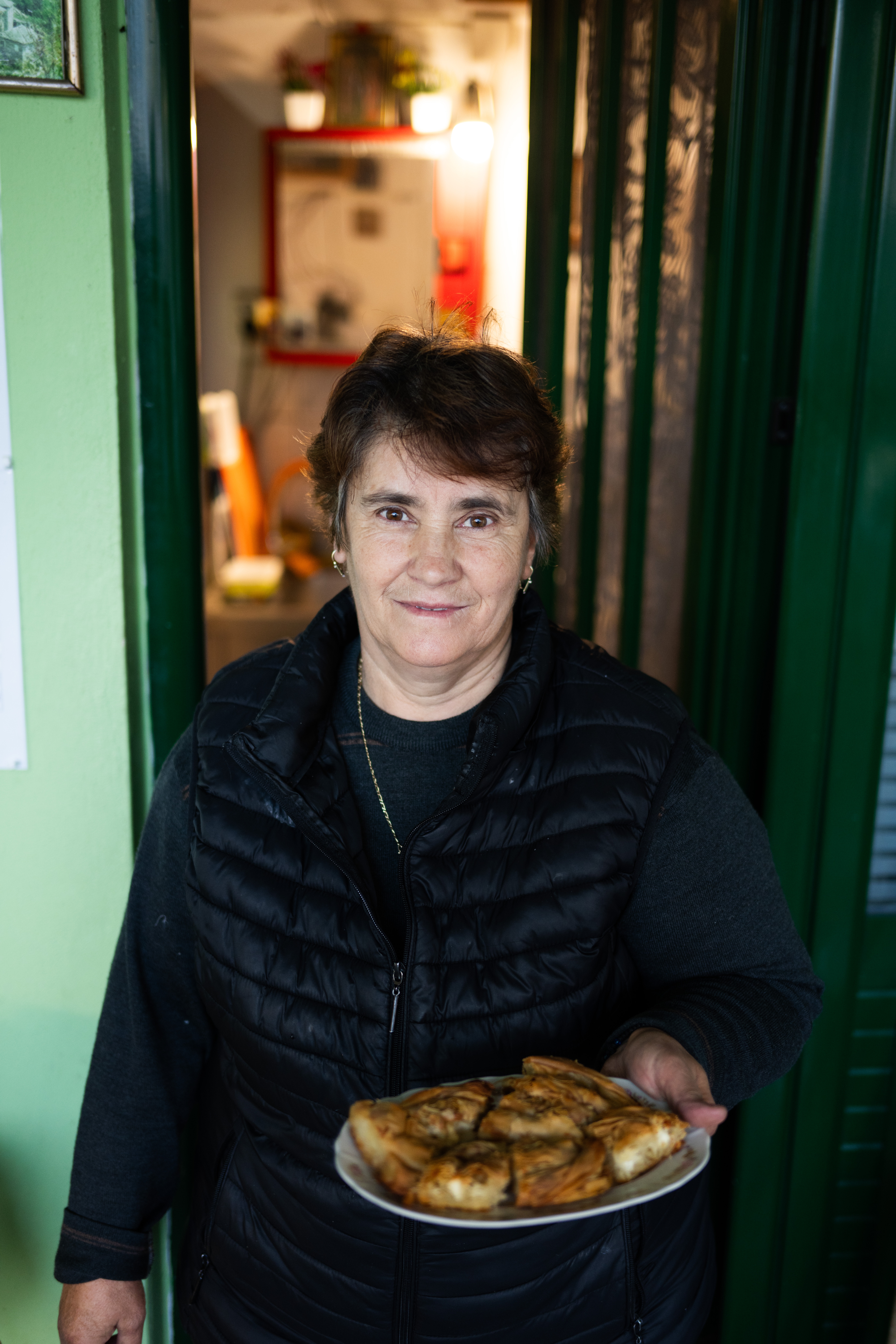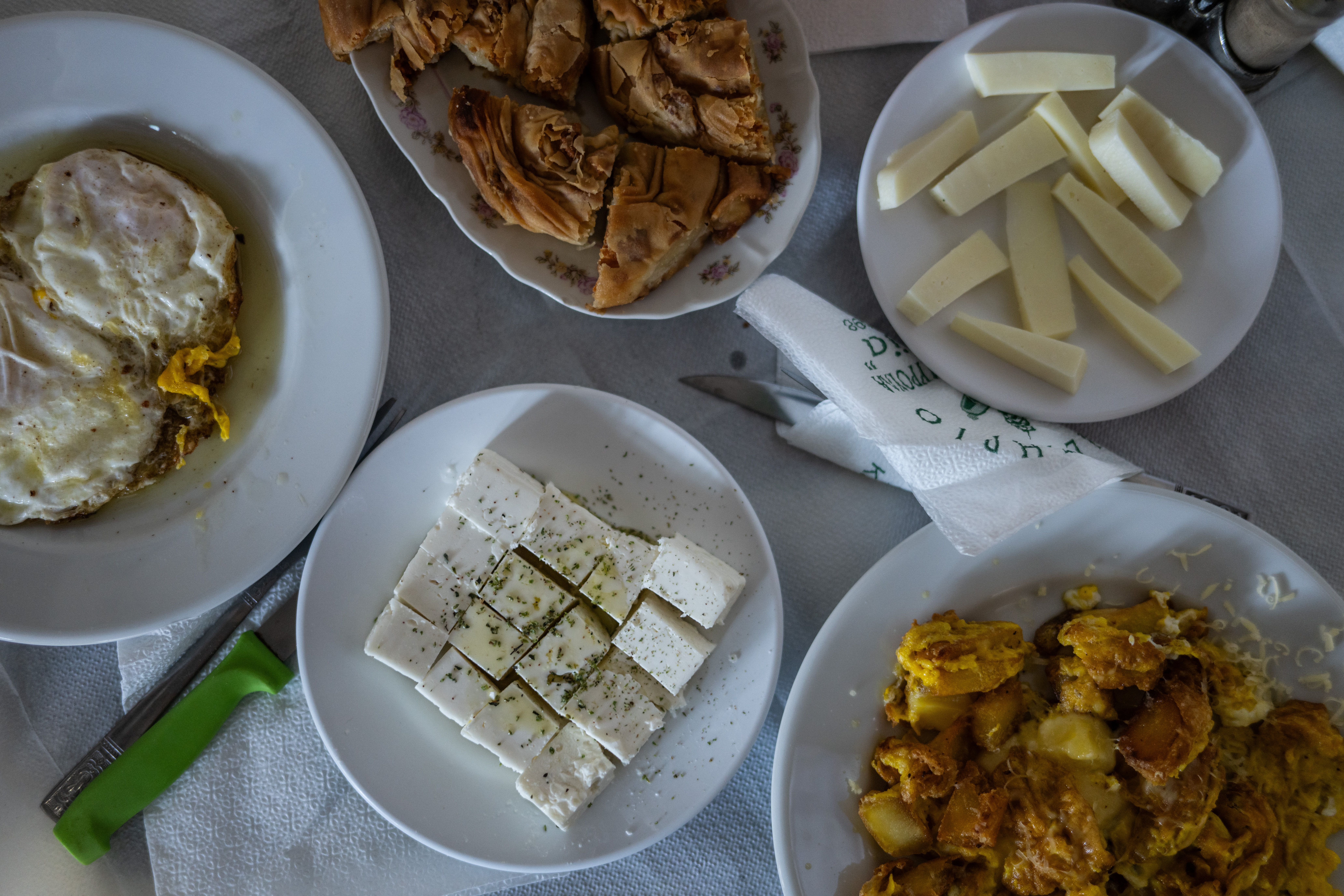 Τα αυγά από τις κότες που έχει στο δικό της κοτέτσι, τηγανίζονται σε ένα παλιό μαντεμένιο τηγάνι, με τον κρόκο τους να έχει ένα έντονο πορτοκαλί χρώμα που μαρτυρά την ελεύθερη βοσκή των πουλερικών. Η φέτα που μας σερβίρει είναι ένα αριστούργημα τυροκομικής τέχνης -στιβαρή αλλά κρεμώδης, με μια αλμυρή γεύση που αποκαλύπτει τα αρωματικά βότανα των ορεινών βοσκοτόπων. Το ζυμωτό ψωμί έχει μια τραγανή κόρα που κρύβει μια αφράτη ψίχα με έντονη γεύση προζυμιού. Η τυρόπιτα που ακολουθεί είναι ένα ακόμη δείγμα της μαγειρικής της δεξιοτεχνίας.