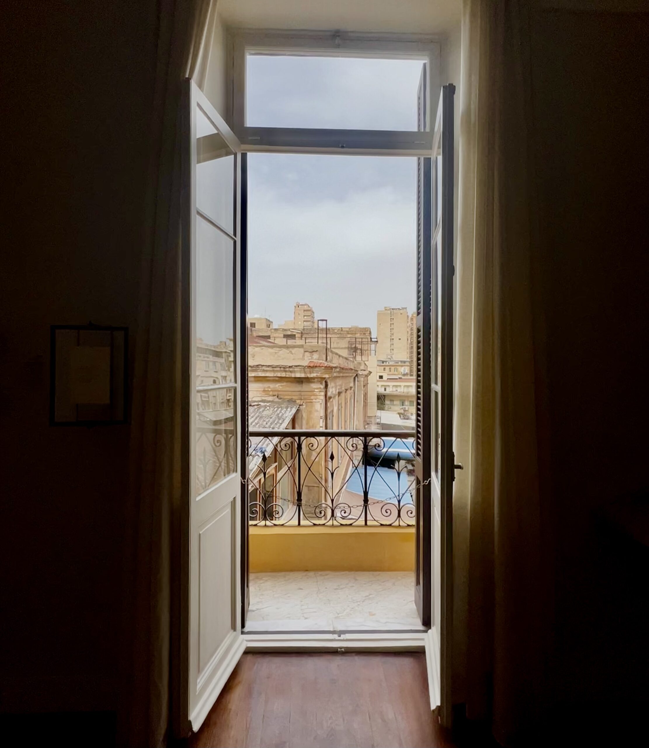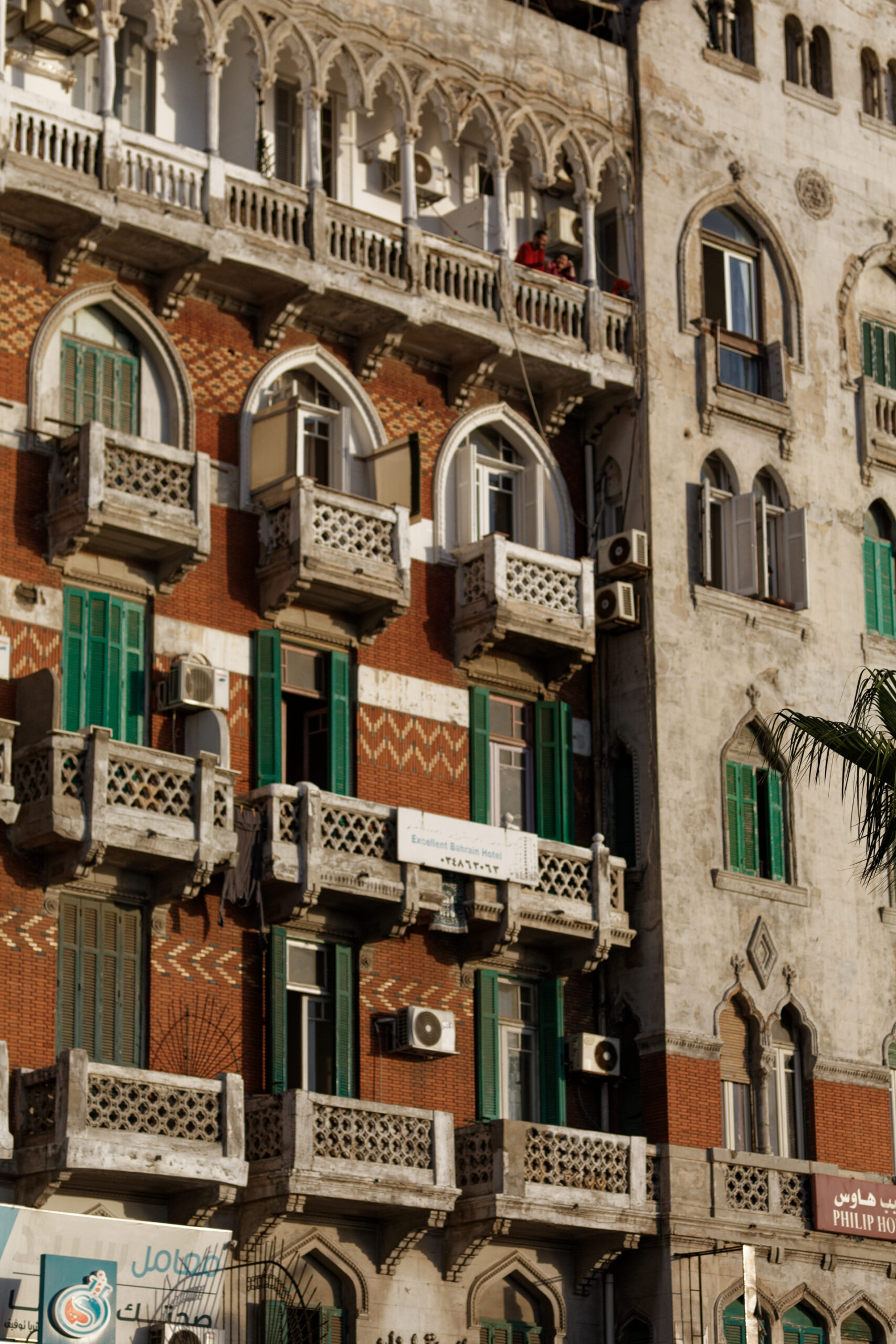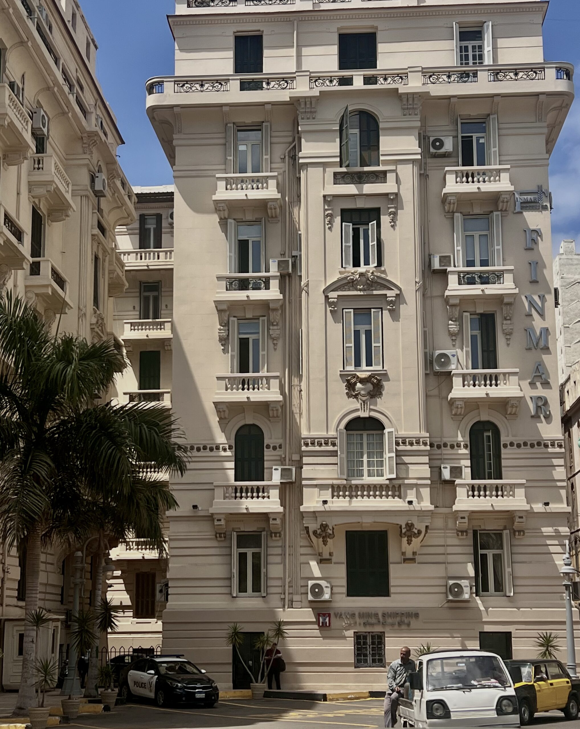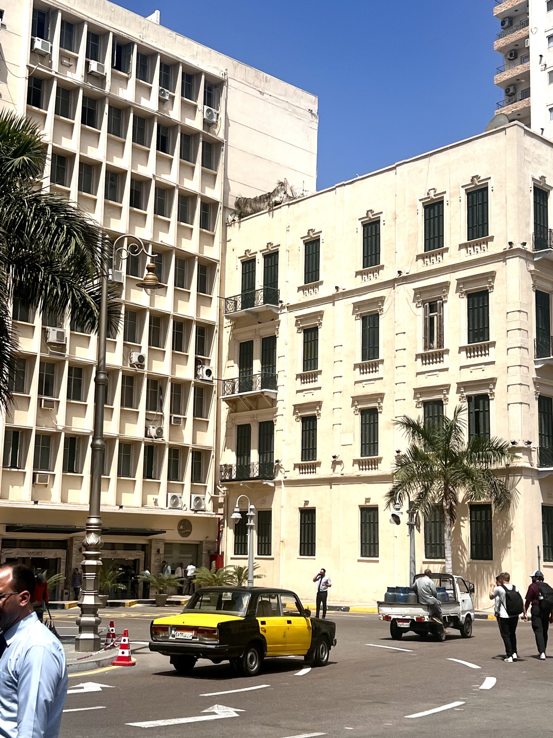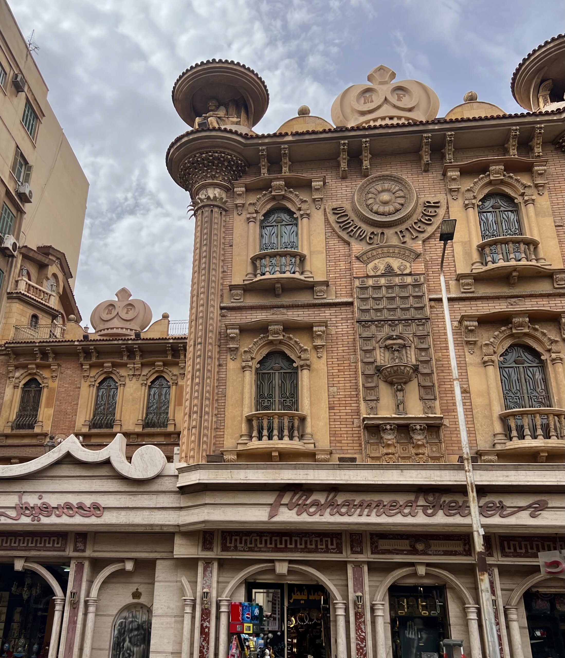 Εδώ είναι ακριβώς όπου συνδέεται το παρόν και το μέλλον του Καβάφη και της πόλης -«Και εβγήκα στο μπαλκόνι μελαγχολικά-βγήκα ν’ αλλάξω σκέψεις» όπως έγραφε ο ίδιος. Απέναντι ακριβώς από την οικία, υπάρχει ένα μικρό δρομάκι, στολισμένο ακόμα με τις πολύχρωμες κορδέλες από τη πρόσφατη γιορτή από το Ραμαζάνι με δυο υπέροχα καφέ. Μπαίνουμε στο πρώτο και κάθομαι στο πίσω δωμάτιο, μαζί με τις γυναίκες πίνοντας ένα ωραίο αραβικό καφέ-τον δικό μας ελληνικό-με κάρδαμο. Φεύγουμε από την άλλη πλευρά του δρόμου, αυτή που βγάζει στο άκρως εντυπωσιακό μπαρόκ κτίριο Μοχάμεντ Φίτερ (Mohamed Fieter), ένα σπάνιας αρχιτεκτονικής αξίας κτήριο που δεσπόζει στην περιοχή.