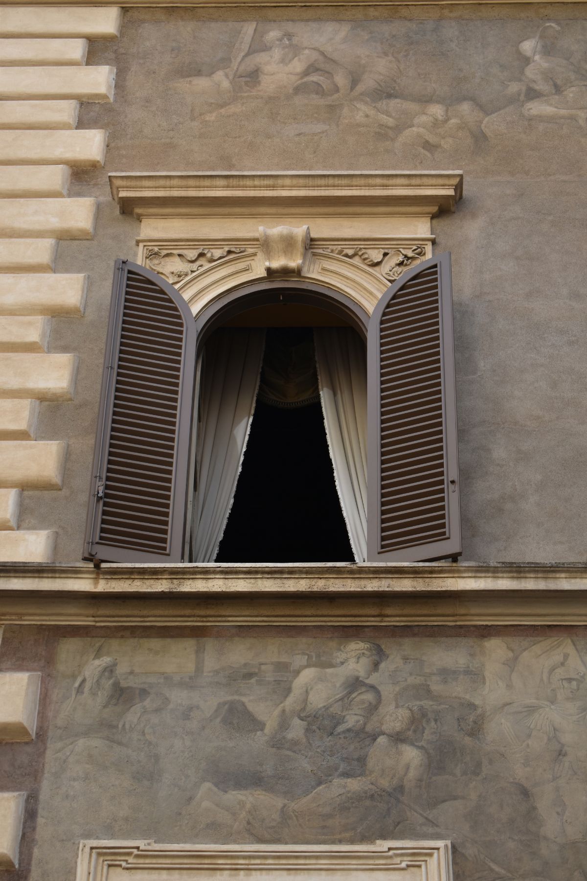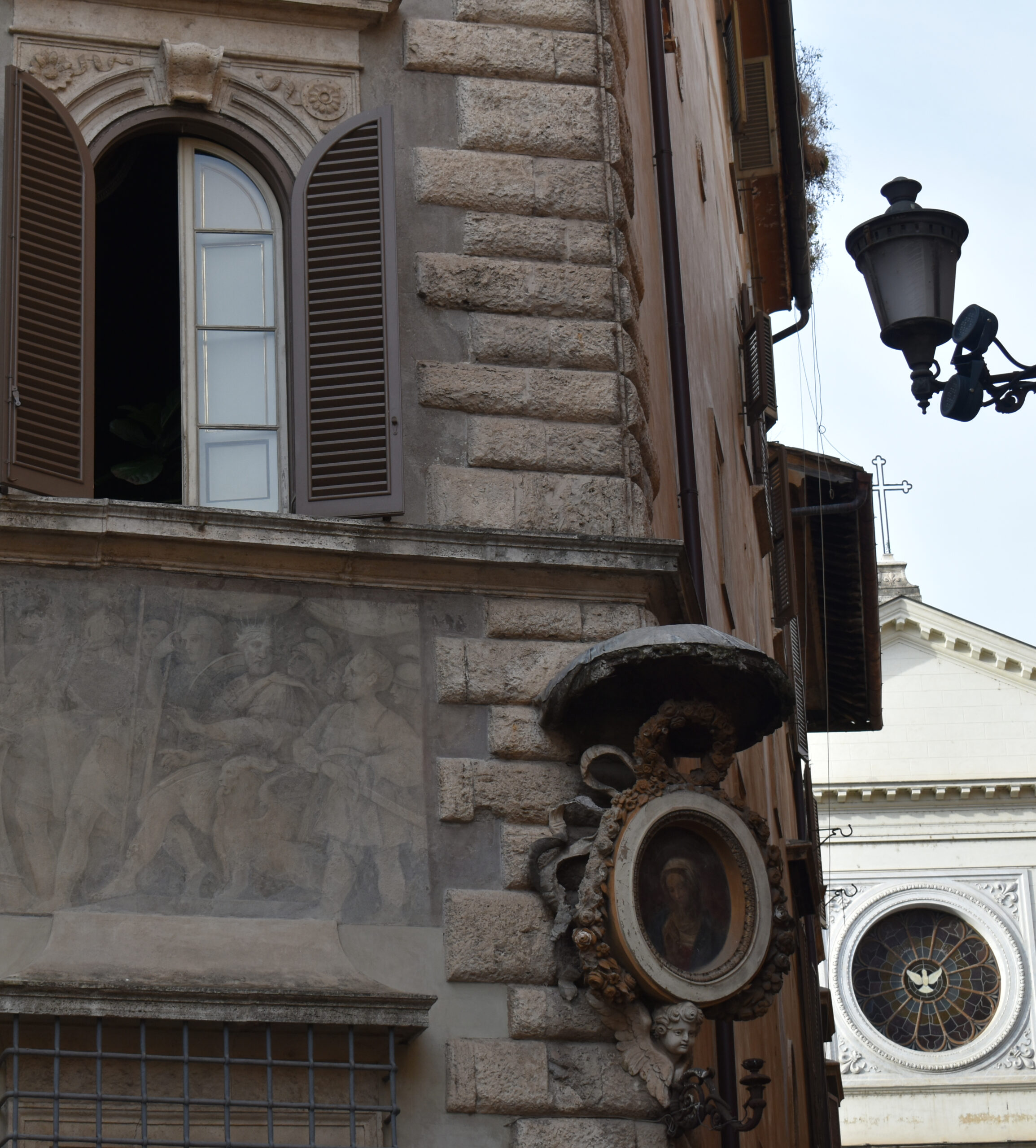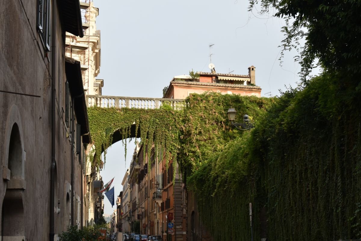 Προχωρήστε λίγο ακόμη και κοιτάξτε προς τα πάνω για να μη χάσετε την μικρή αψιδωτή και καλυμμένη με κισσό γέφυρα, μέρος ενός ανολοκλήρωτου σχεδίου του Μιχαήλ Άγγελου που θα συνέδεε τις δύο ιδιοκτησίες των Farnese εκατέρωθεν του Τίβερη: το Palazzo Farnese και τη Villa Farnesina. Το σχέδιο δεν υλοποιήθηκε ποτέ, αλλά το μοναδικό τμήμα που ολοκληρώθηκε, το Arco Farnese, εξακολουθεί να συνδέει τη Via Giullia με το Palazzo Farnese. Περάστε κάτω από τη γέφυρα και θα συναντήσετε μια μικρή κρήνη με την παράξενη μορφή μιας αρχαίας μάσκας. Είναι η μαρμάρινη Fontana del Mascherone, που χρηματοδοτήθηκε από τον οίκο των Farnese, προκειμένου να έχει πόσιμο νερό ο λαός.