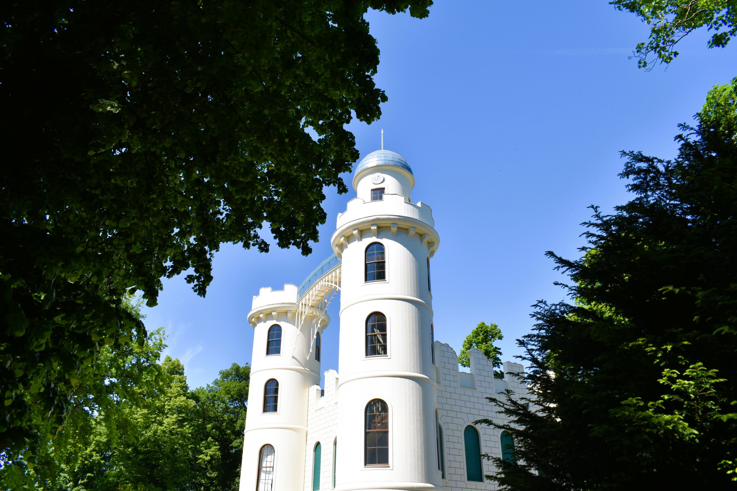 Και βέβαια δε νοείται επίσκεψη στο Pfaueninsel, χωρίς μια δόση από τα παραμυθένια κτήριά του, ιδίως το κατάλευκο παλάτι του ερωτευμένου ζεύγους που μοιάζει να βγήκε από ταινία της Disney. Την εποχή αυτή τόσο το μικρό ανάκτορο Schloss Pfaueninsel, όσο και το γοτθικό Kavalierhaus ανακαινίζονται με εντατικούς ρυθμούς, μπορείτε όμως να ξαποστάσετε στη σκιά τους, παρατηρώντας την εμπνευσμένη -και σαν από θαύμα άθικτη από τους βομβαρδισμούς- αρχιτεκτονική τους. Μόλις ανοίξουν και πάλι, στο μεν πρώτο θα έχουν αποκατασταθεί οι εκπληκτικά διακοσμημένες αίθουσες της Κόμισσας Lichtenau, ενώ στο δεύτερο θα περιμένουν τους επισκέπτες οι κάδοι αρμέγματος και τα ξύλινα σκεύη με το ανάγλυφο μοτίβο των παγωνιών, όπου η ίδια η Κόμισσα έφτιαχνε βούτυρο.