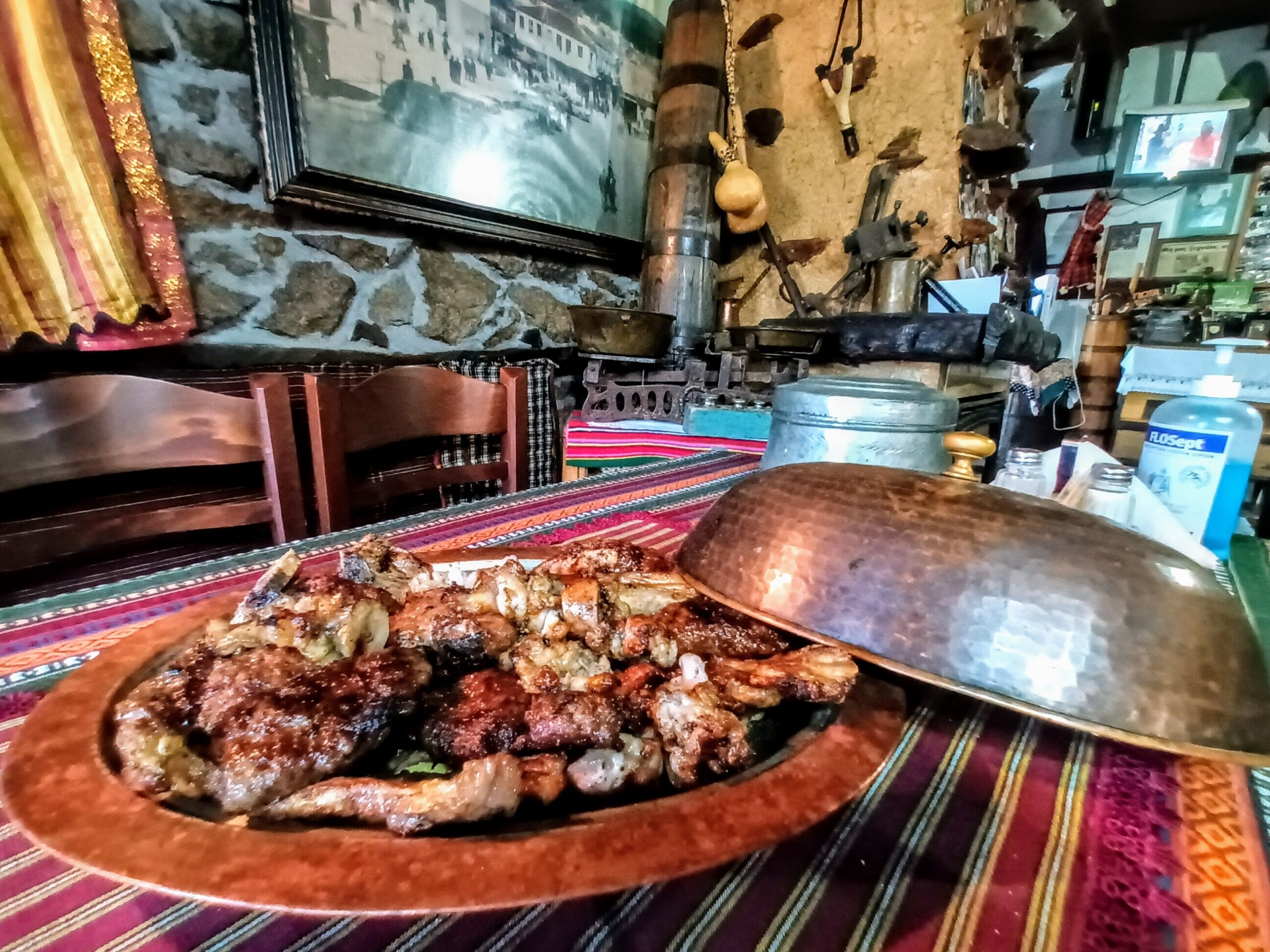 Στο ισόγειο λειτουργεί η ταβέρνα, με έντονο παραδοσιακό χρώμα. Στους τοίχους οικογενειακά κειμήλια, υφαντά, κιλίμια και φωτογραφίες. Παλιά έπιπλα, μπακίρια, πομακικές φορεσιές. Από την ανοιχτή κουζίνα, με μυρωδιές που προδιαθέτουν ευχάριστα, η Μουσγιέν, ετοιμάζει με αγάπη και μεράκι τα συνταγές και πιάτα βασισμένα σε πατροπαράδοτες ντόπιες συνταγές.