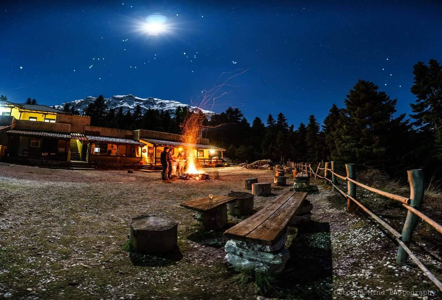 Εκεί, σε ένα ειδυλλιακό περιβάλλον σε υψόμετρο 1.300 μέτρων, ακριβώς κάτω από τα βουνά και ανάμεσα στα δέντρα, ο Μπάμπης και η Πόλα, οι άνθρωποι που λειτουργούν το καταφύγιο, προσφέρουν καφέ, σνακ και φαγητά ημέρας. Αν ο καιρός είναι καλός, καθίστε έξω για να απολαύσετε τη θέα, αλλιώς επιλέξτε τον εσωτερικό χώρο με τη μεγάλη σόμπα και τις τζαμαρίες.